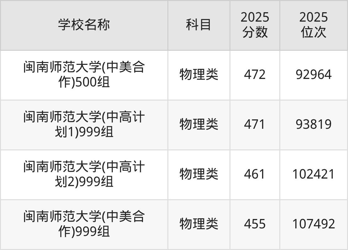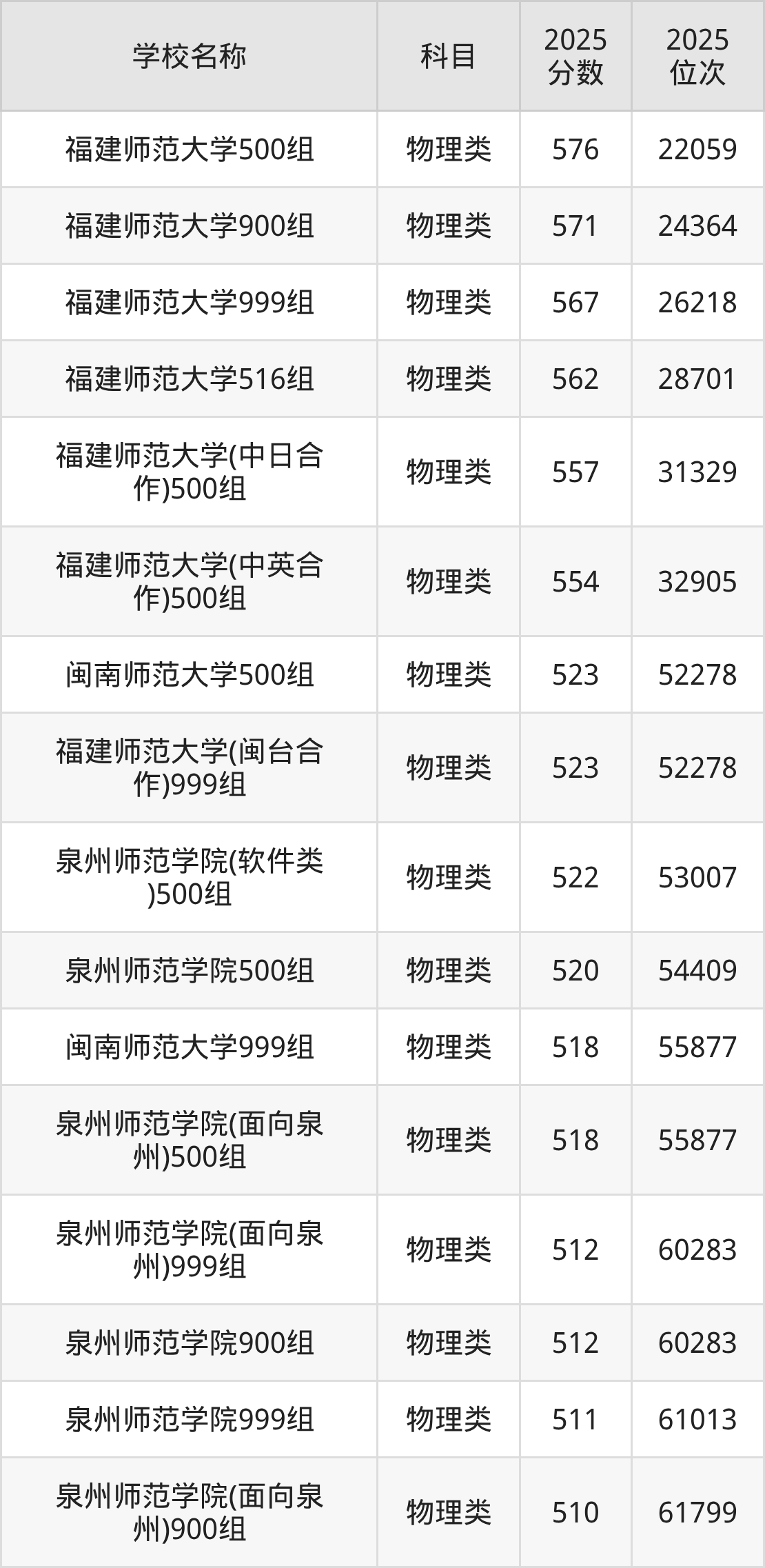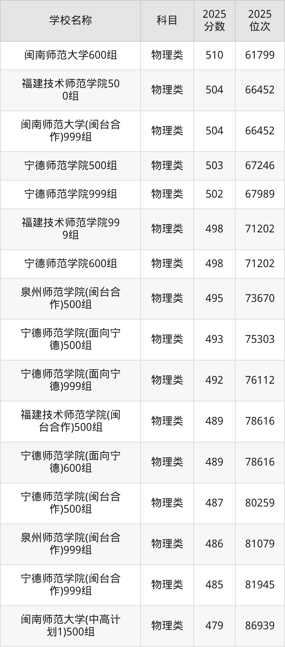 下文为2025年福建省师范类大学在福建物理类录取分数线和位次排名表,供大家参考: