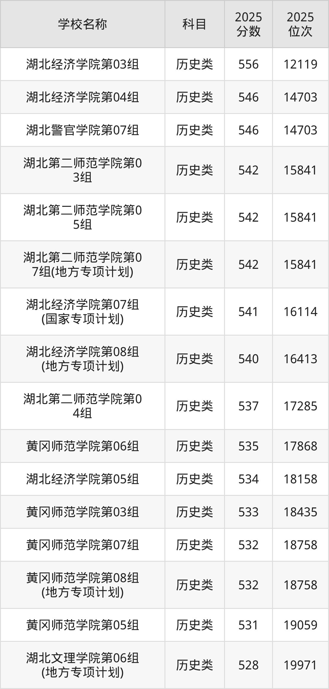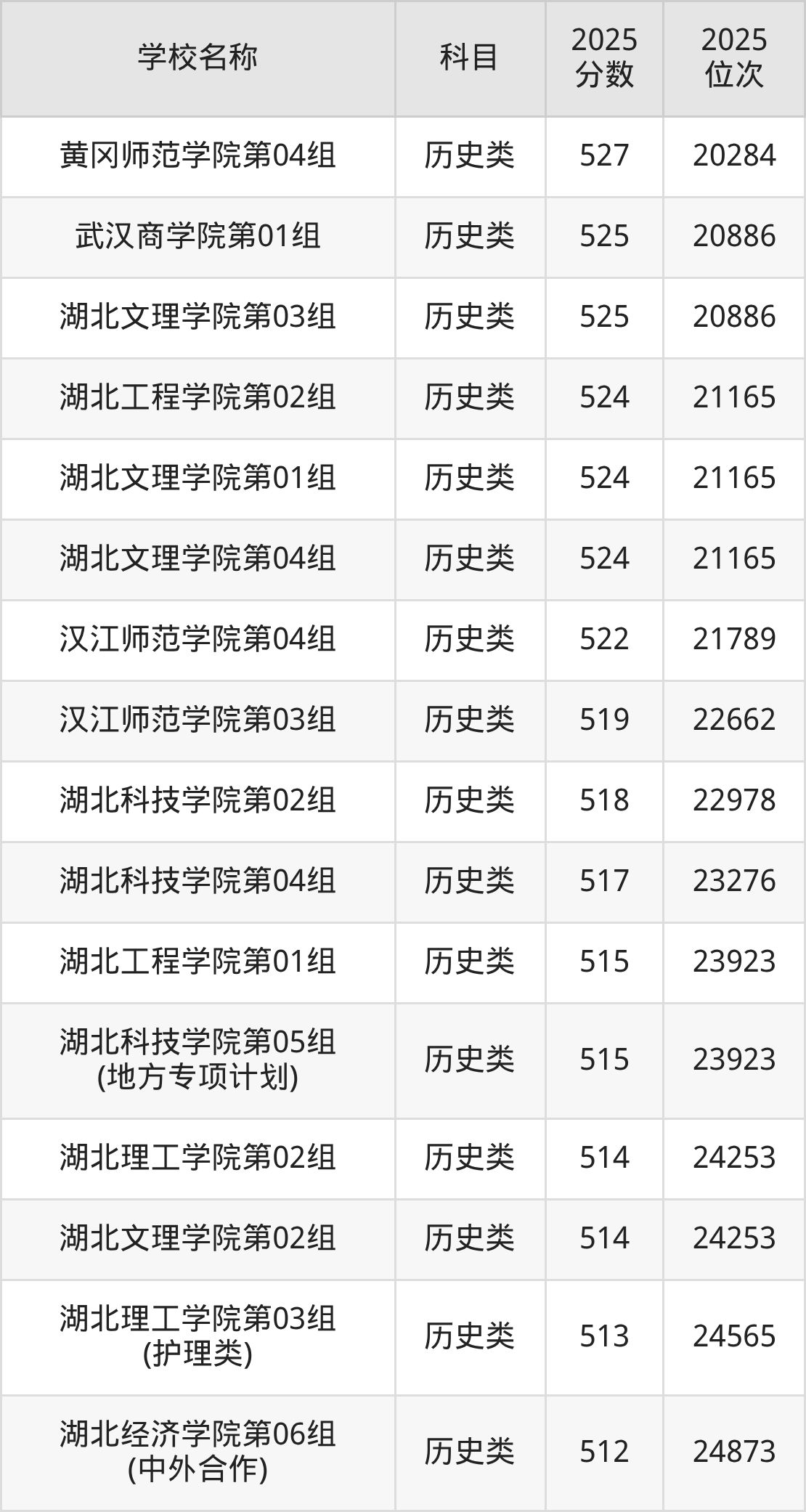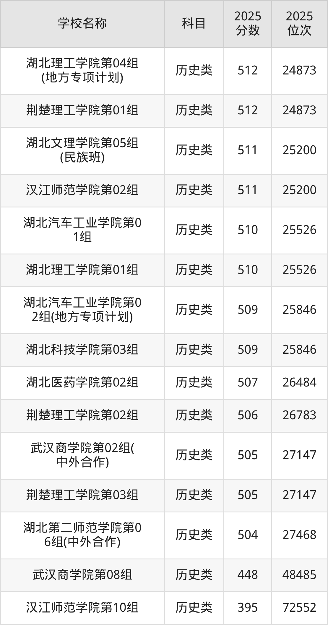下文为2025年湖北省公办二本大学在湖北历史类录取分数线和位次排名表,供大家参考: