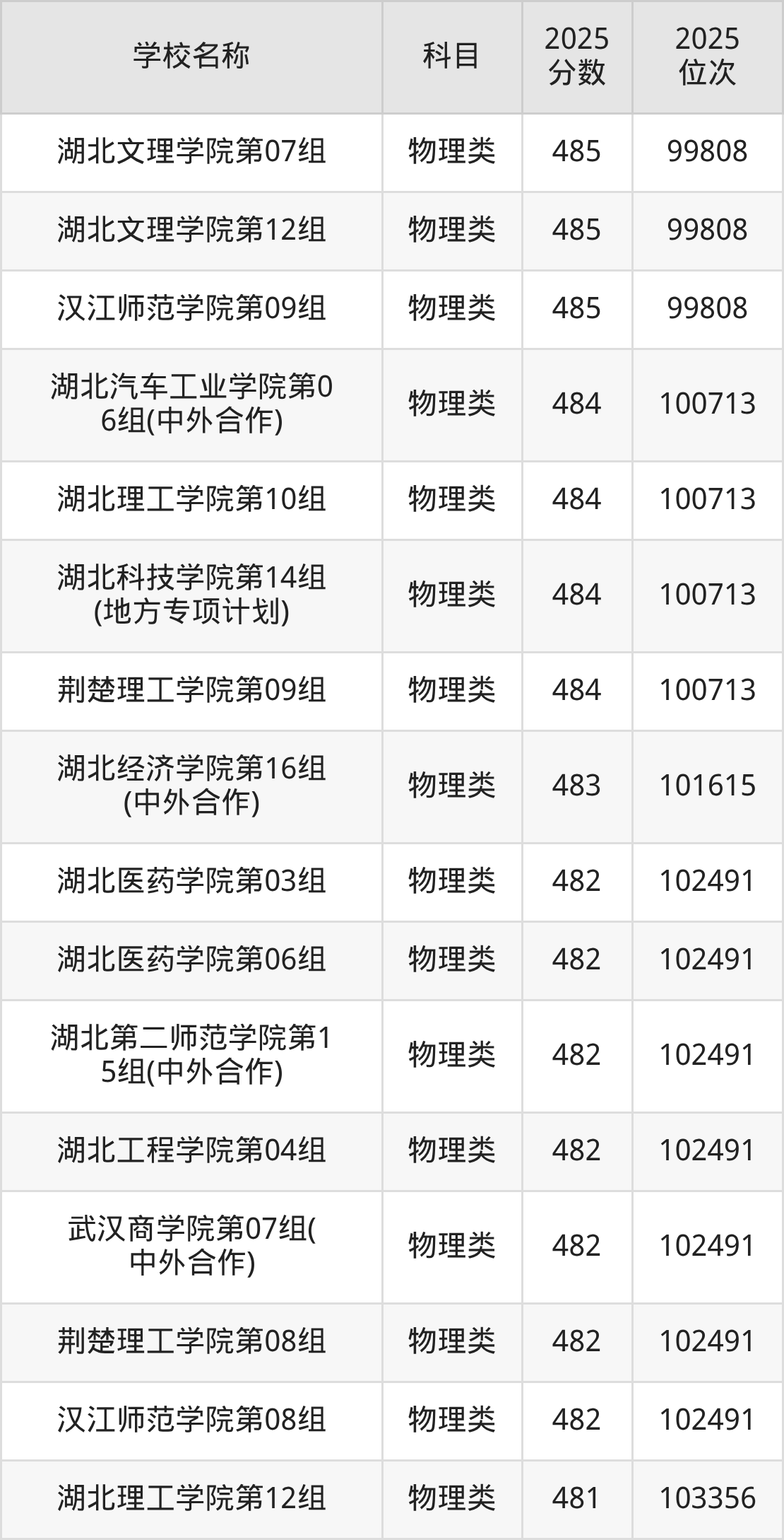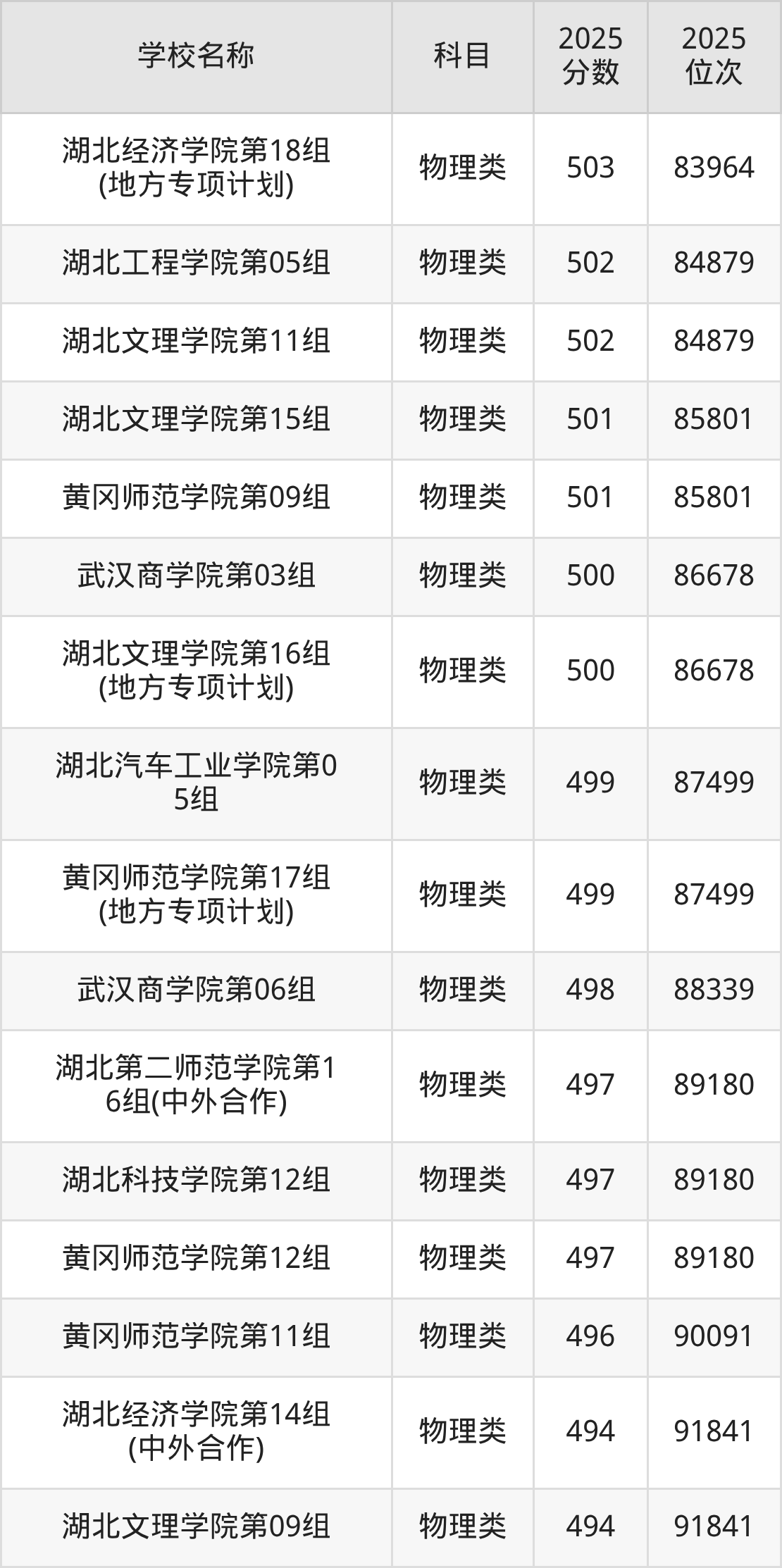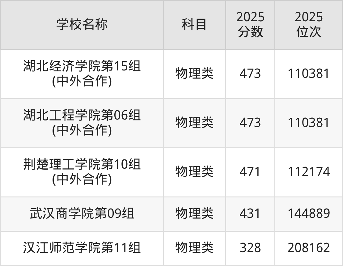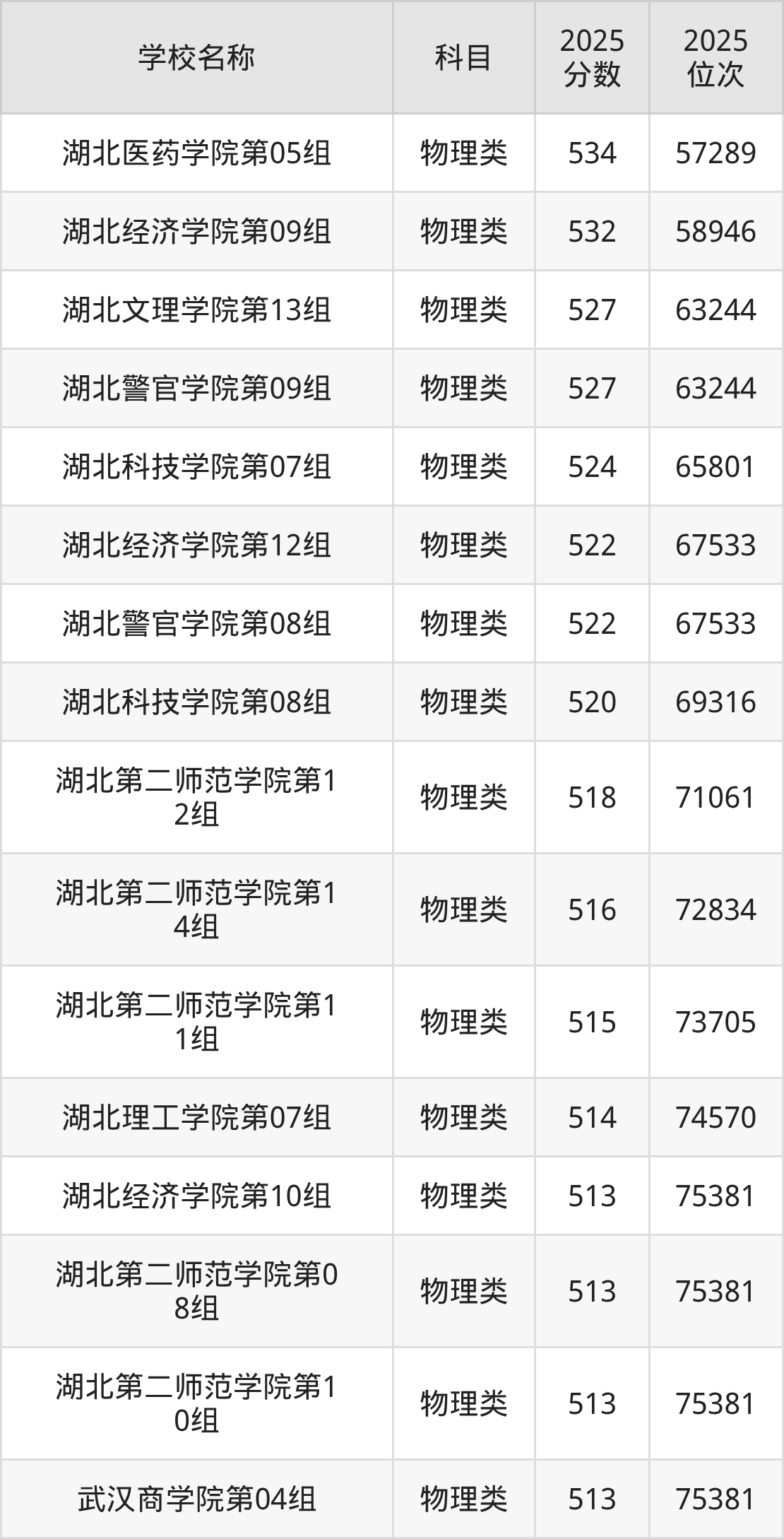 下文为2025年湖北省公办二本大学在湖北物理类录取分数线和位次排名表,供大家参考: