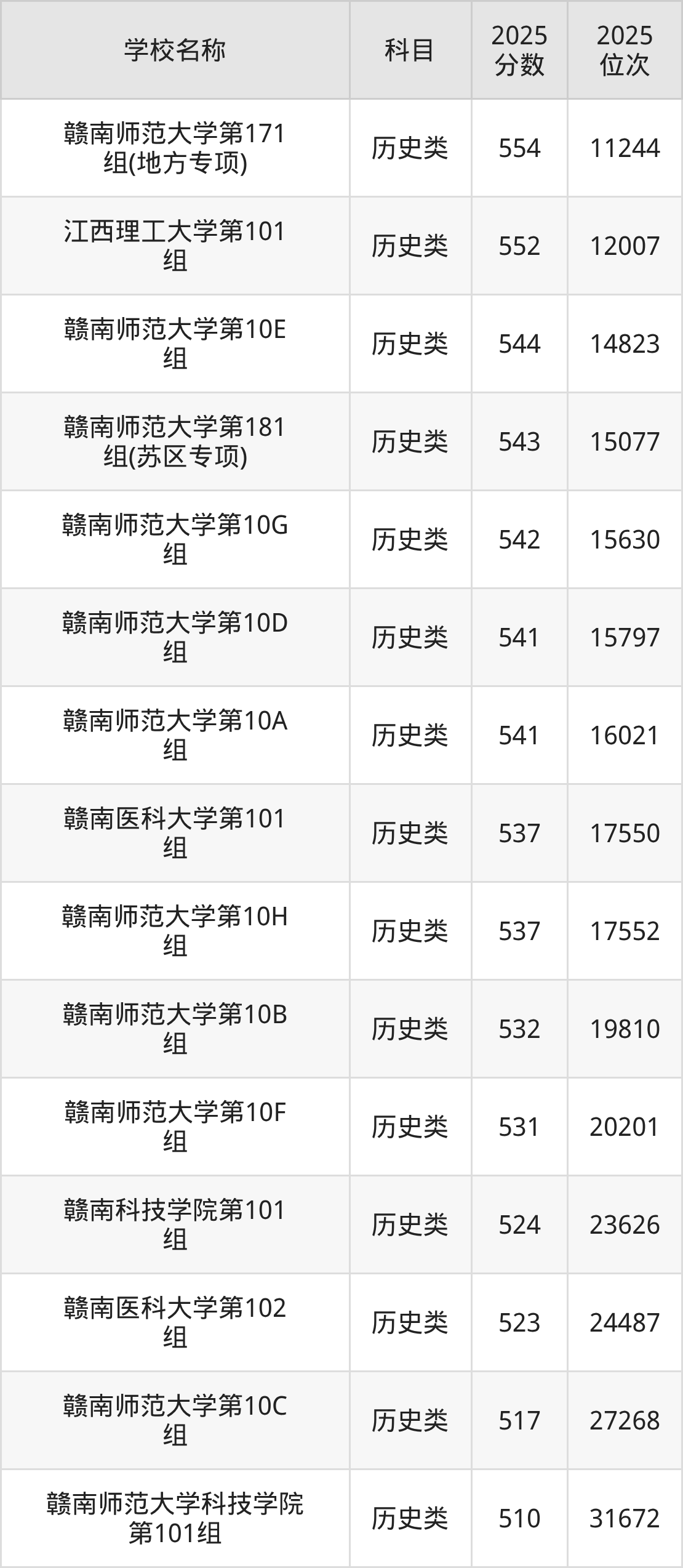 下文为2025年赣州市本科大学在江西历史类录取分数线和位次排名表,供大家参考: