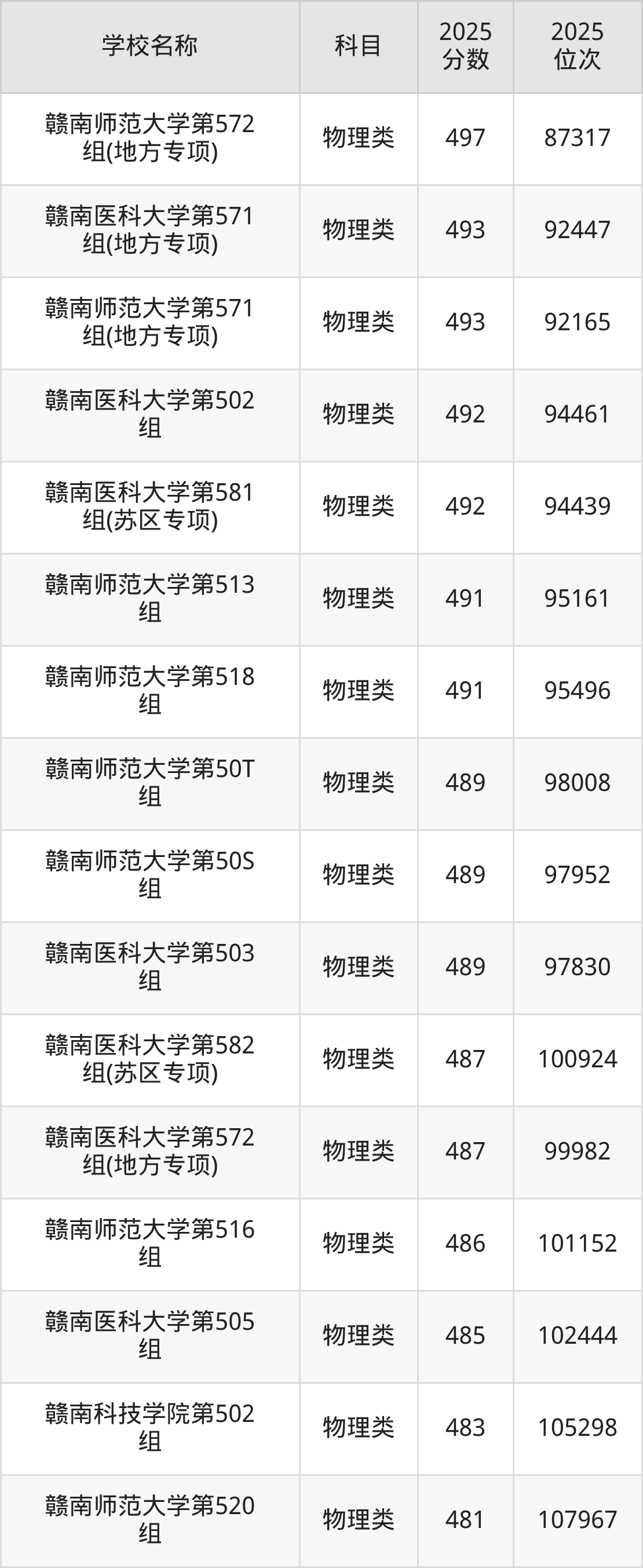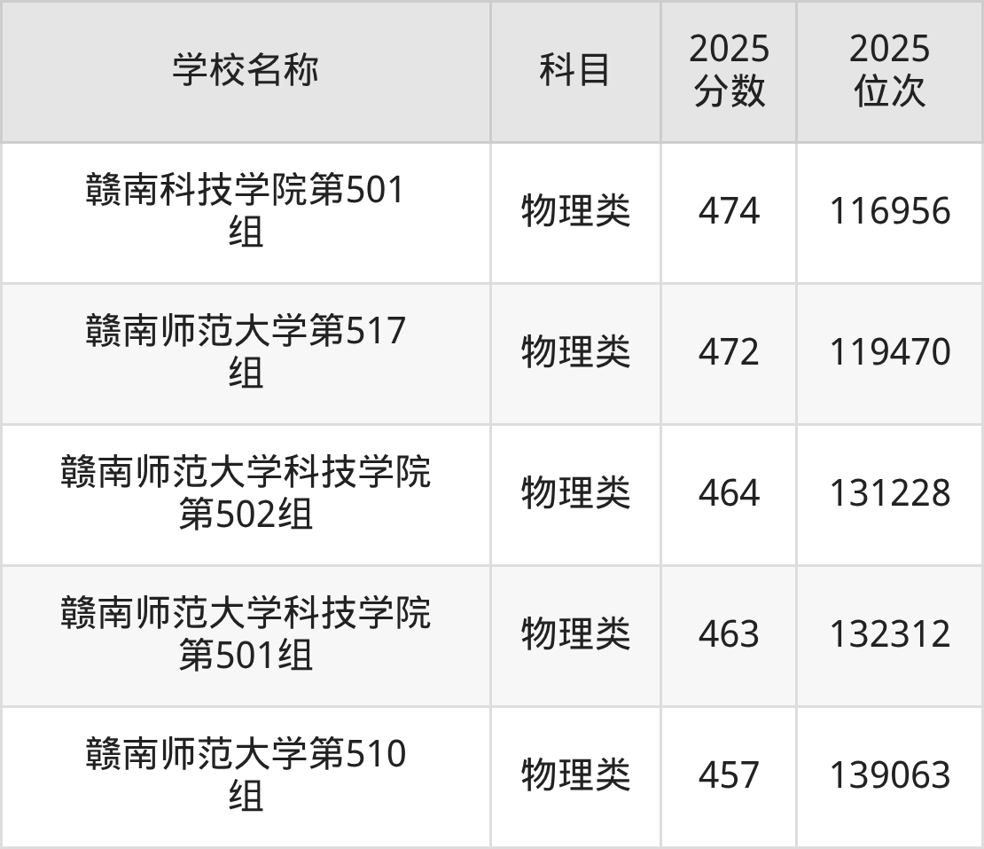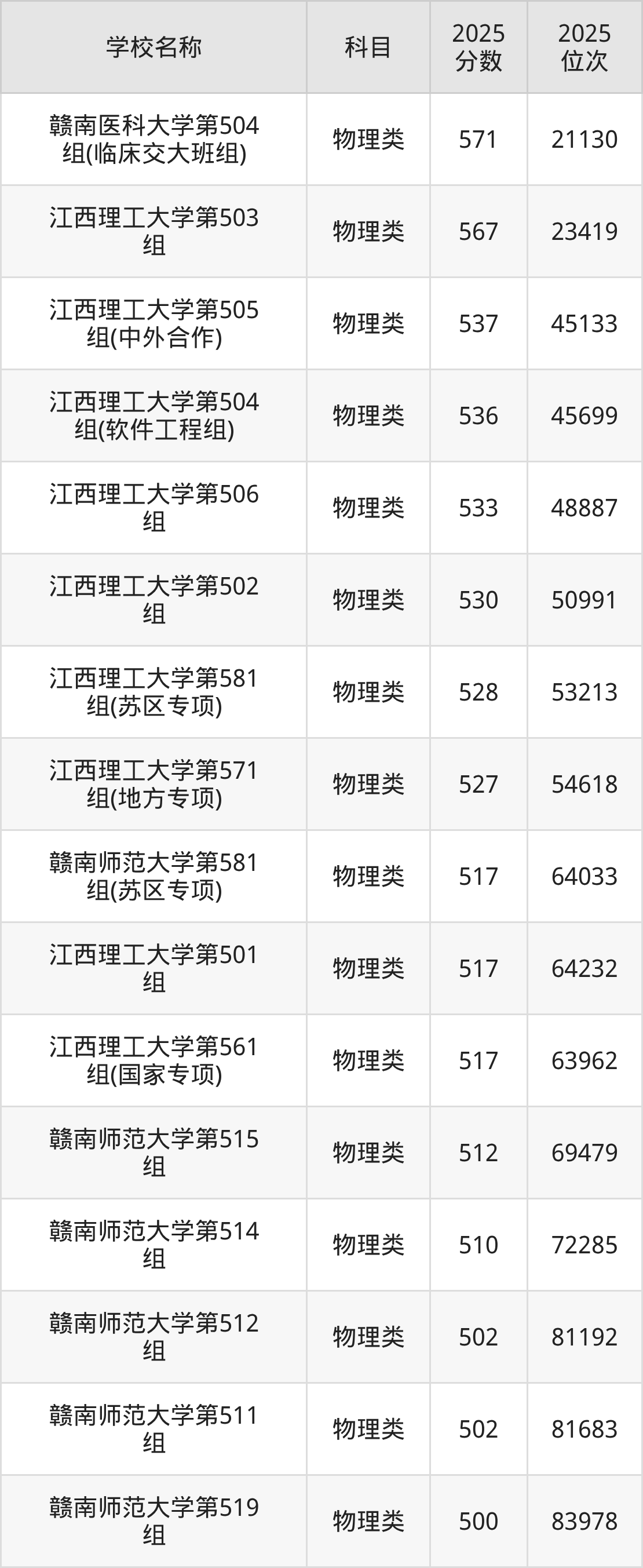 下文为2025年赣州市本科大学在江西物理类录取分数线和位次排名表,供大家参考: