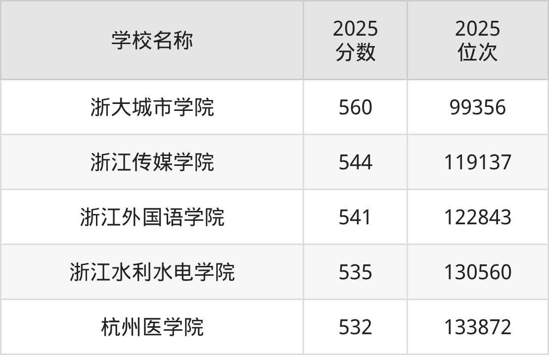 下文为2025年杭州市公办二本大学在浙江录取分数线和位次排名表,供大家参考: