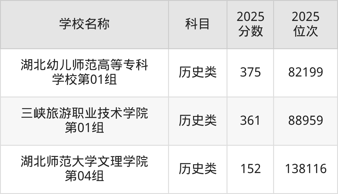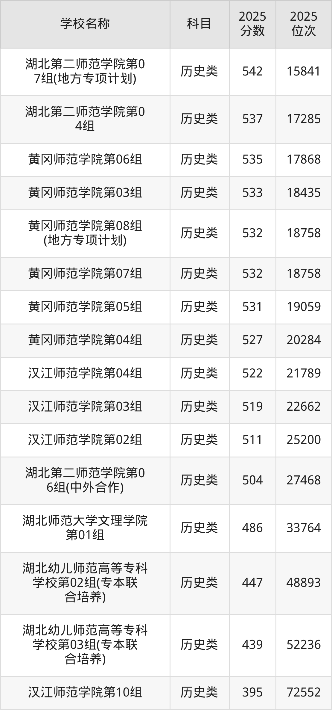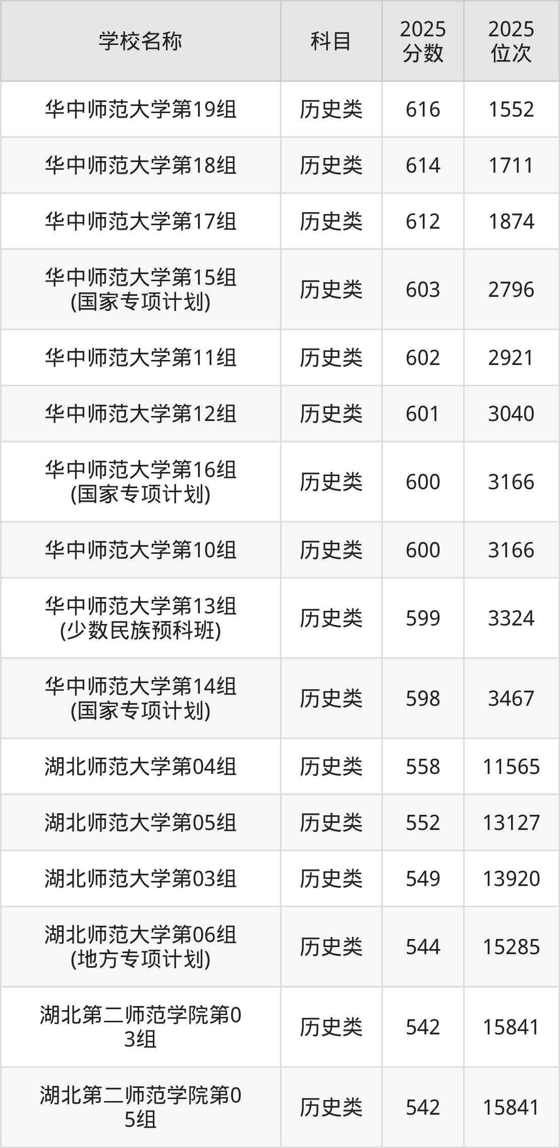 下文为2025年湖北省师范类大学在湖北历史类录取分数线和位次排名表,供大家参考: