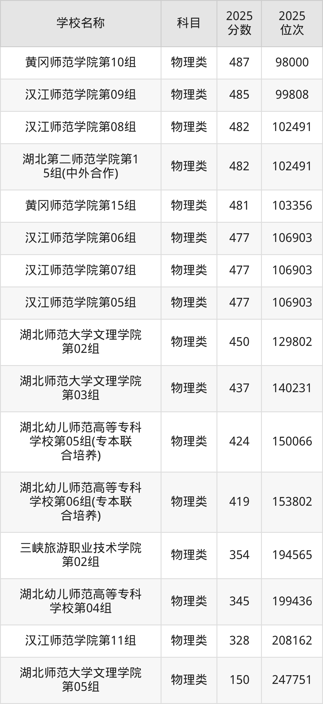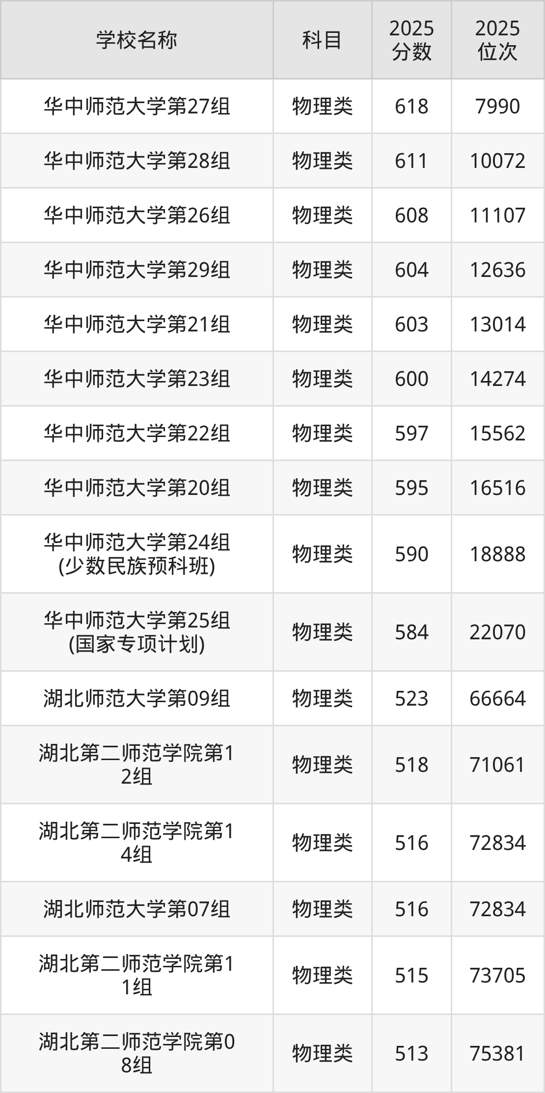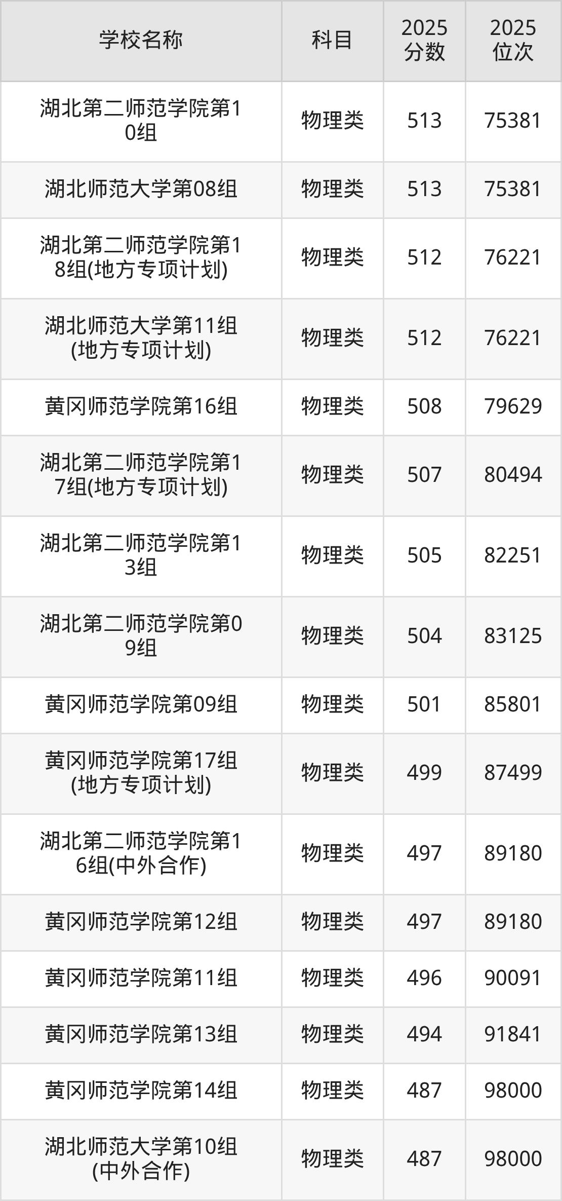 下文为2025年湖北省师范类大学在湖北物理类录取分数线和位次排名表,供大家参考:
