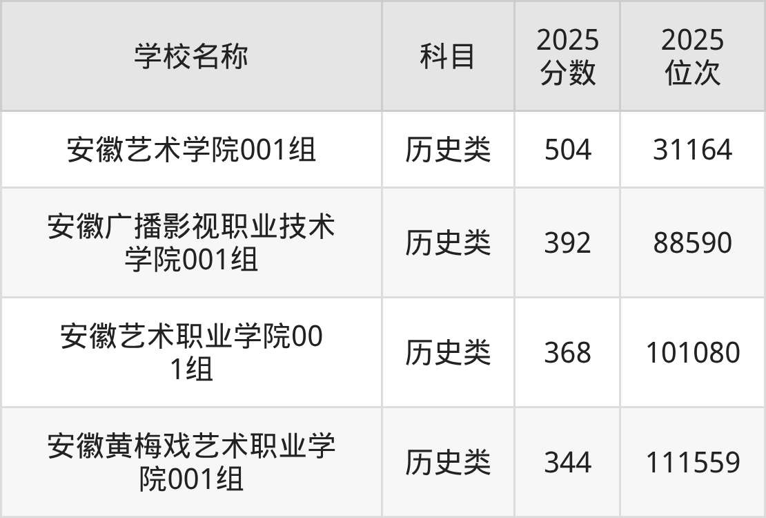 下文为2025年安徽省艺术类大学在安徽历史类录取分数线和位次排名表,供大家参考: