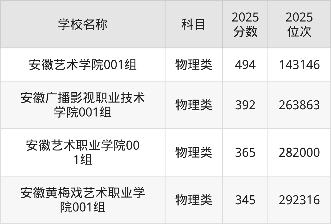 下文为2025年安徽省艺术类大学在安徽物理类录取分数线和位次排名表,供大家参考: