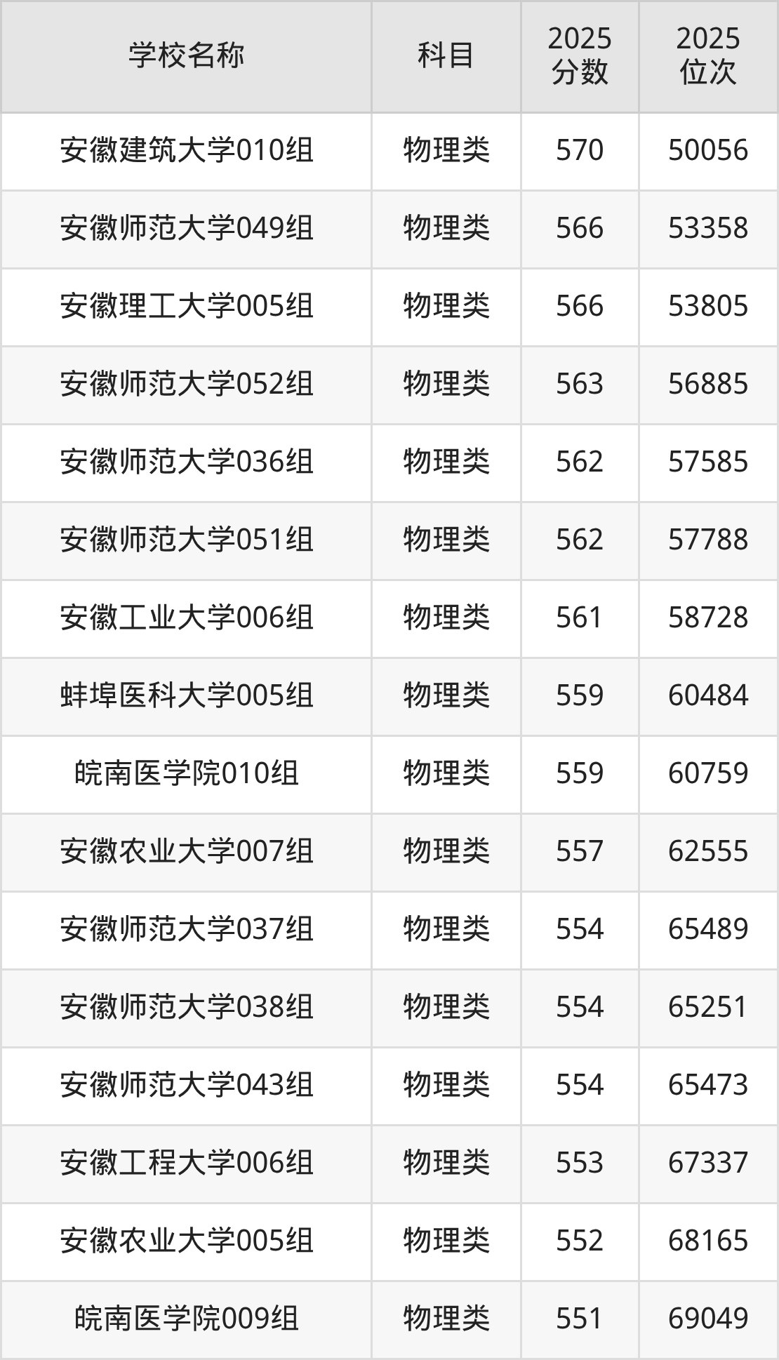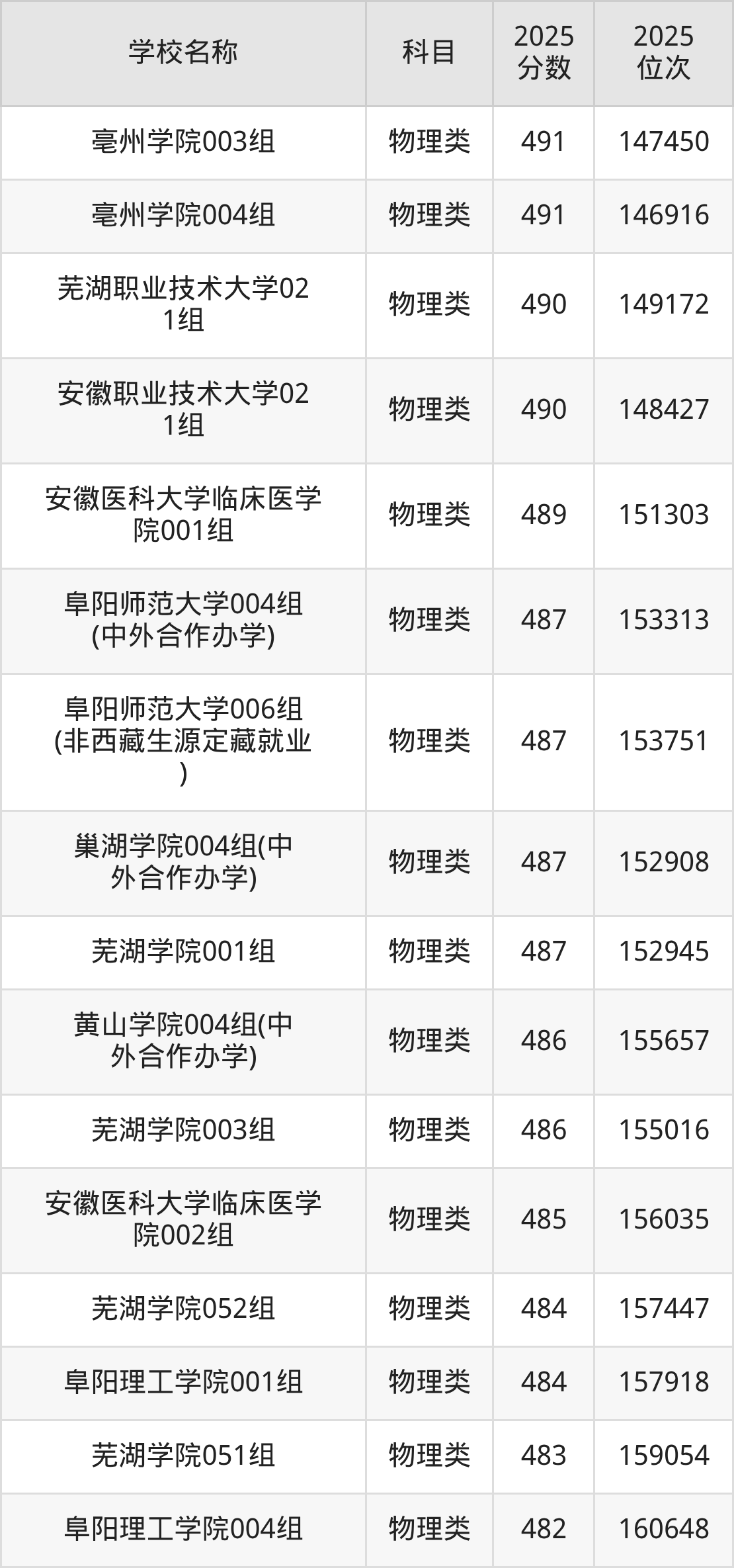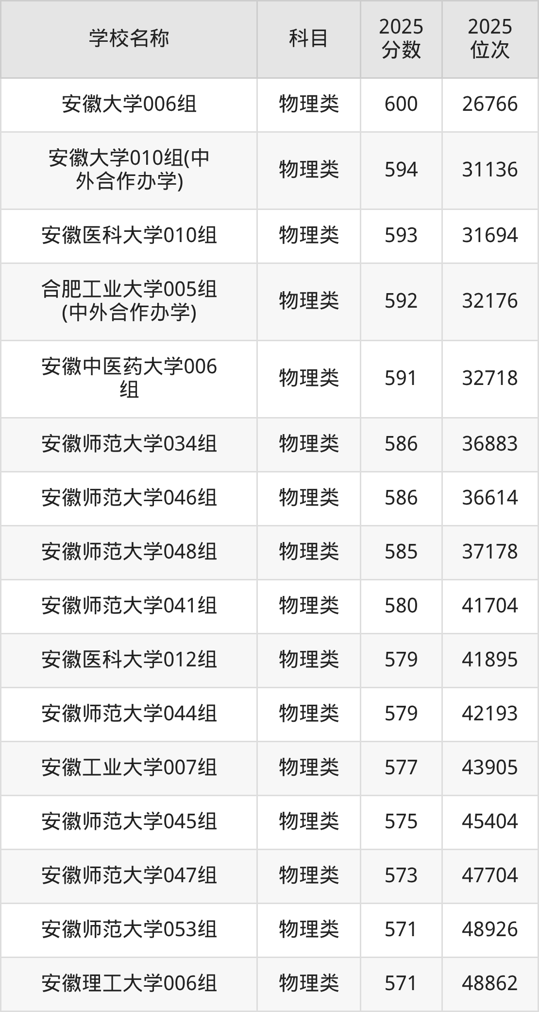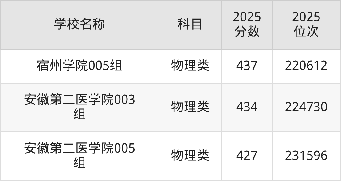 下文为2025年安徽省本科大学在安徽物理类录取分数线和位次排名表,供大家参考: