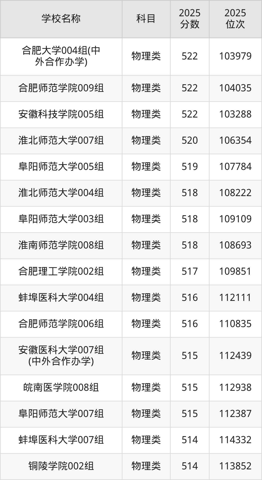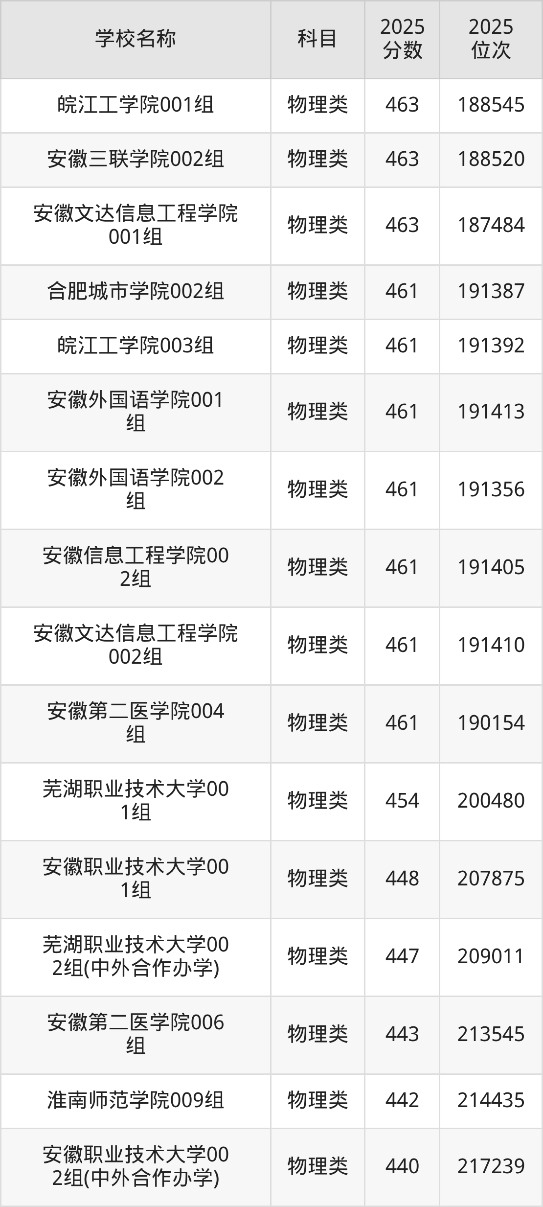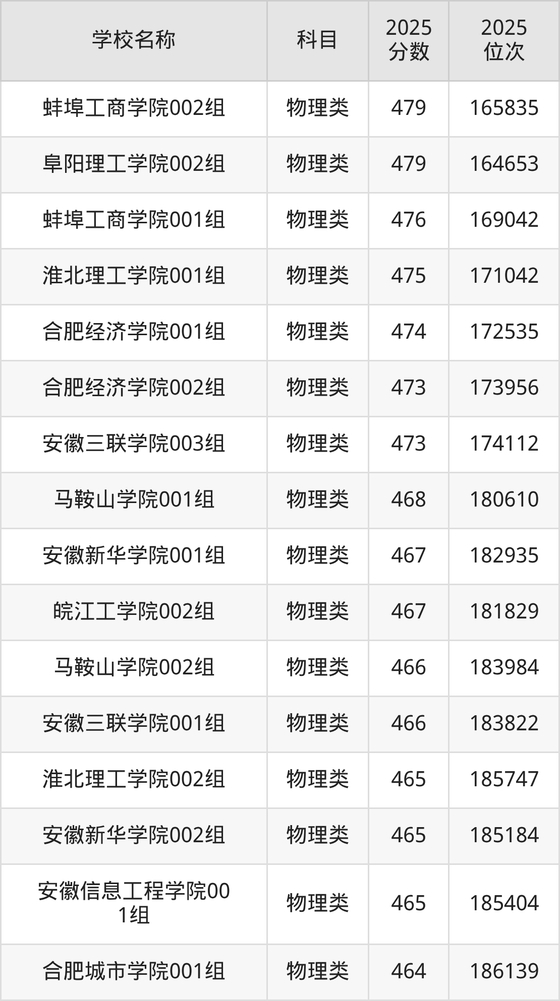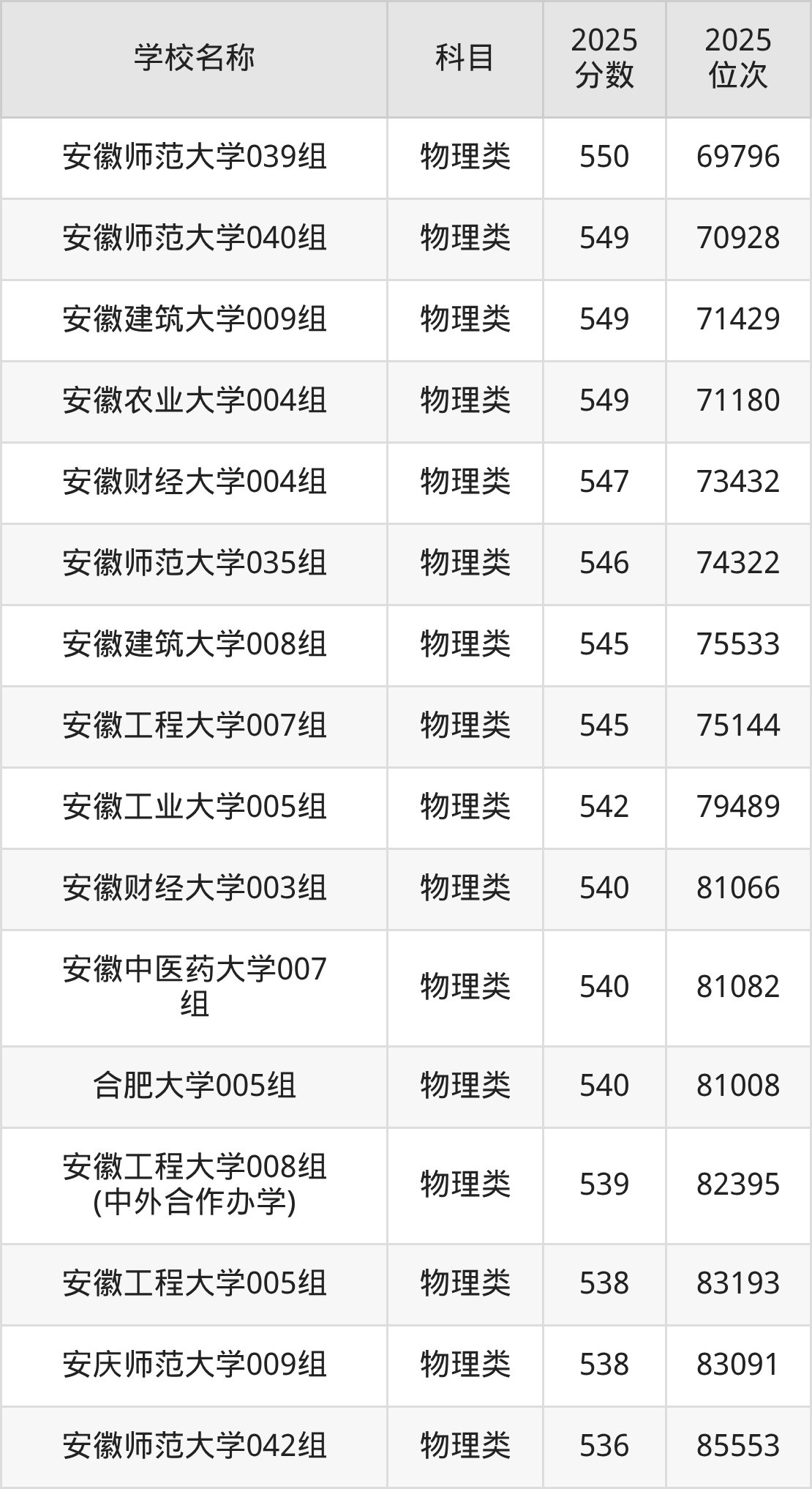 下文为2025年安徽省本科大学在安徽物理类录取分数线和位次排名表,供大家参考: