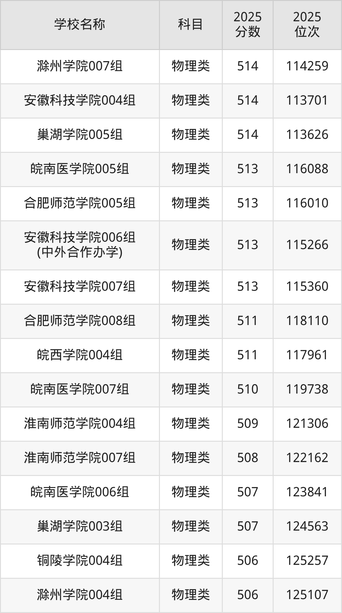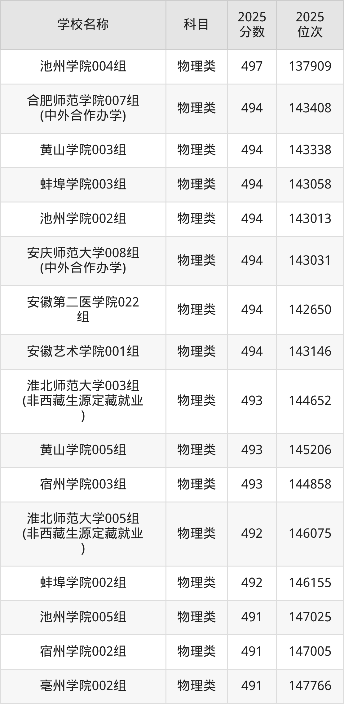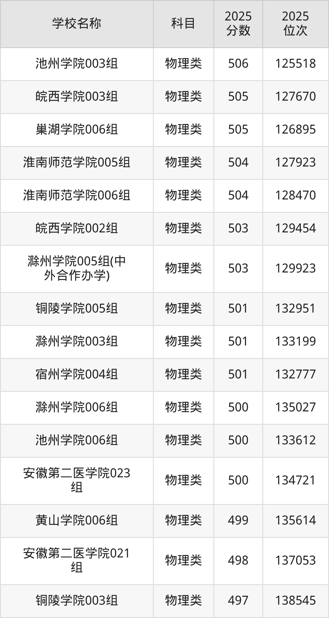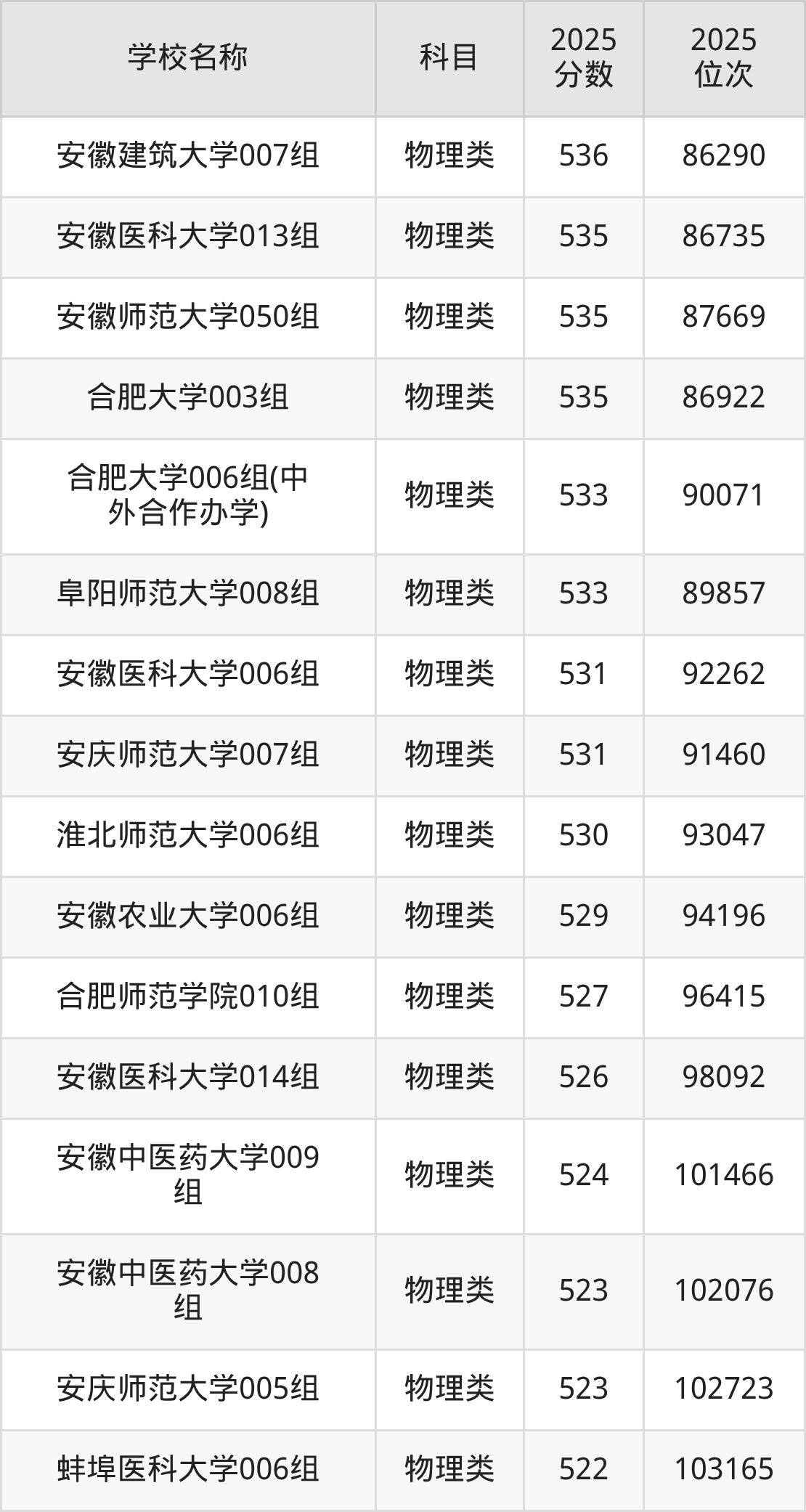下文为2025年安徽省本科大学在安徽物理类录取分数线和位次排名表,供大家参考: