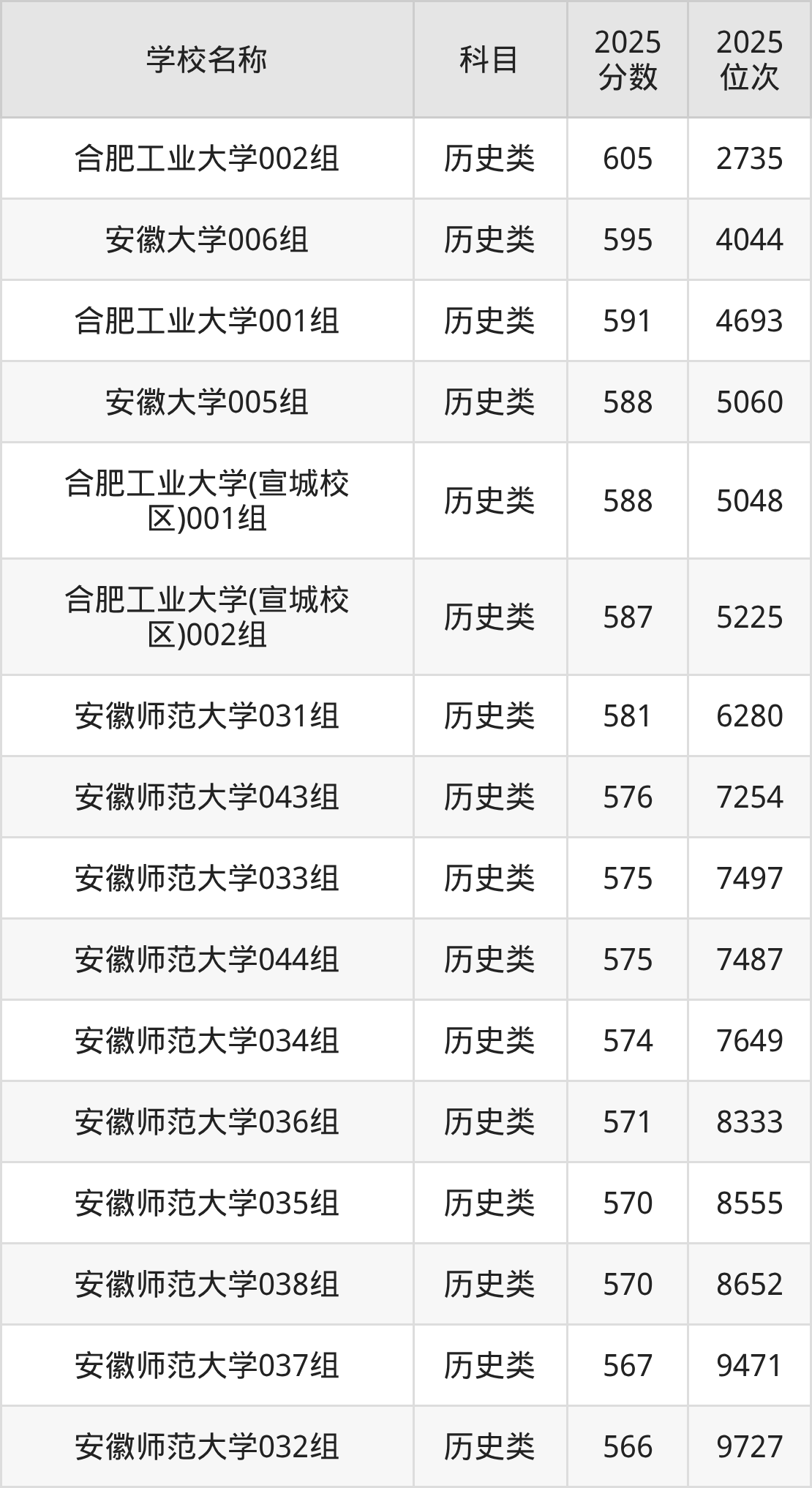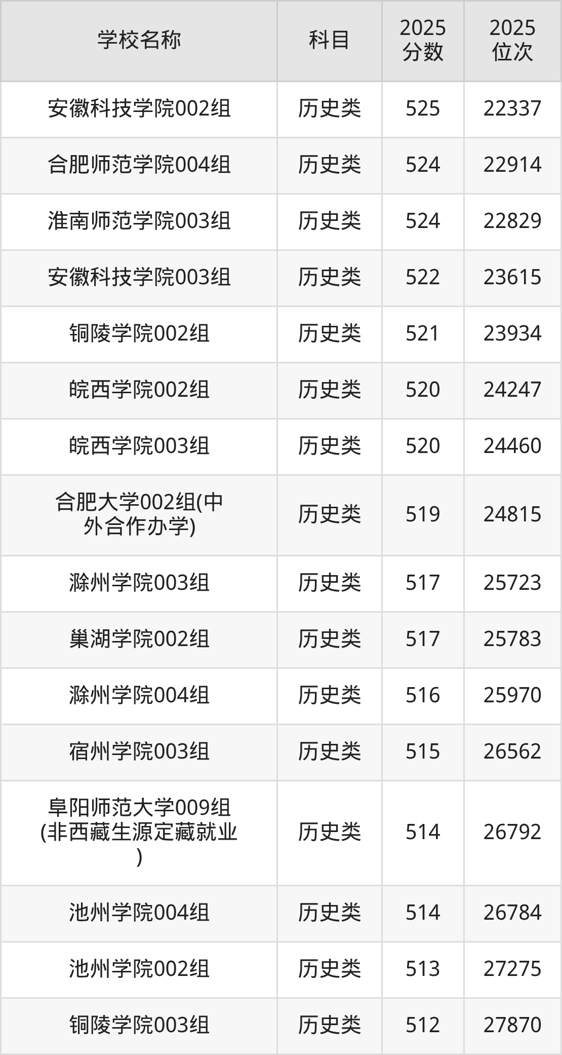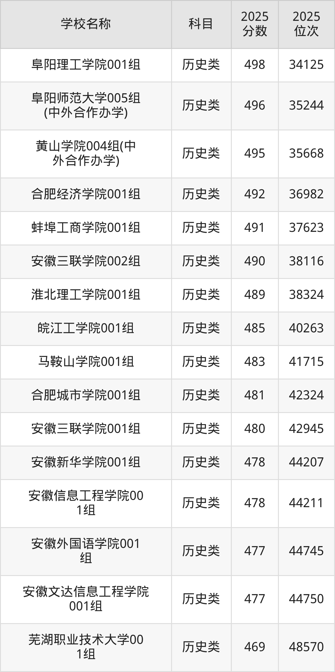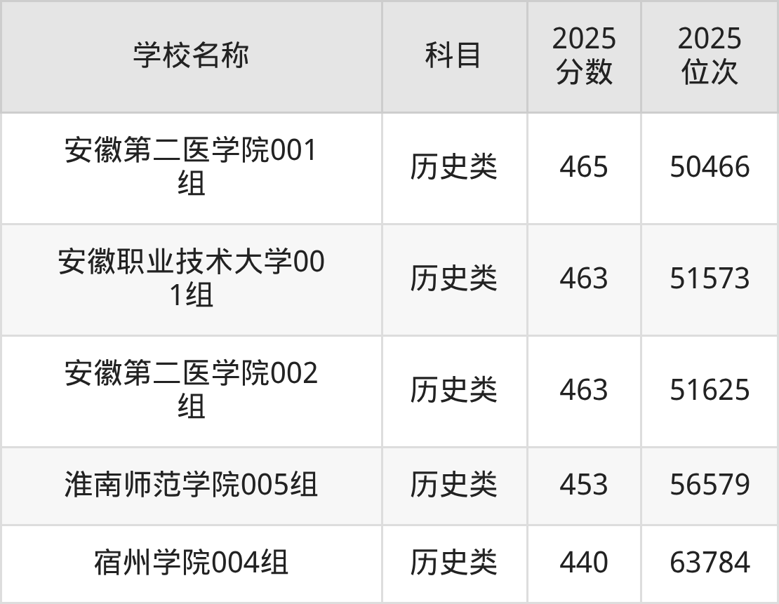 下文为2025年安徽省本科大学在安徽历史类录取分数线和位次排名表,供大家参考: