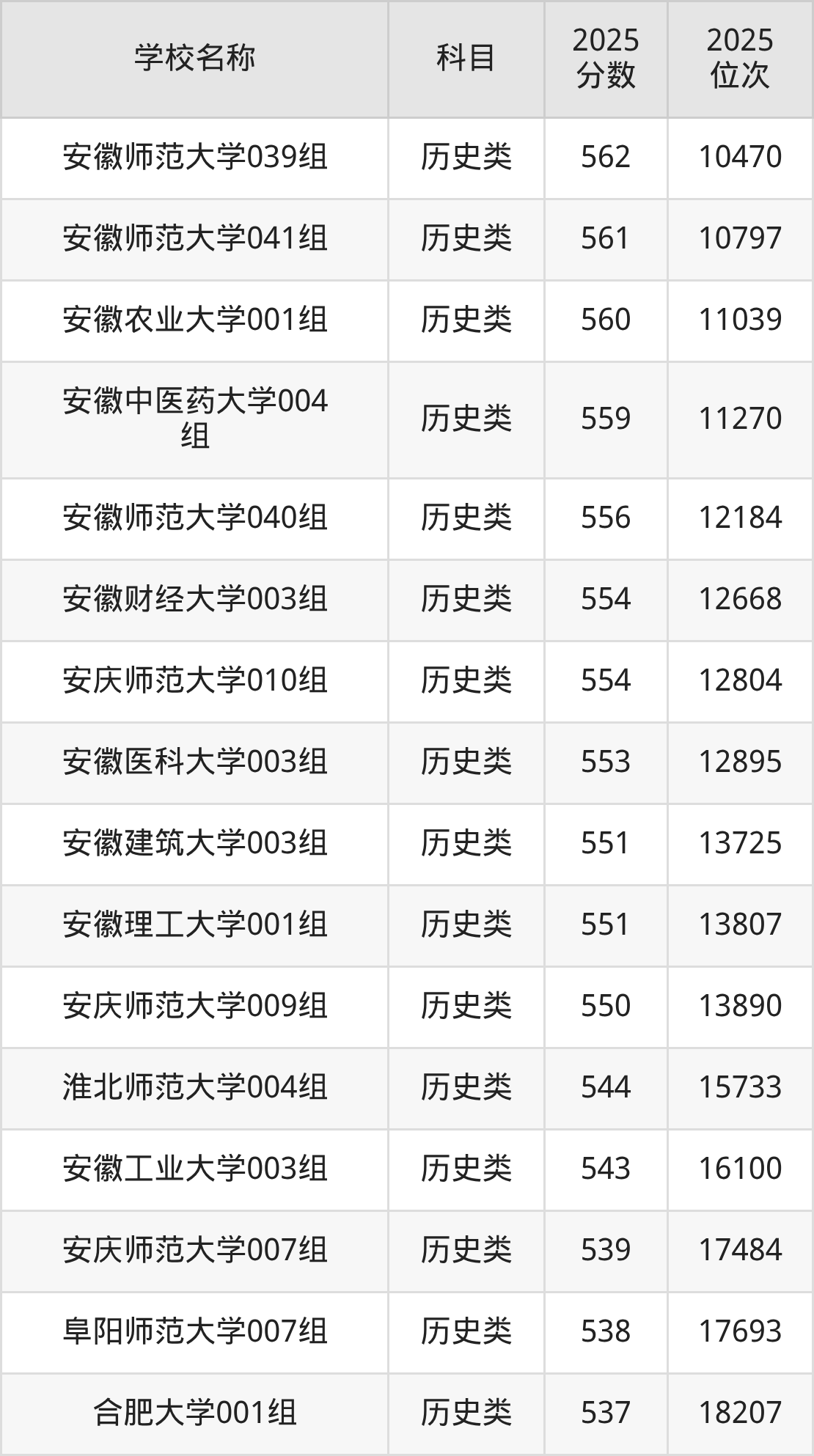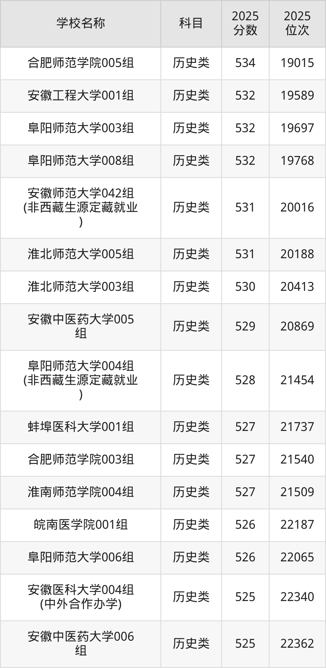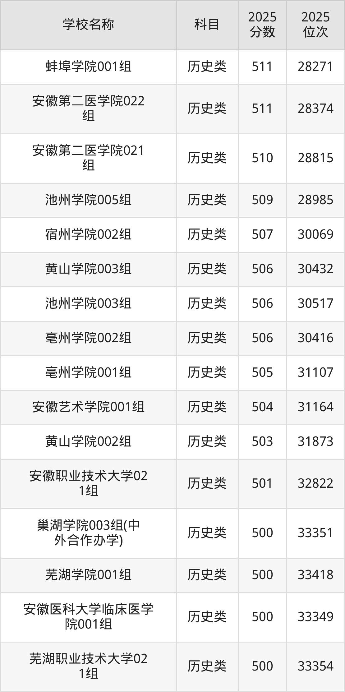 下文为2025年安徽省本科大学在安徽历史类录取分数线和位次排名表,供大家参考: