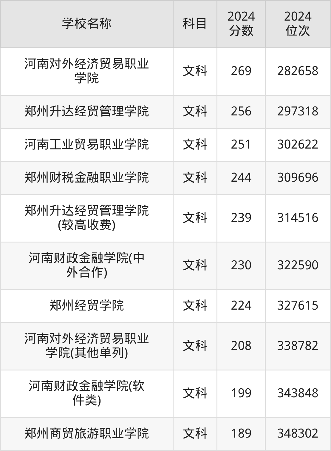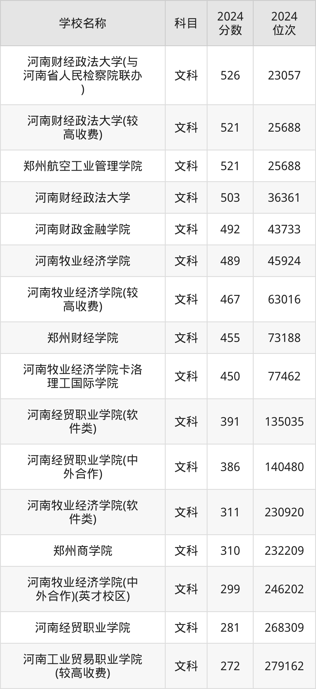 下文为2024年河南省财经类大学在河南文科录取分数线和位次排名表,供大家参考: