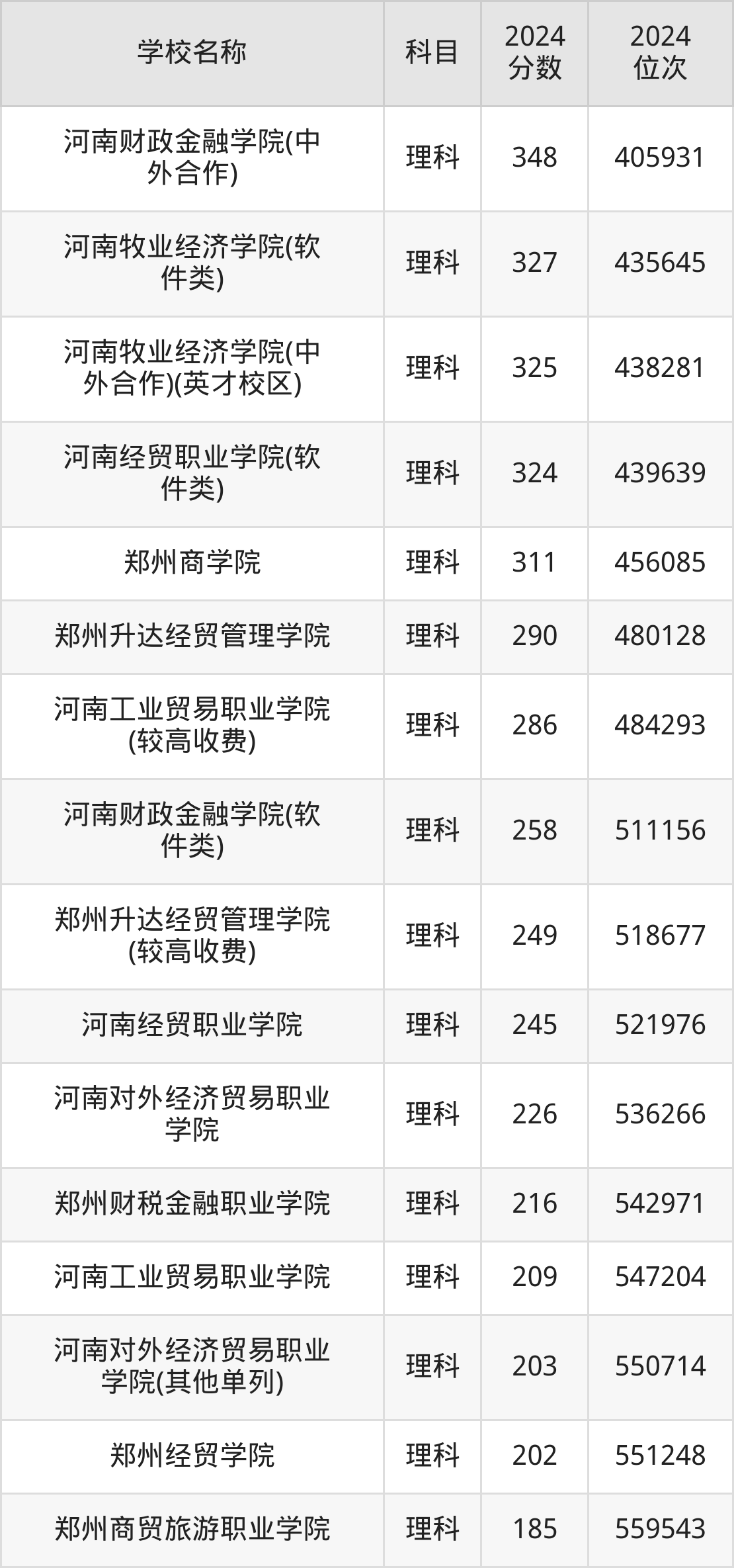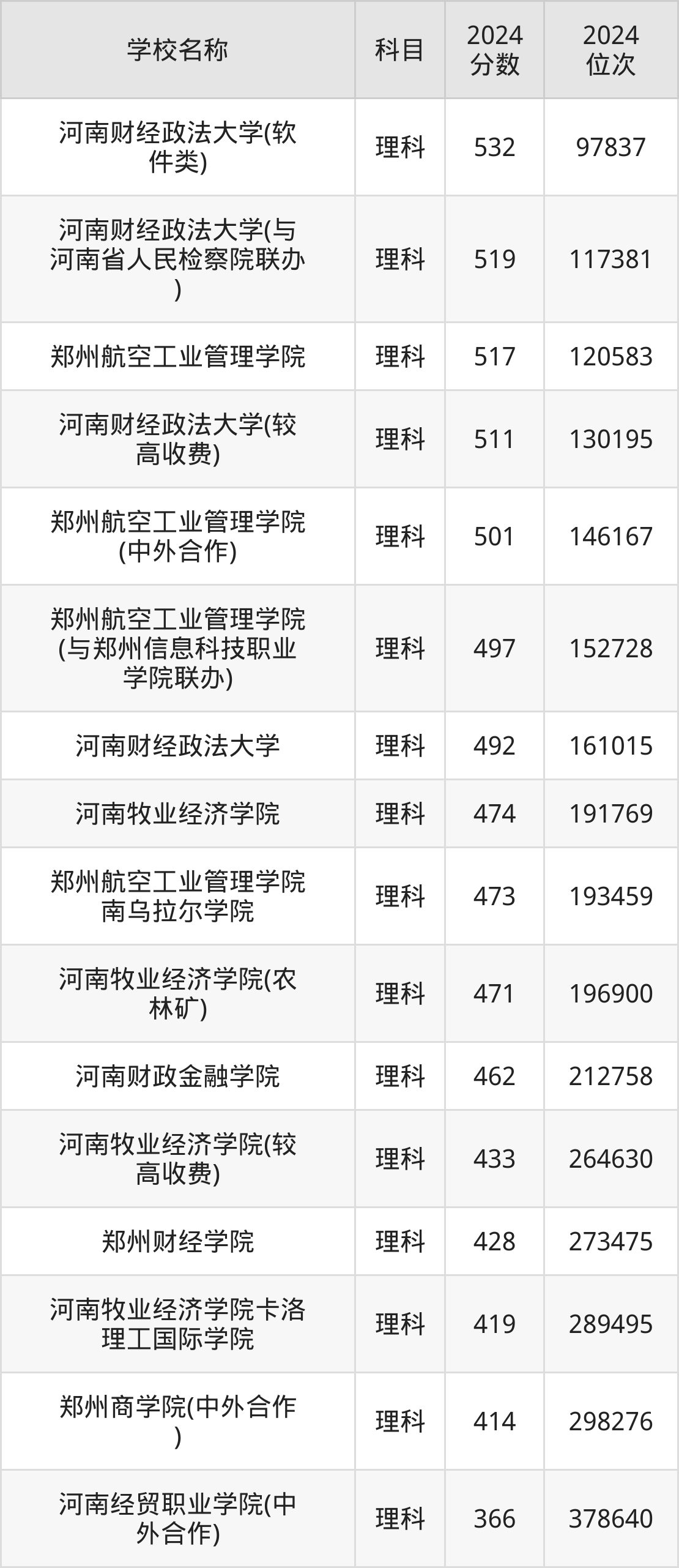下文为2024年河南省财经类大学在河南理科录取分数线和位次排名表,供大家参考: