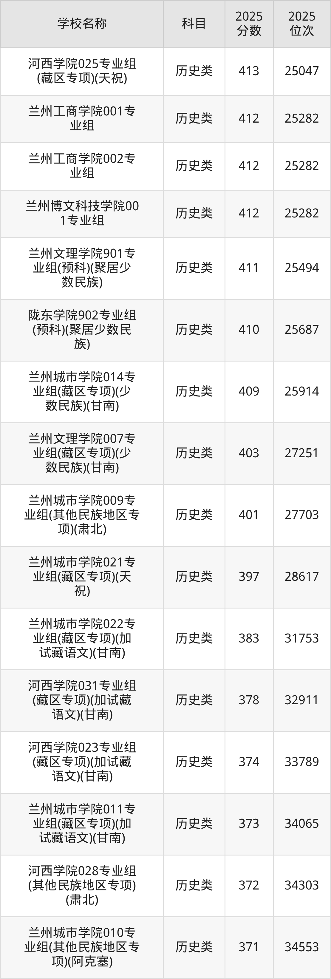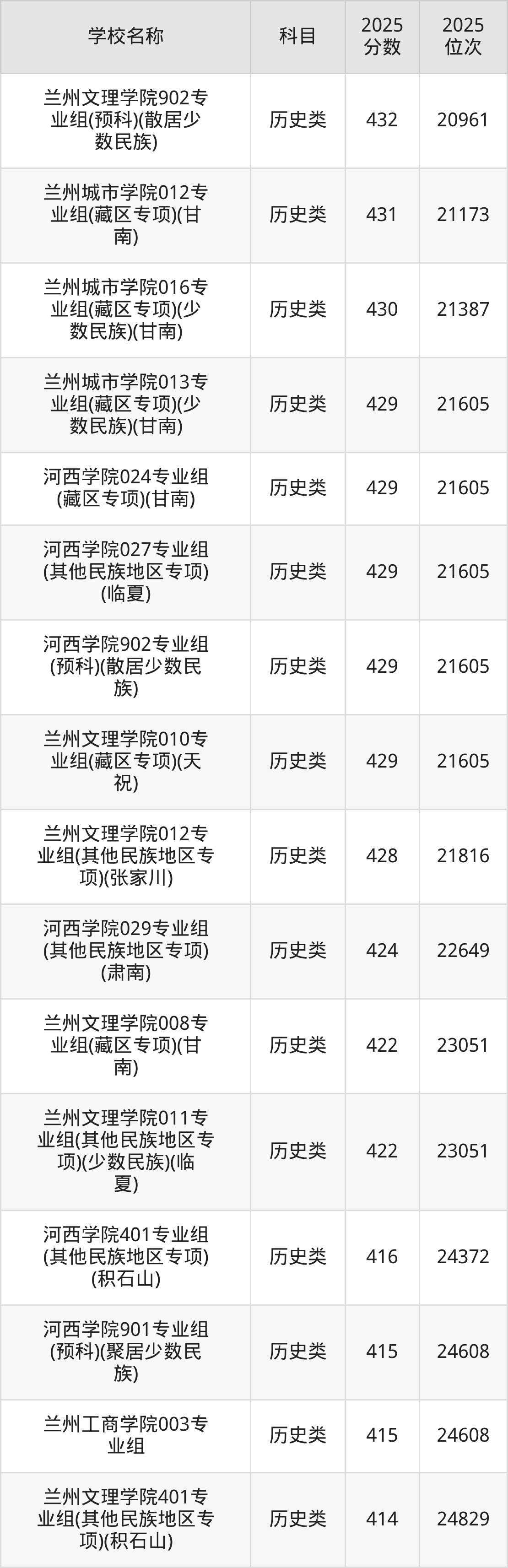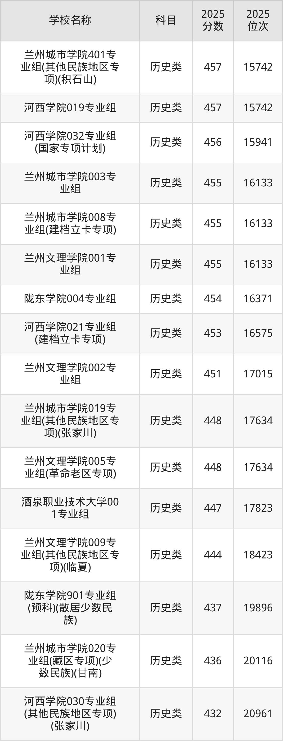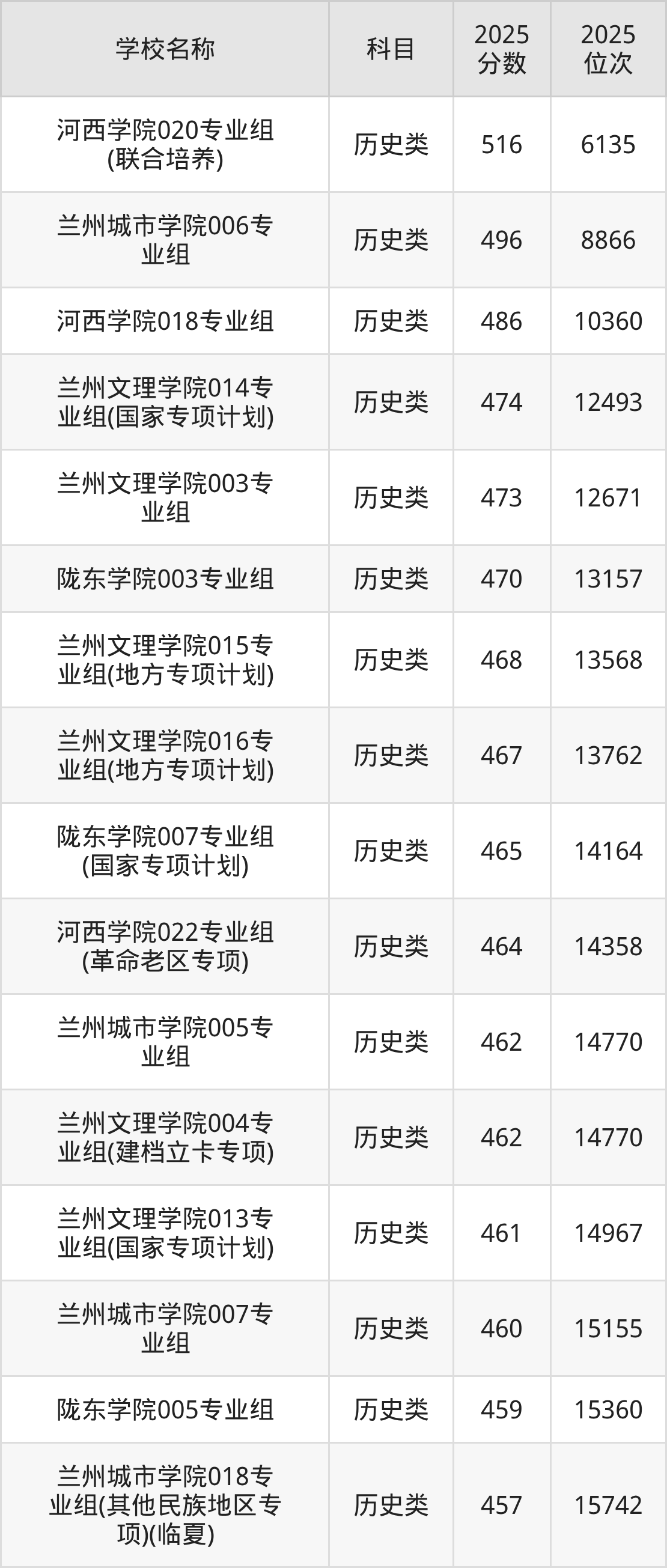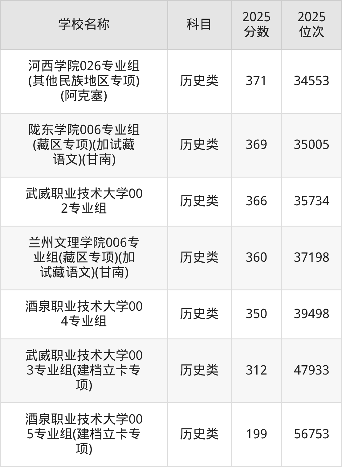 下文为2025年甘肃省二本综合大学在甘肃历史类录取分数线和位次排名表,供大家参考:
