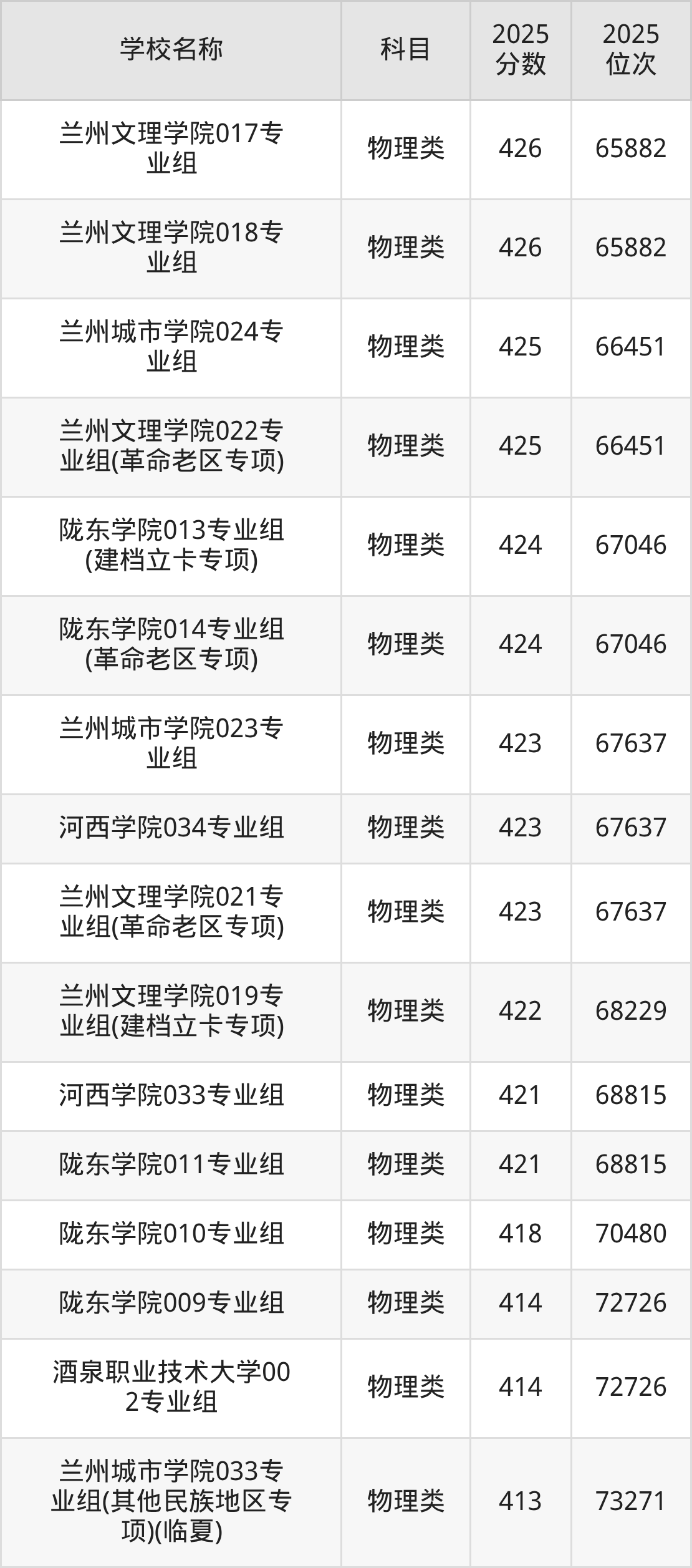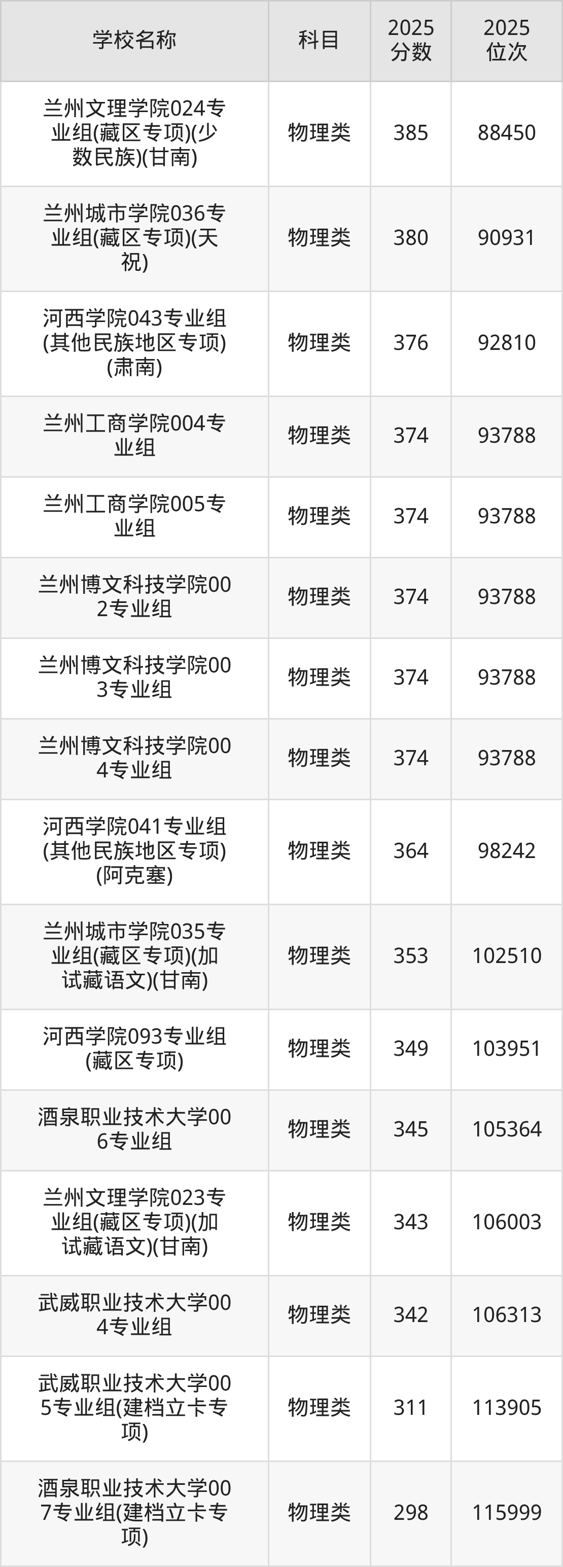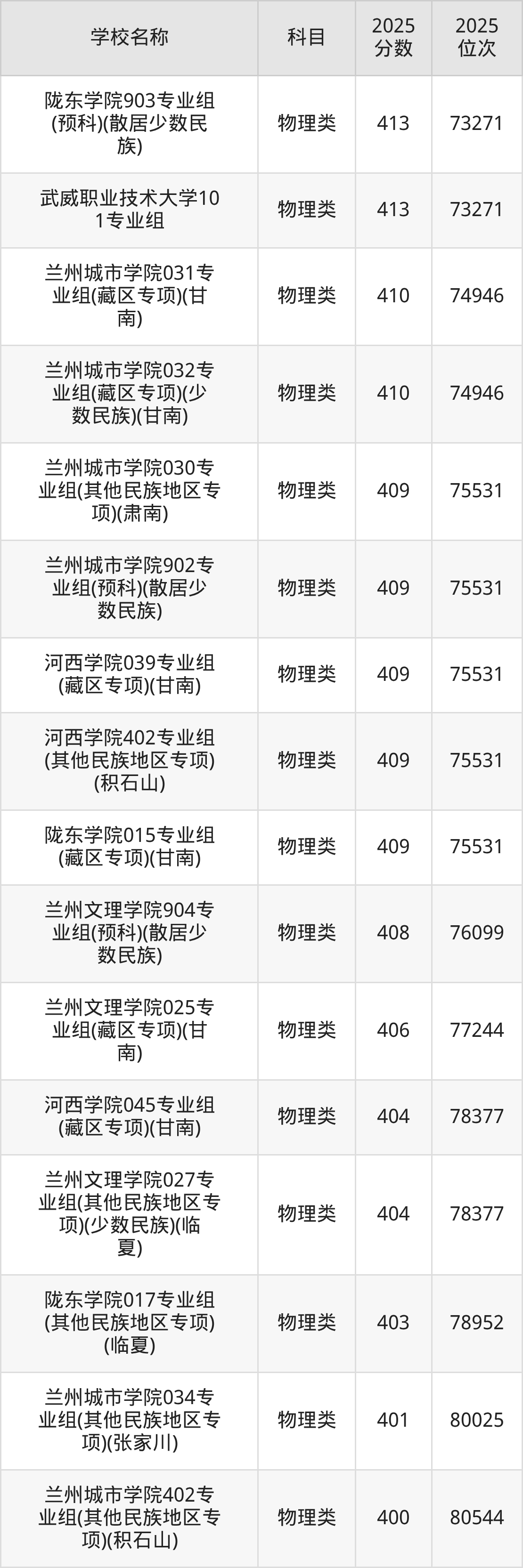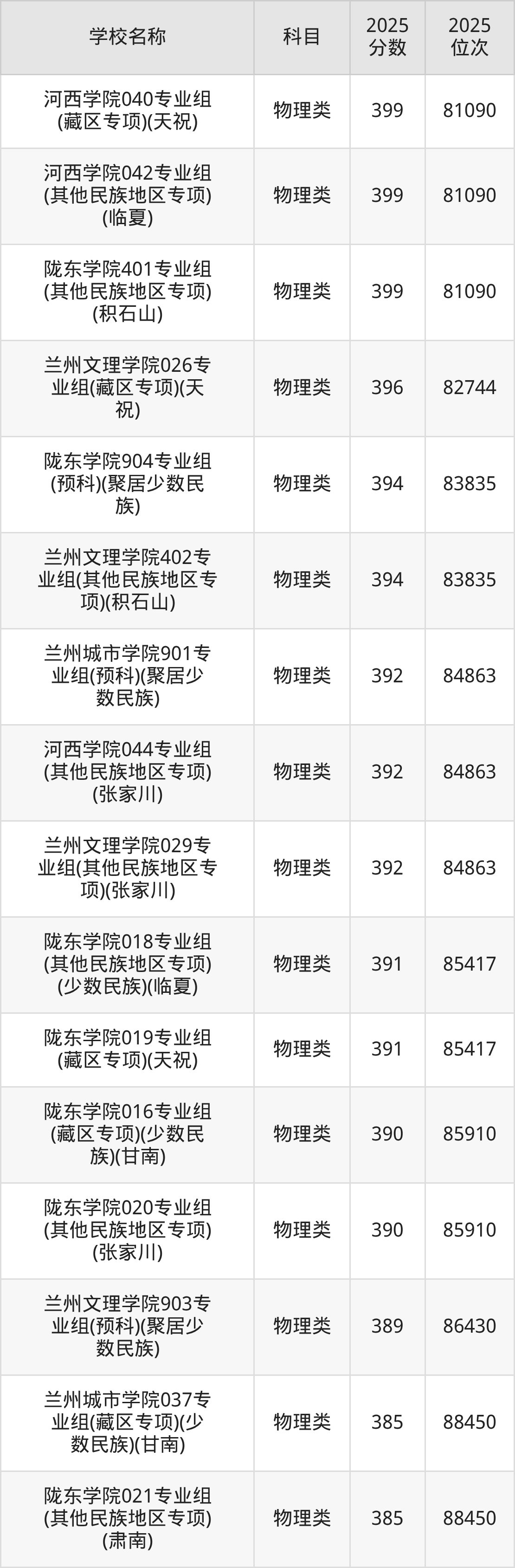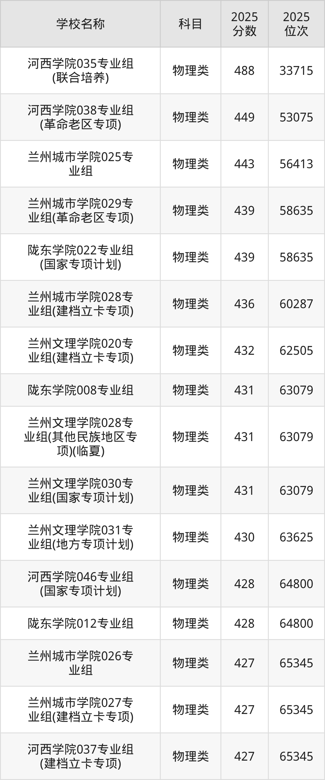 下文为2025年甘肃省二本综合大学在甘肃物理类录取分数线和位次排名表,供大家参考: