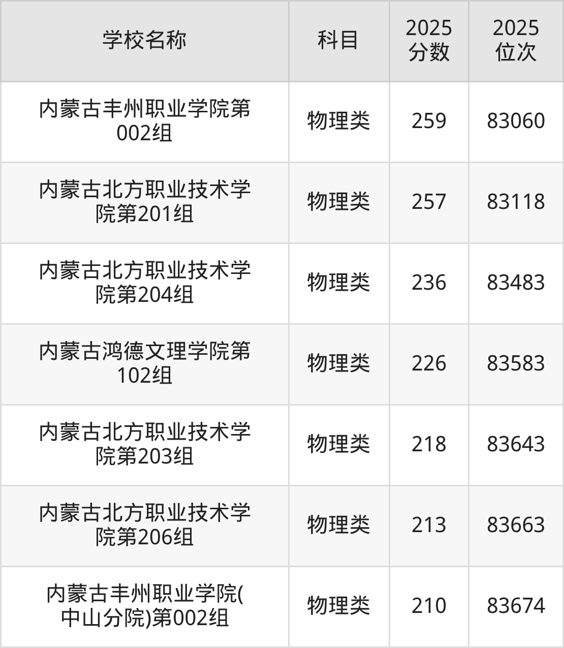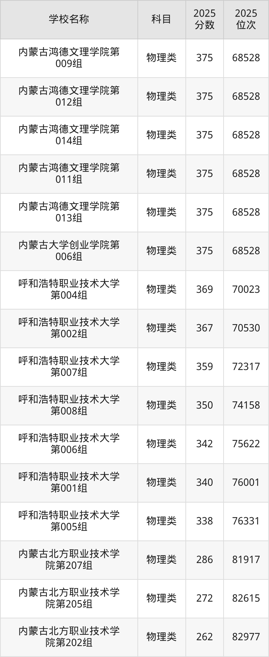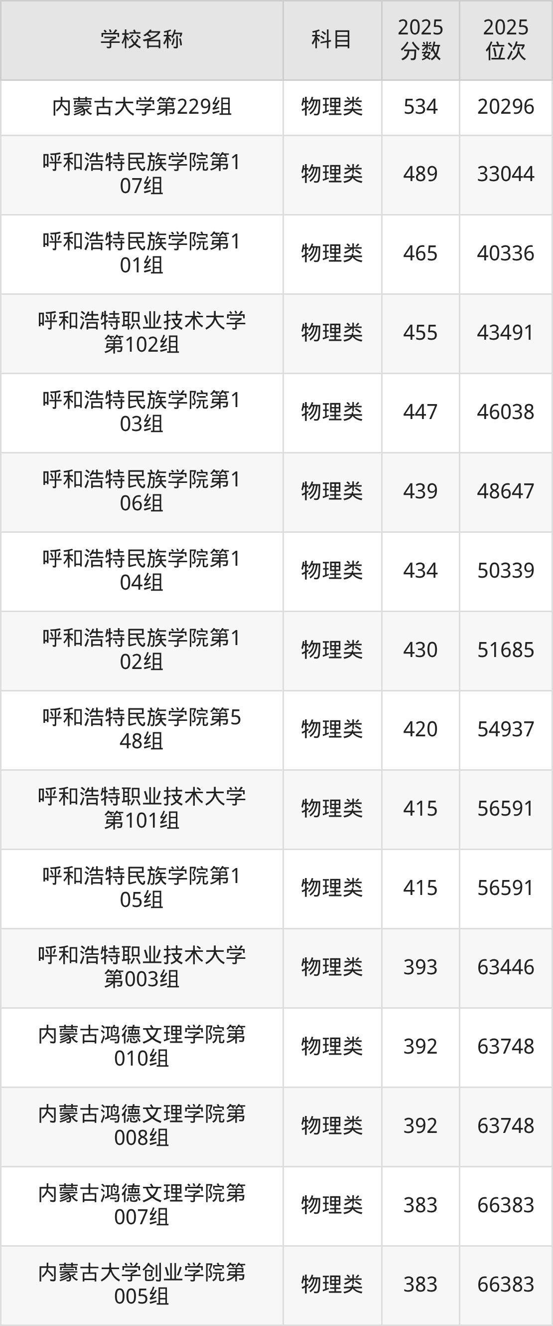 下文为2025年呼和浩特市综合类大学在内蒙古物理类录取分数线和位次排名表,供大家参考: