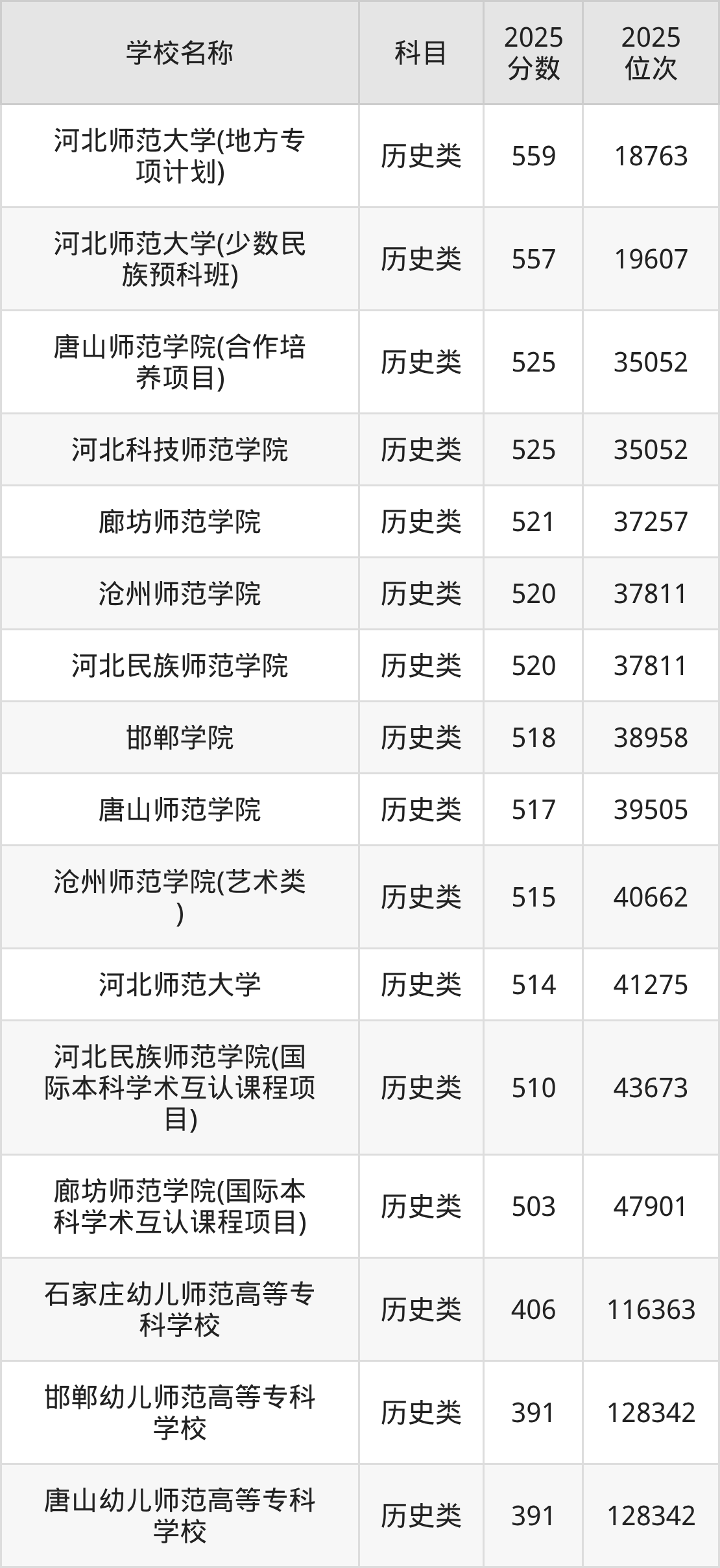 下文为2025年河北省师范类大学在河北历史类录取分数线和位次排名表,供大家参考: