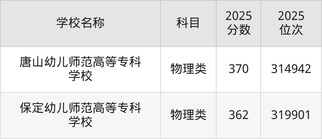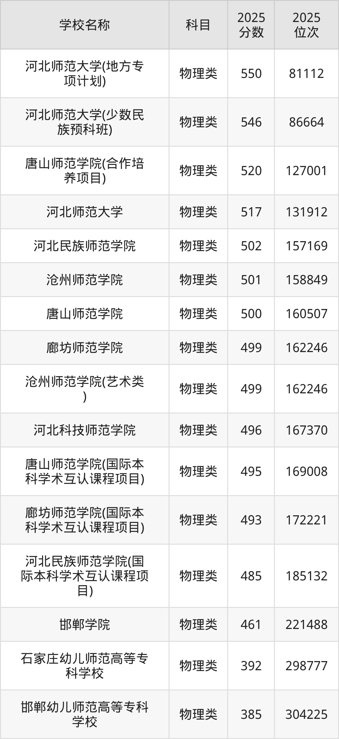 下文为2025年河北省师范类大学在河北物理类录取分数线和位次排名表,供大家参考: