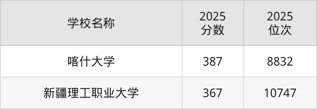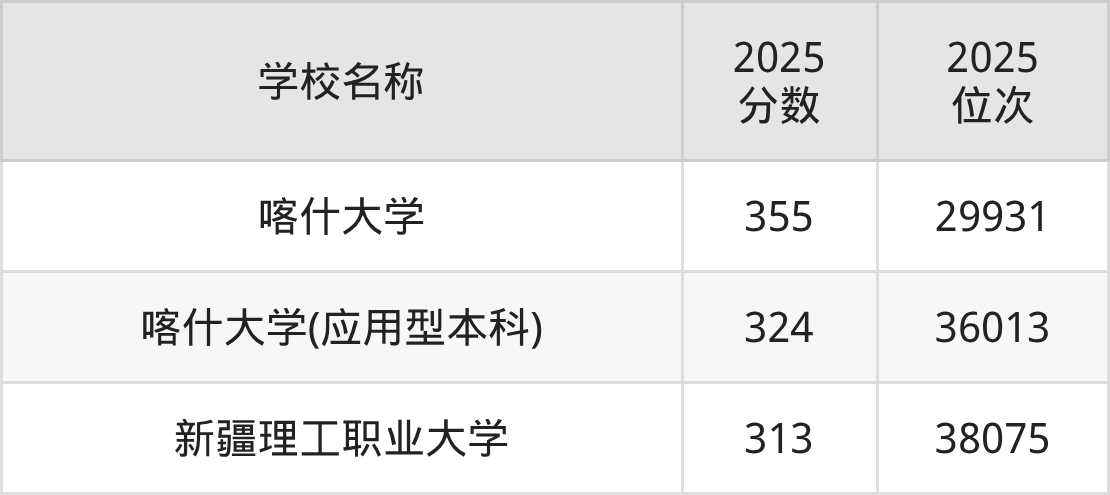 下文为2025年喀什地区本科大学在新疆理科录取分数线和位次排名表,供大家参考: