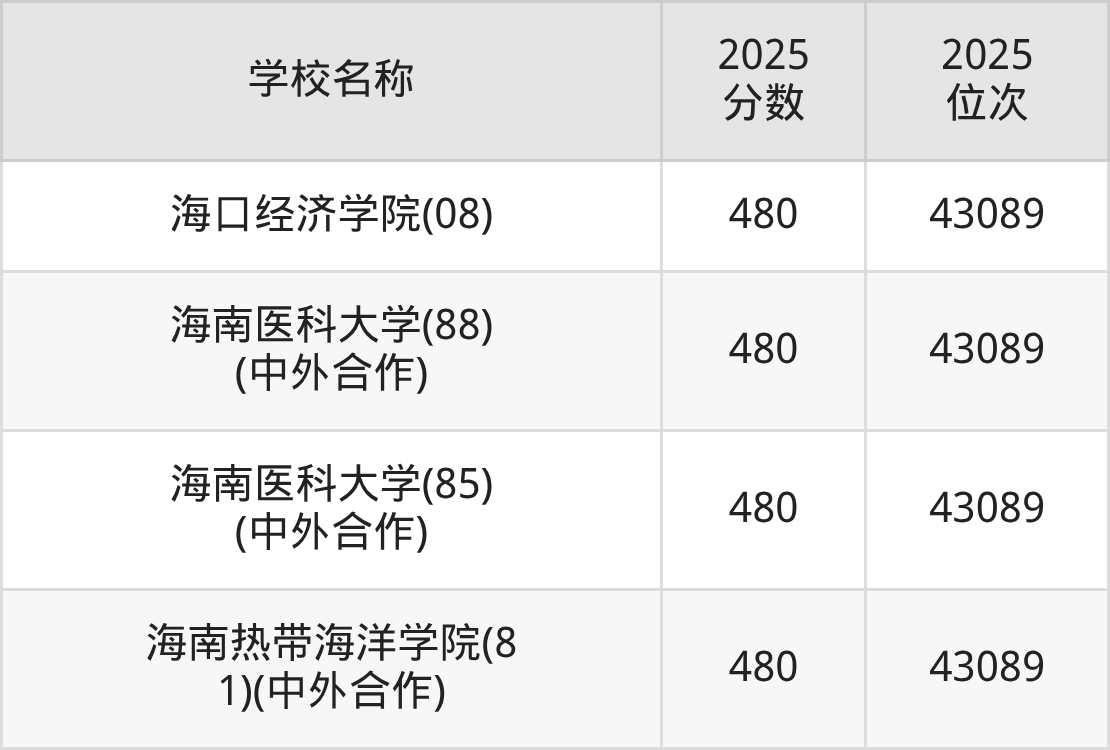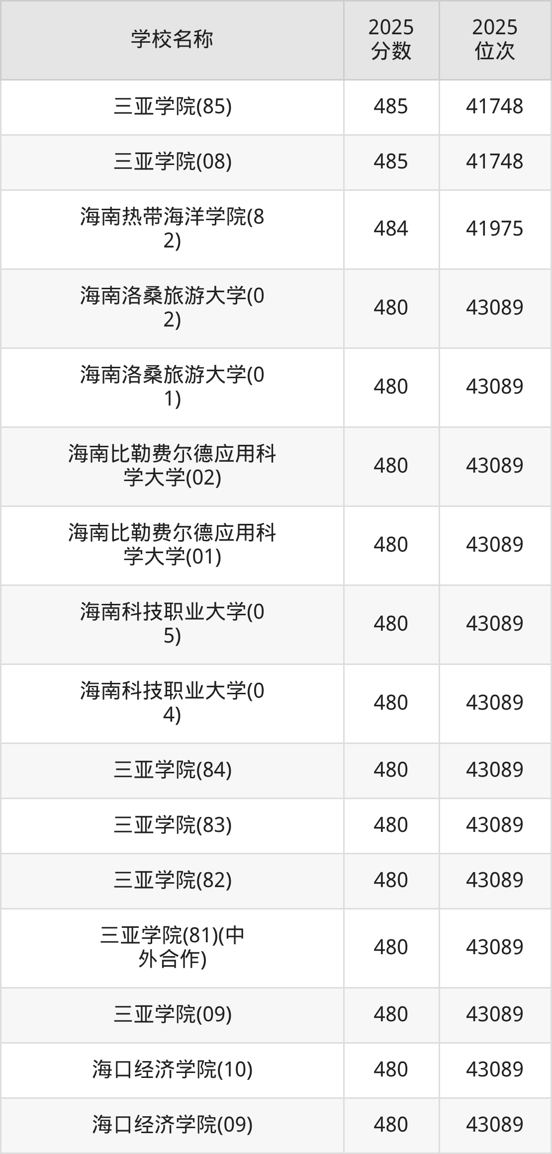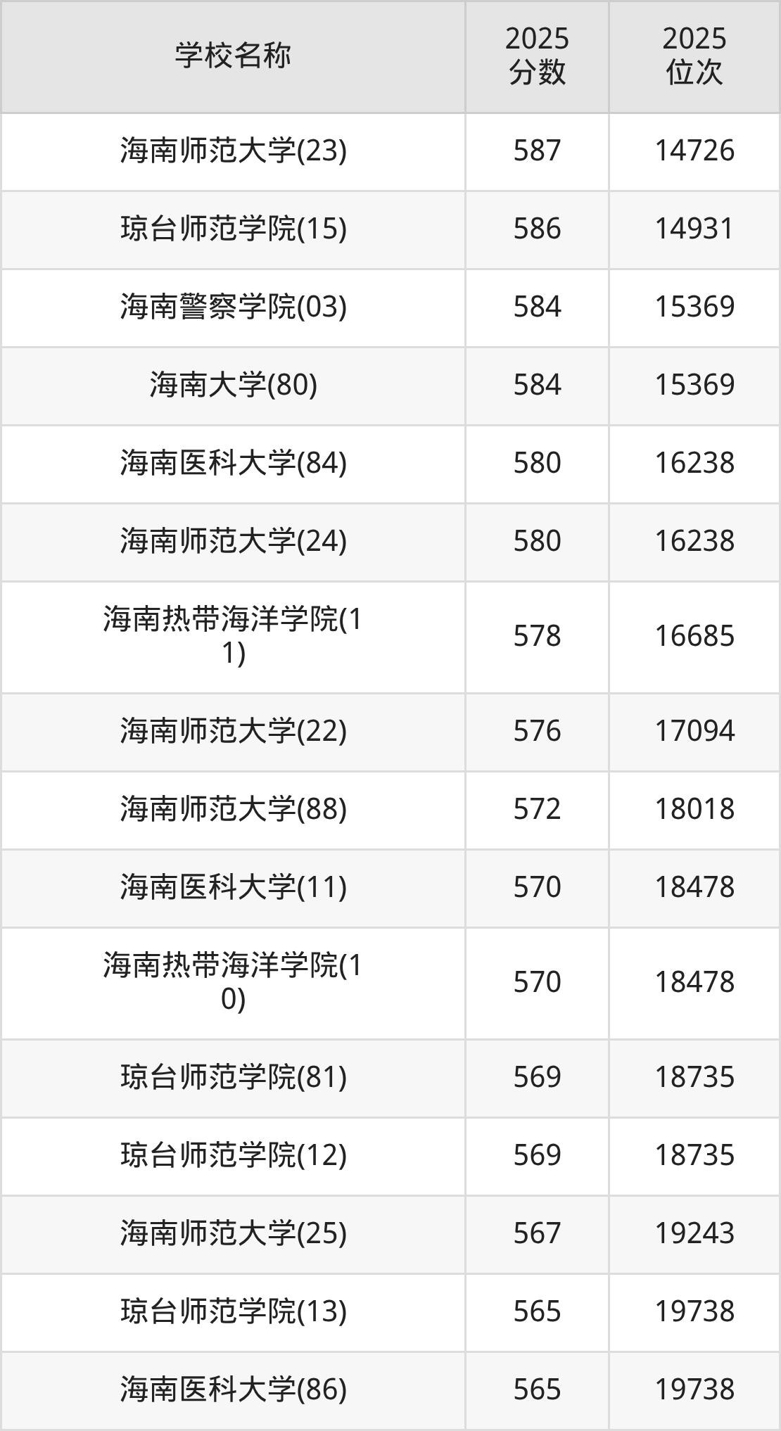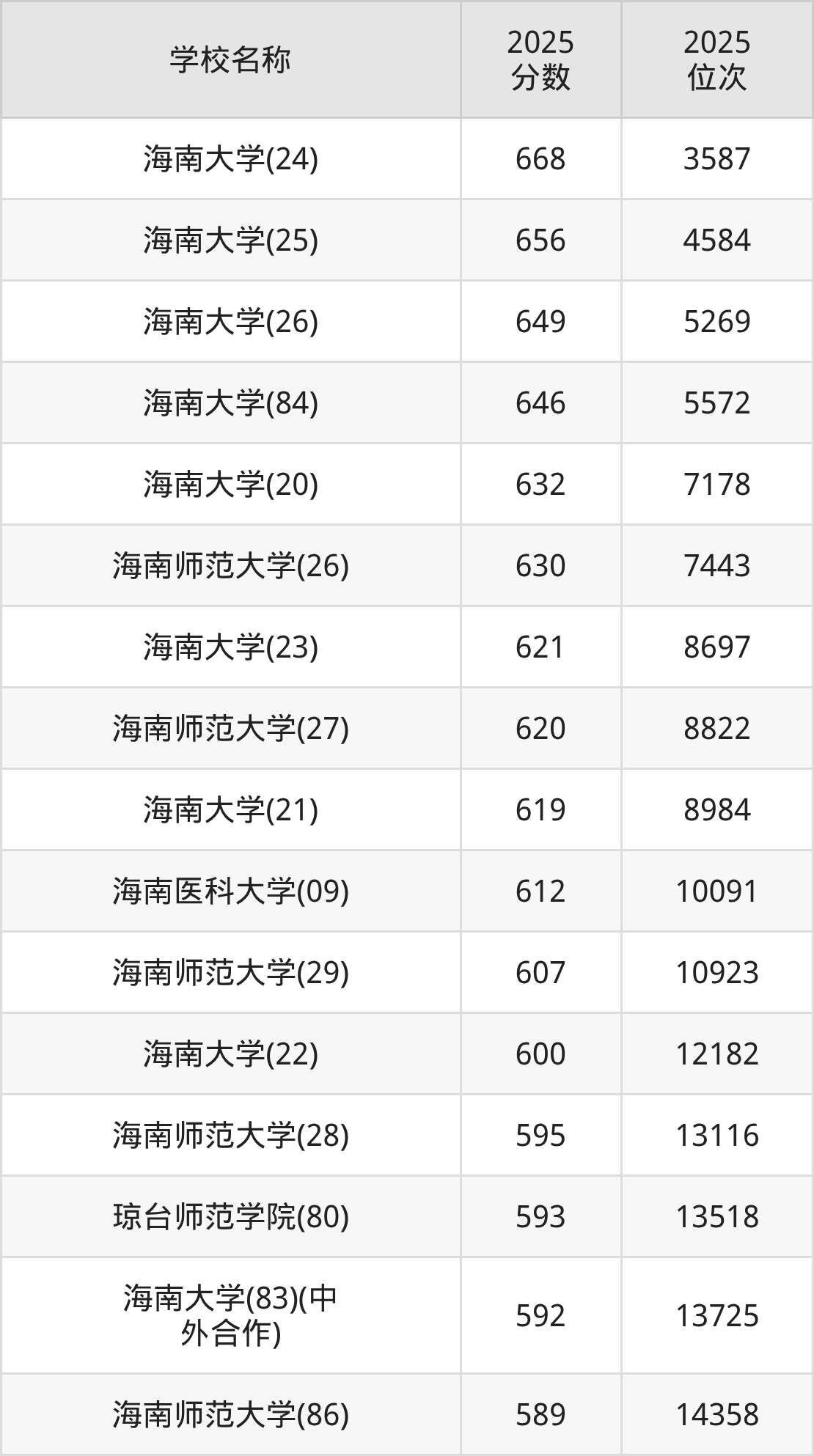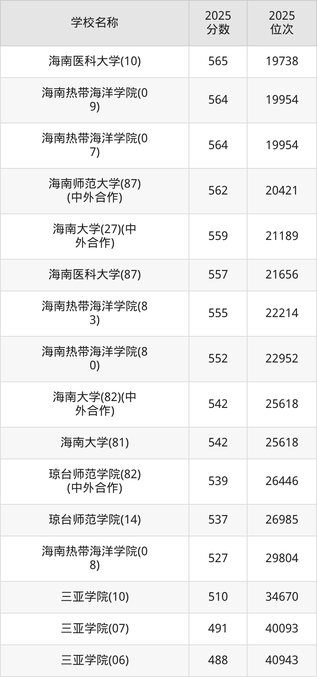 下文为2025年海南省本科大学在海南录取分数线和位次排名表,供大家参考: