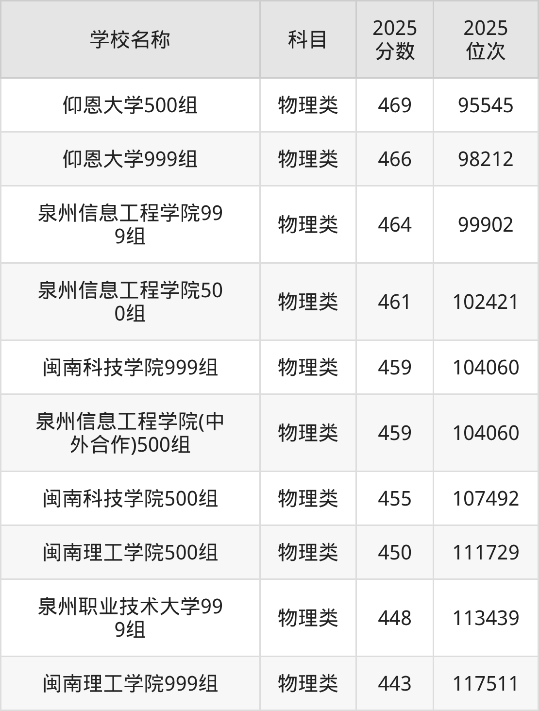 下文为2025年泉州市民办二本大学在福建物理类录取分数线和位次排名表,供大家参考: