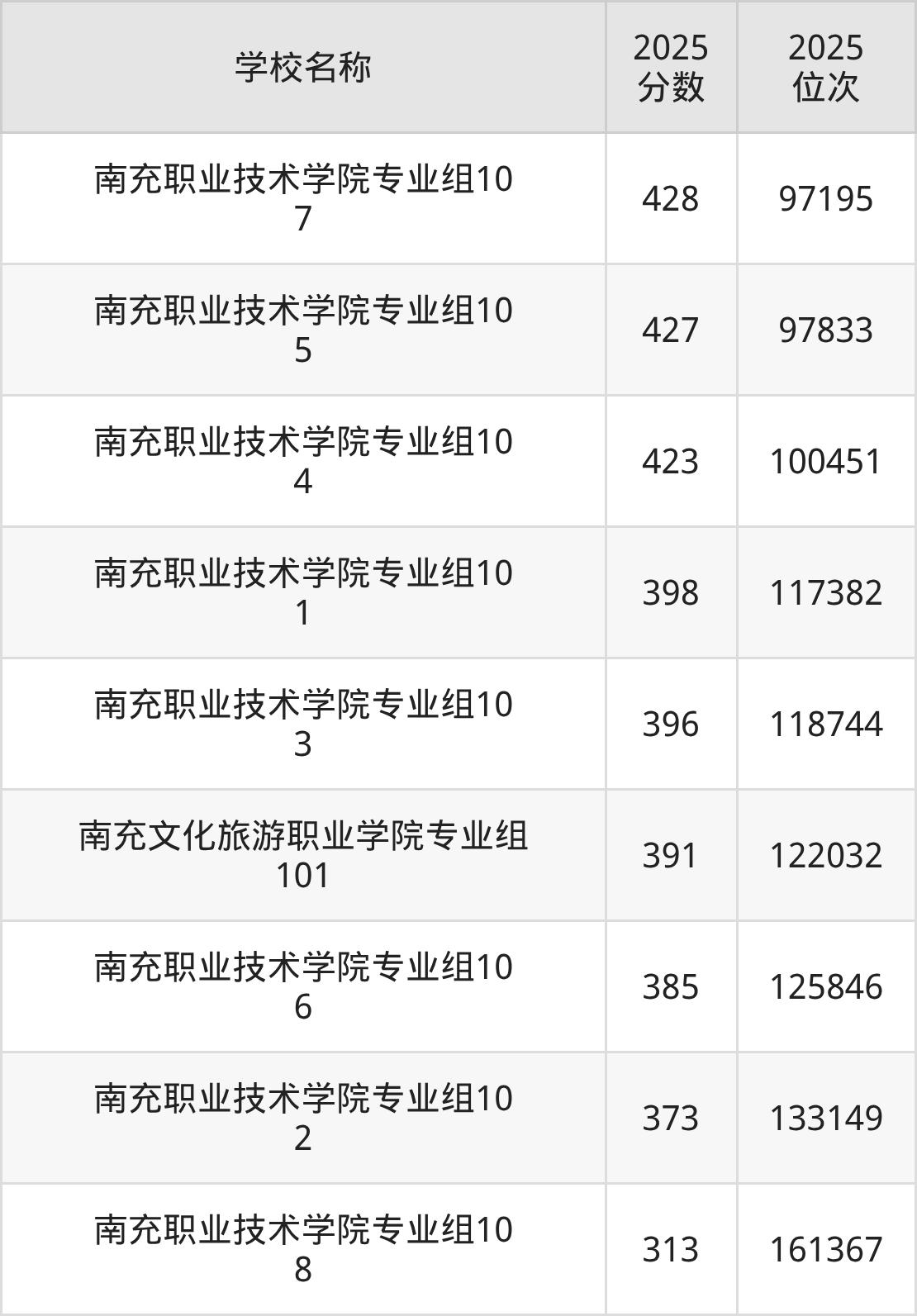 下文为2025年南充市公办专科大学在四川物理类录取分数线和位次排名表,供大家参考: