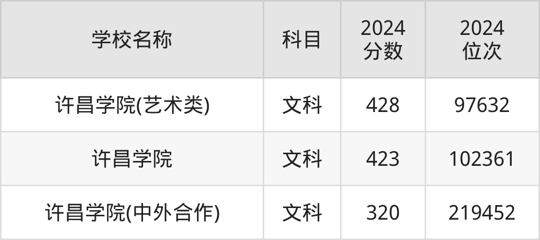 下文为2024年许昌市本科大学在河南文科录取分数线和位次排名表,供大家参考: