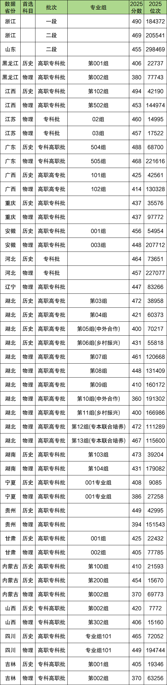 2025年武汉职业技术大学本科录取分数线是372分到520分,录取最低为新疆理科、录取最高为江西历史类第101组。各省最低分如下表所示:
