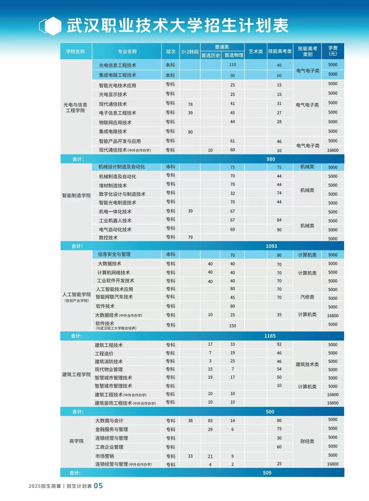 2025年武汉职业技术大学本科招生专业一共有6个,包括光电信息工程技术、集成电路工程技术、机械设计制造及其自动化、信息安全与管理、电子商务、生物检验检测技术。各专业招生计划表如下图所示:
