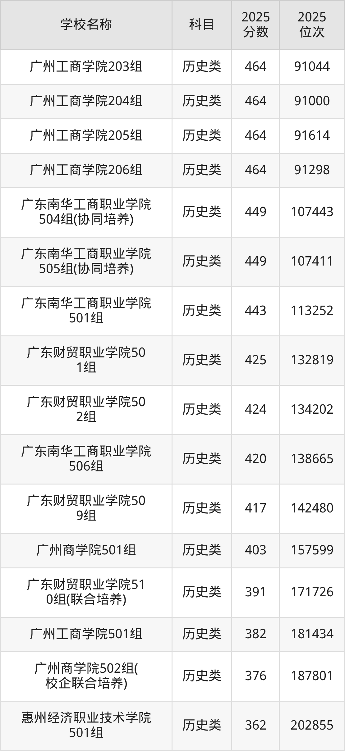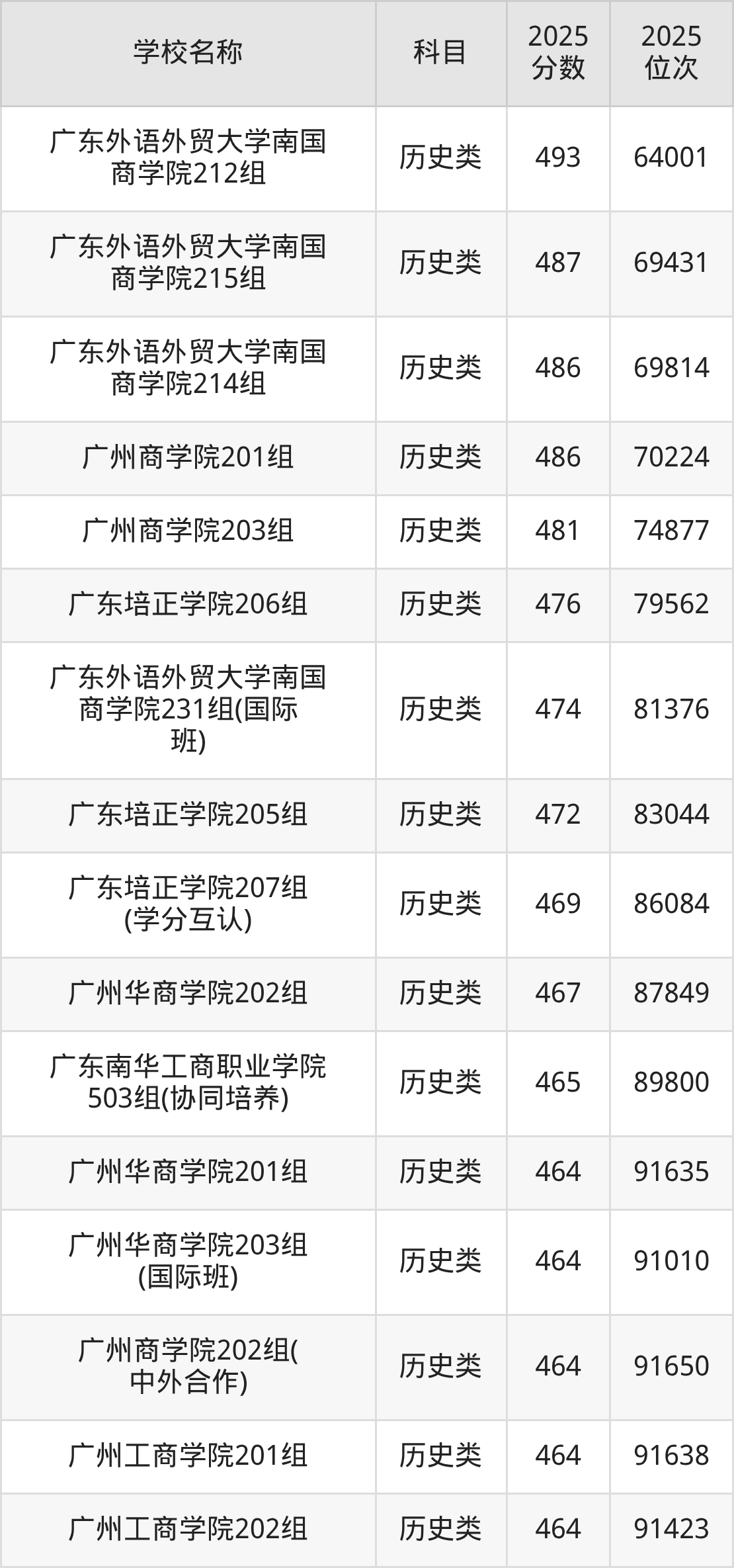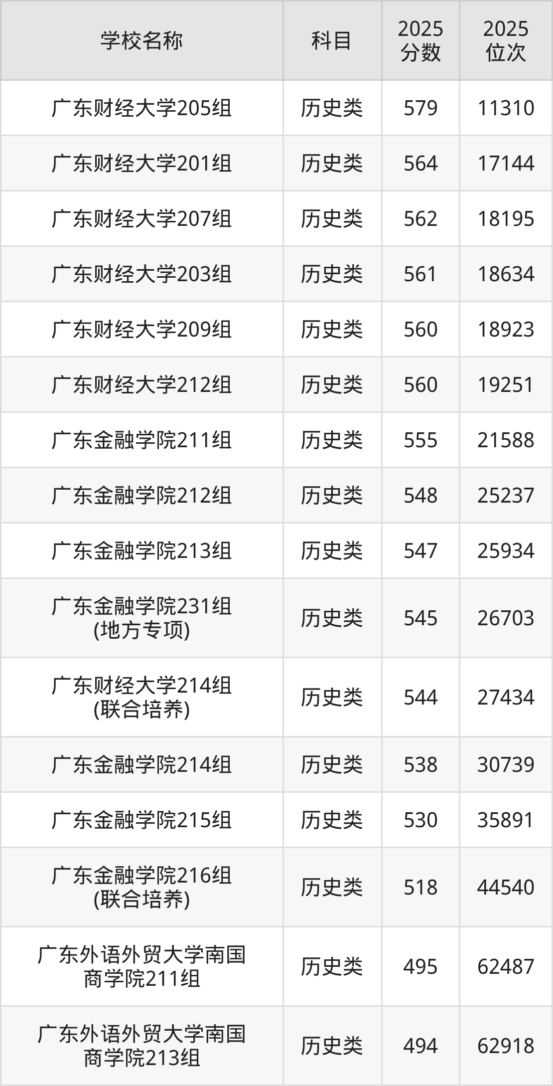下文为2025年广东省财经类大学在广东历史类录取分数线和位次排名表,供大家参考: