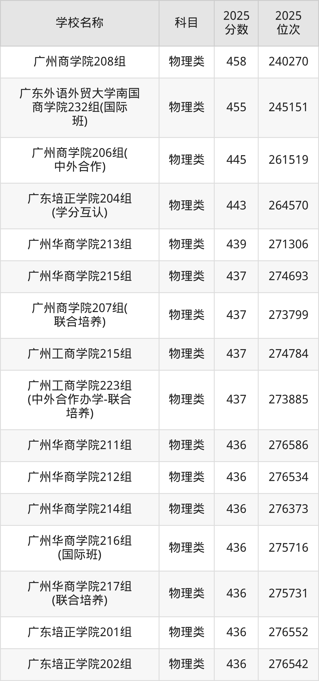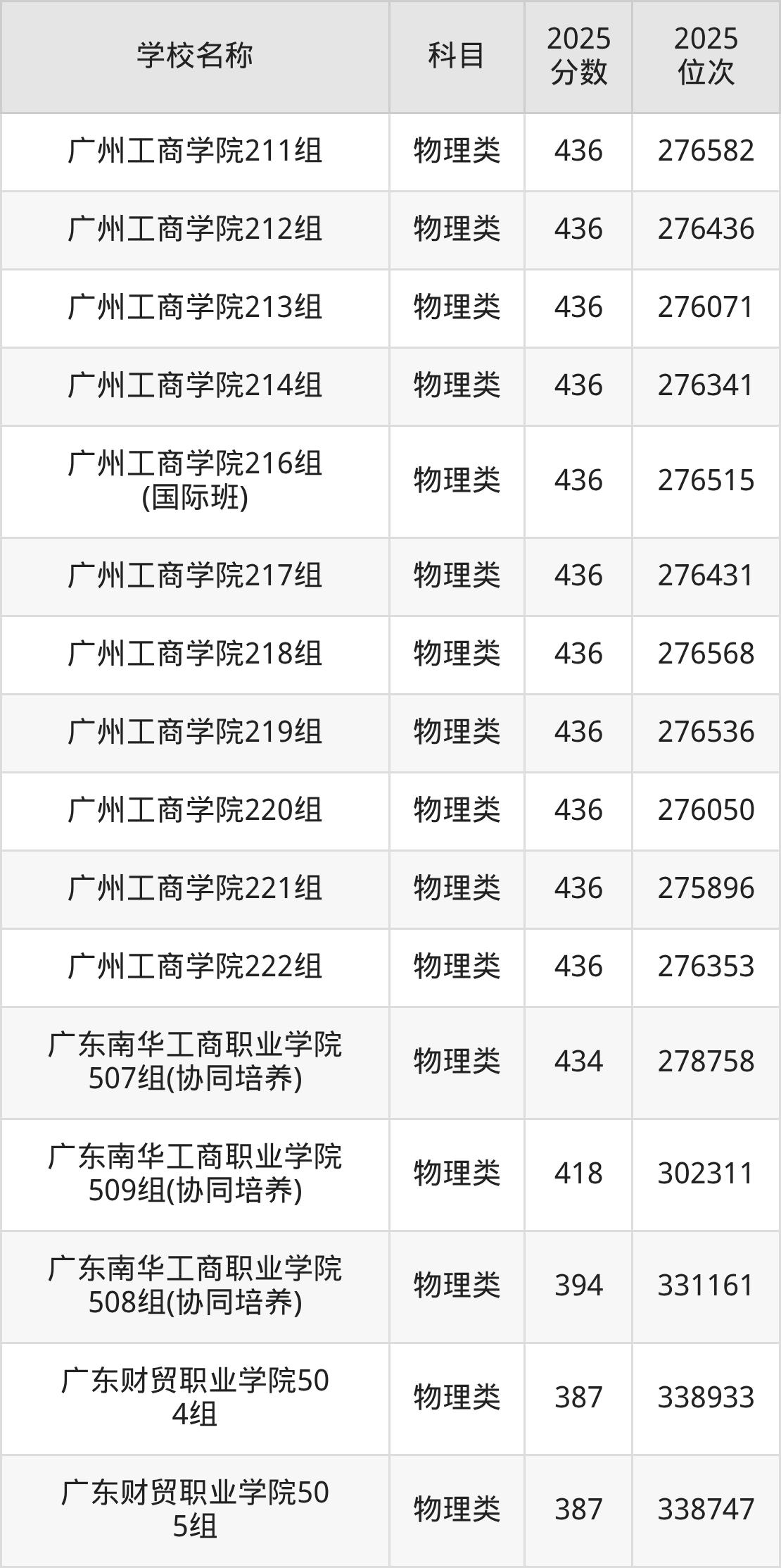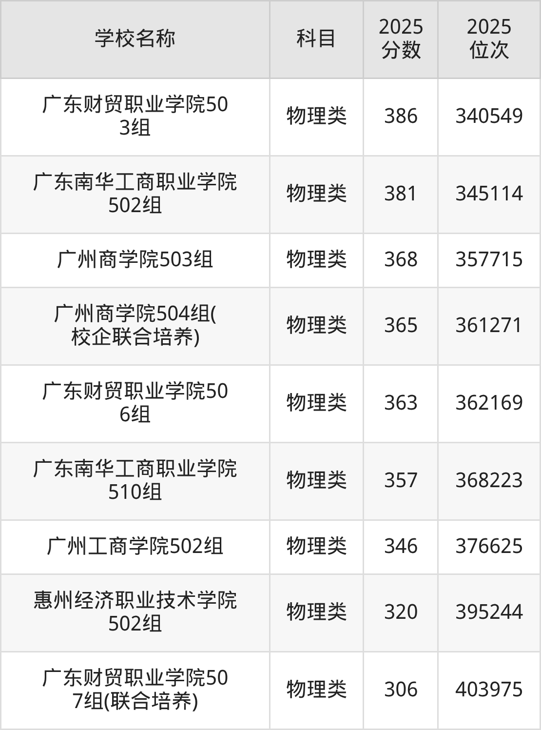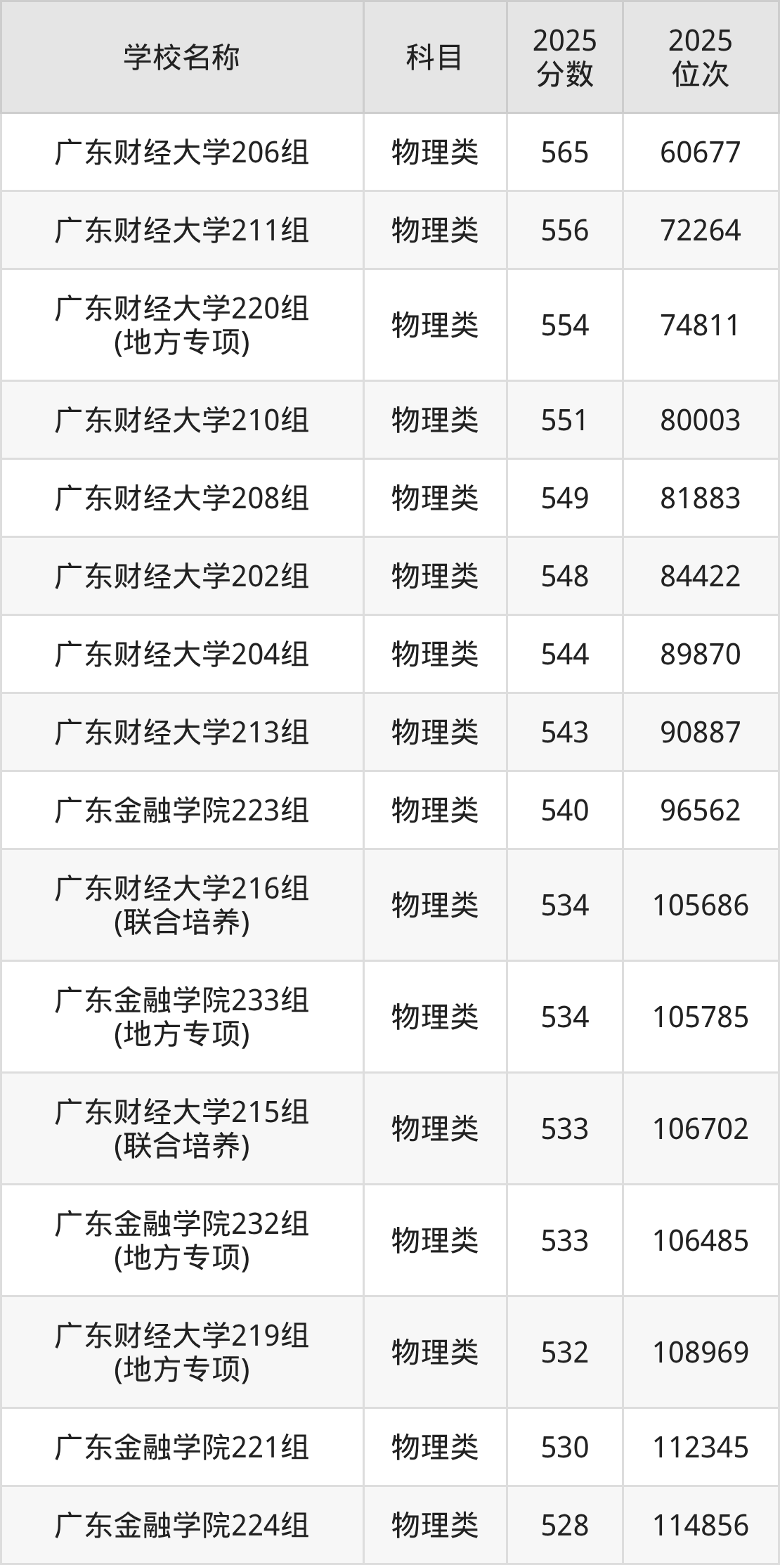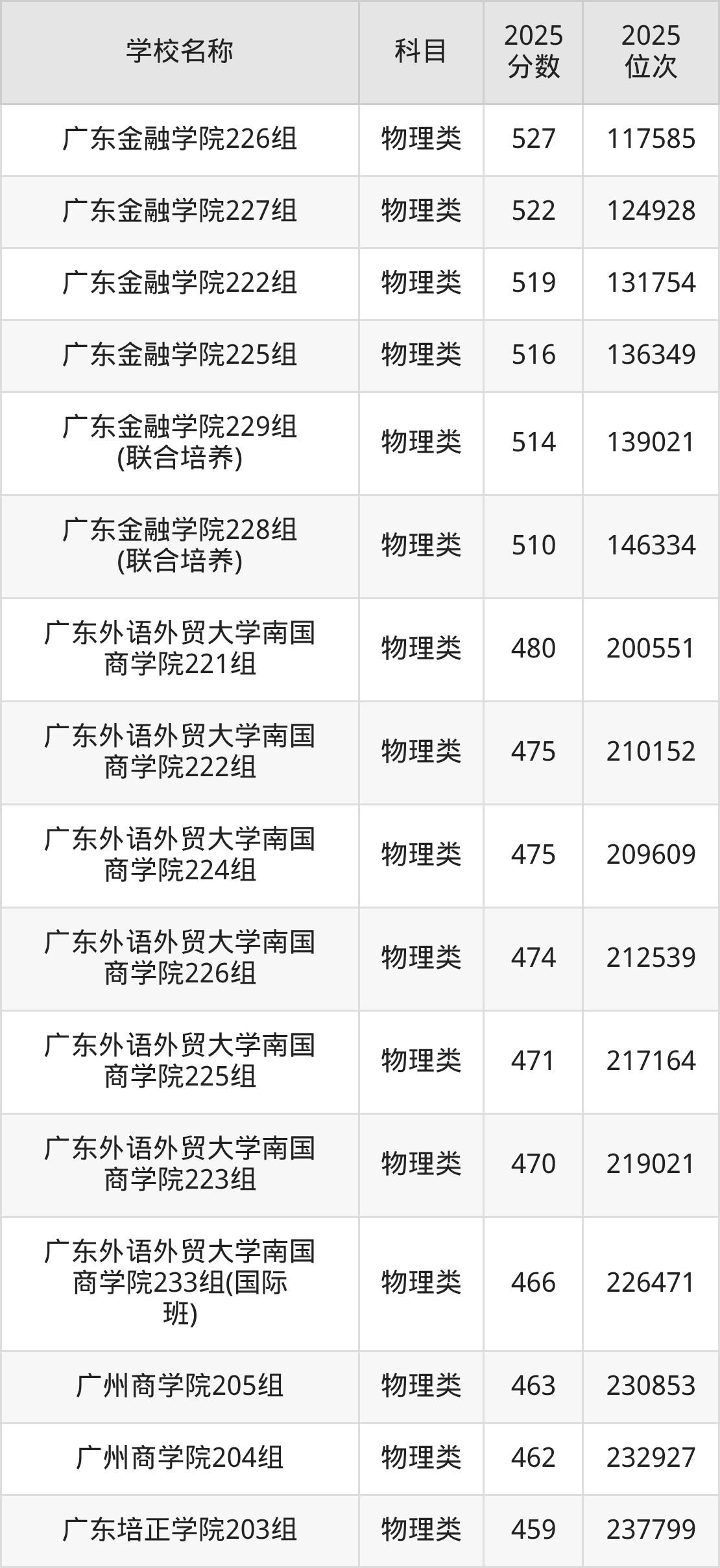 下文为2025年广东省财经类大学在广东物理类录取分数线和位次排名表,供大家参考: