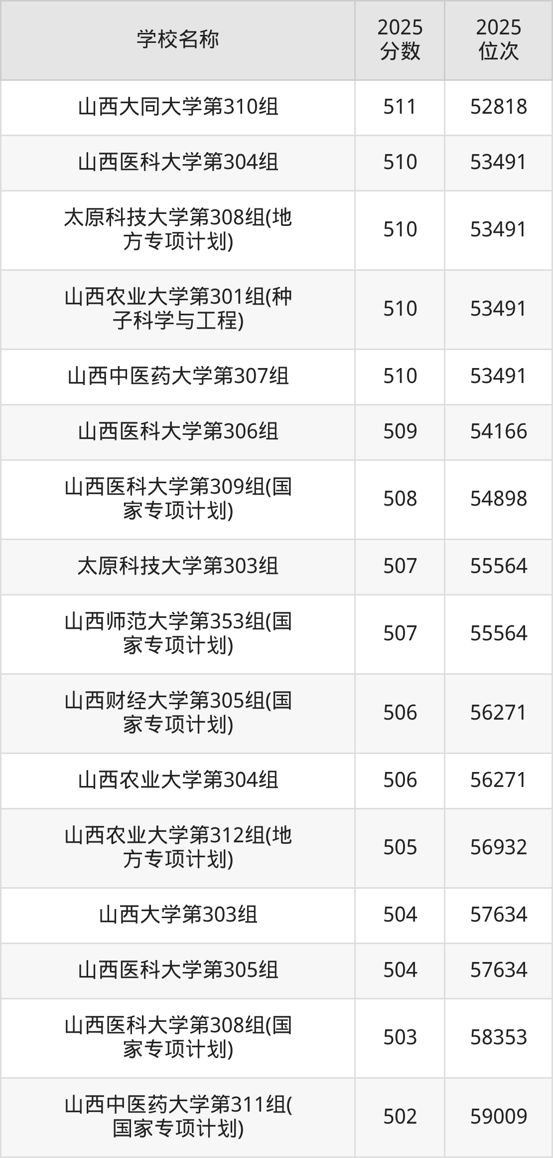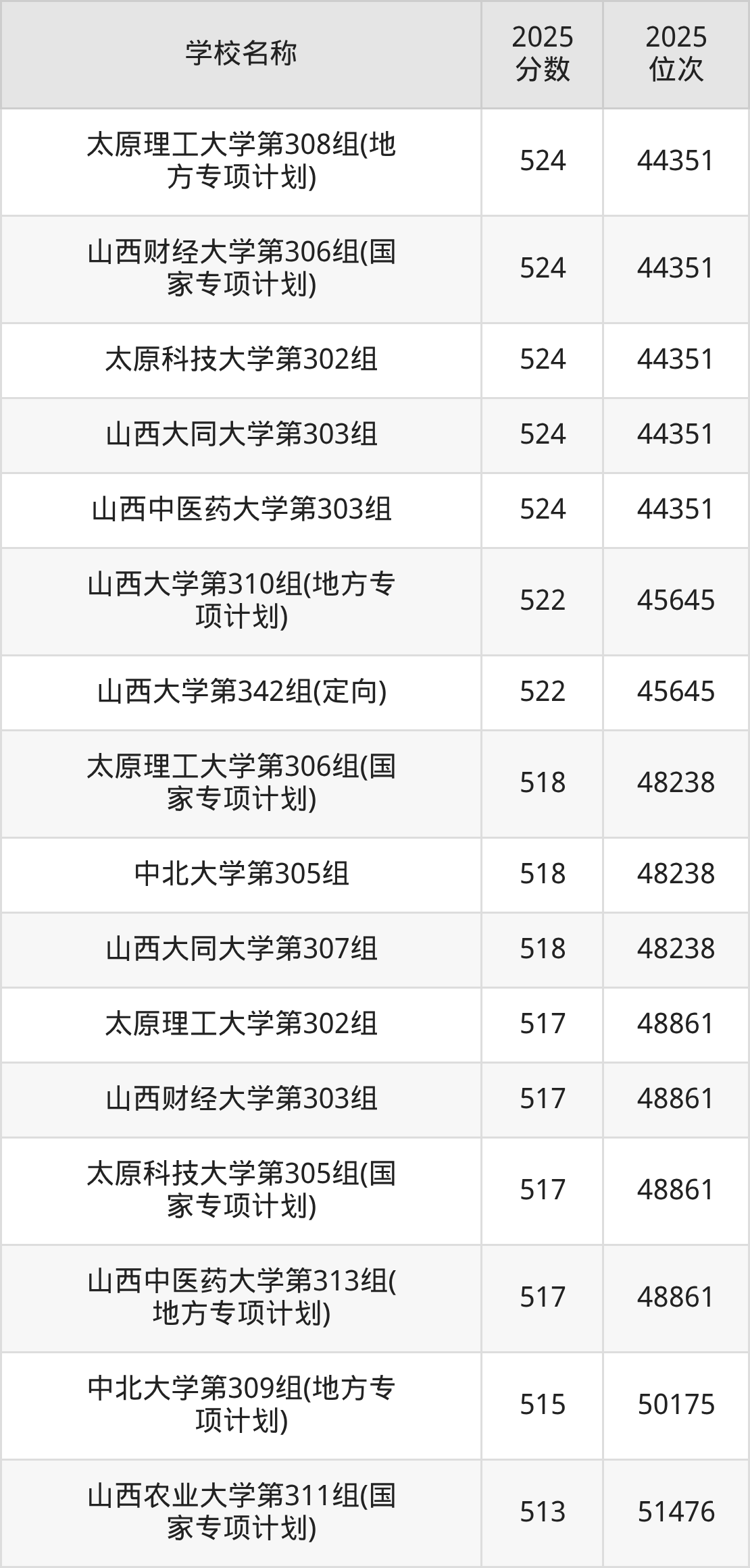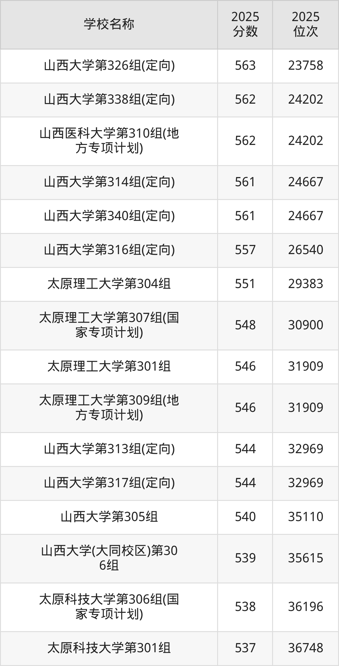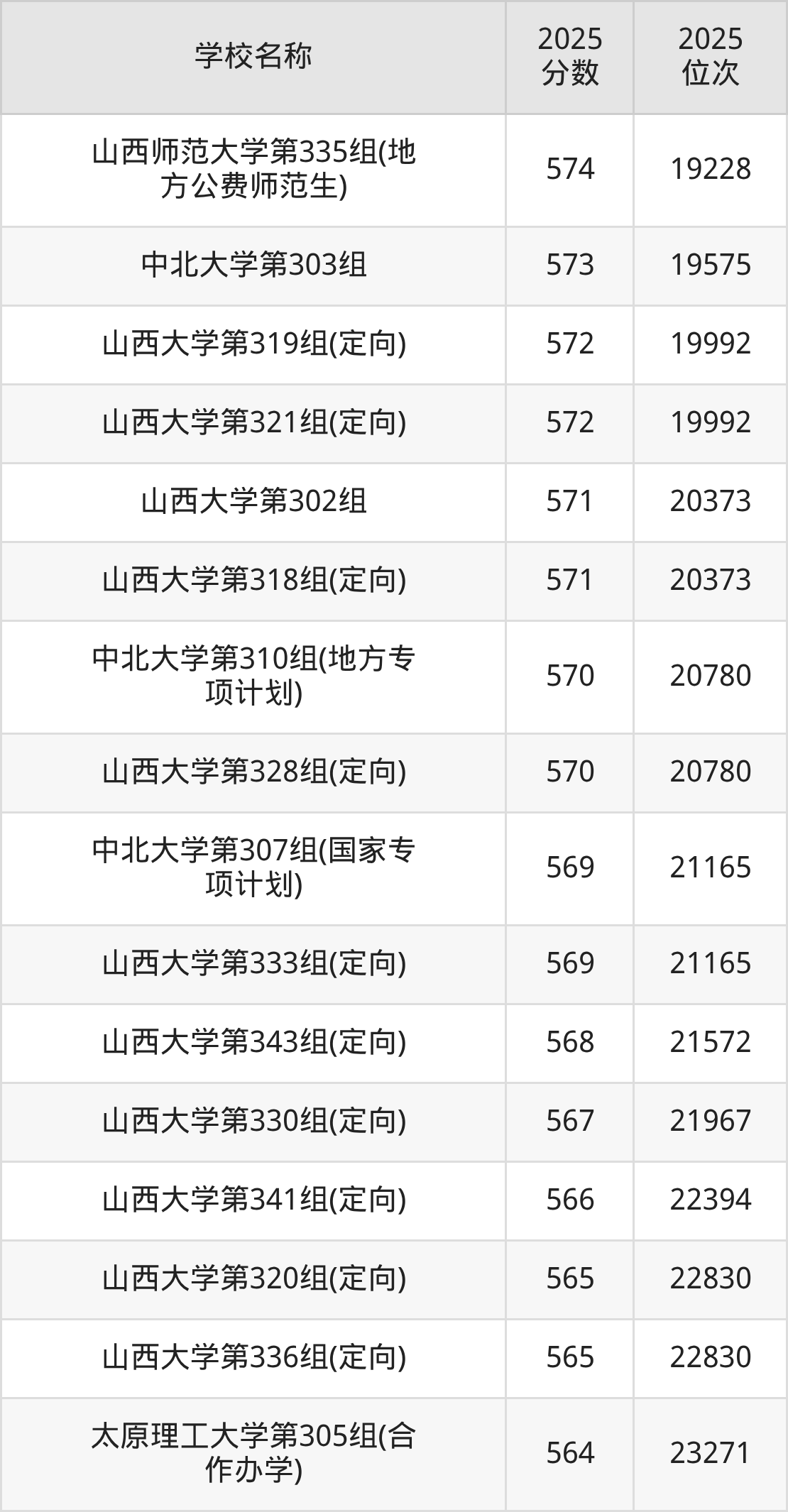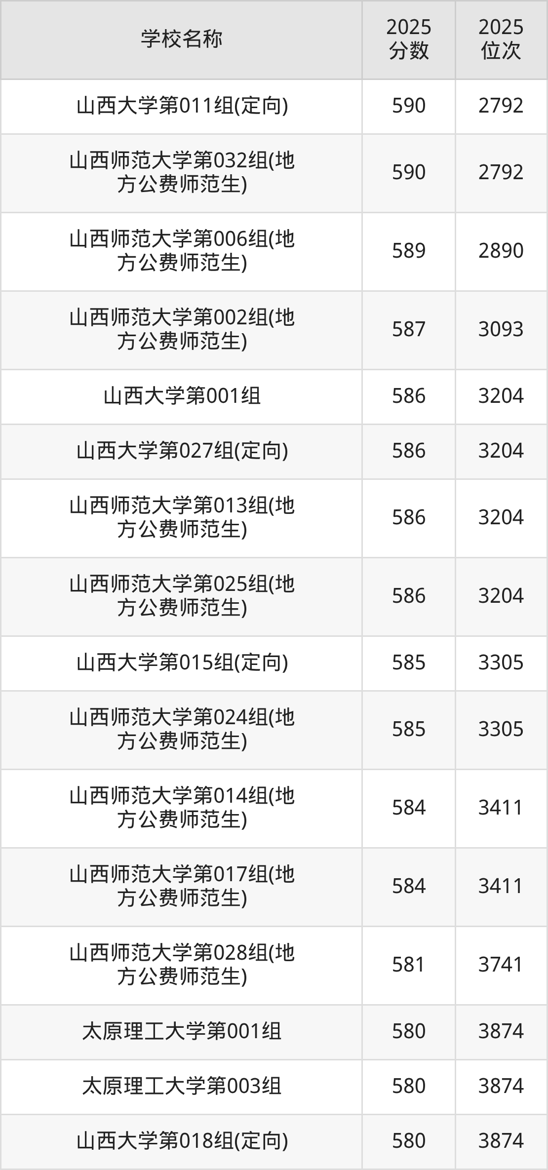 下文为2025年山西省一本大学在山西历史类录取分数线和位次排名表,供大家参考: