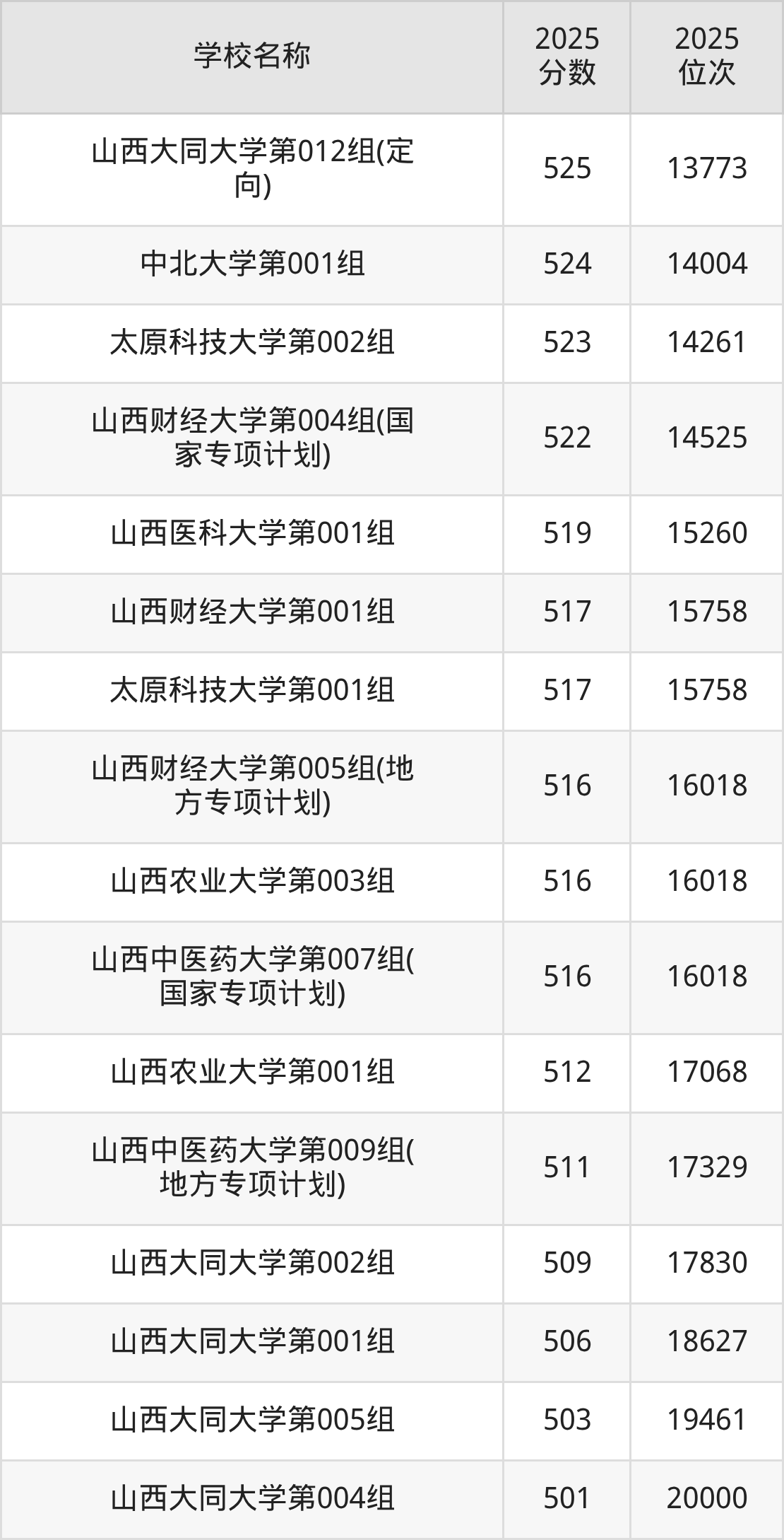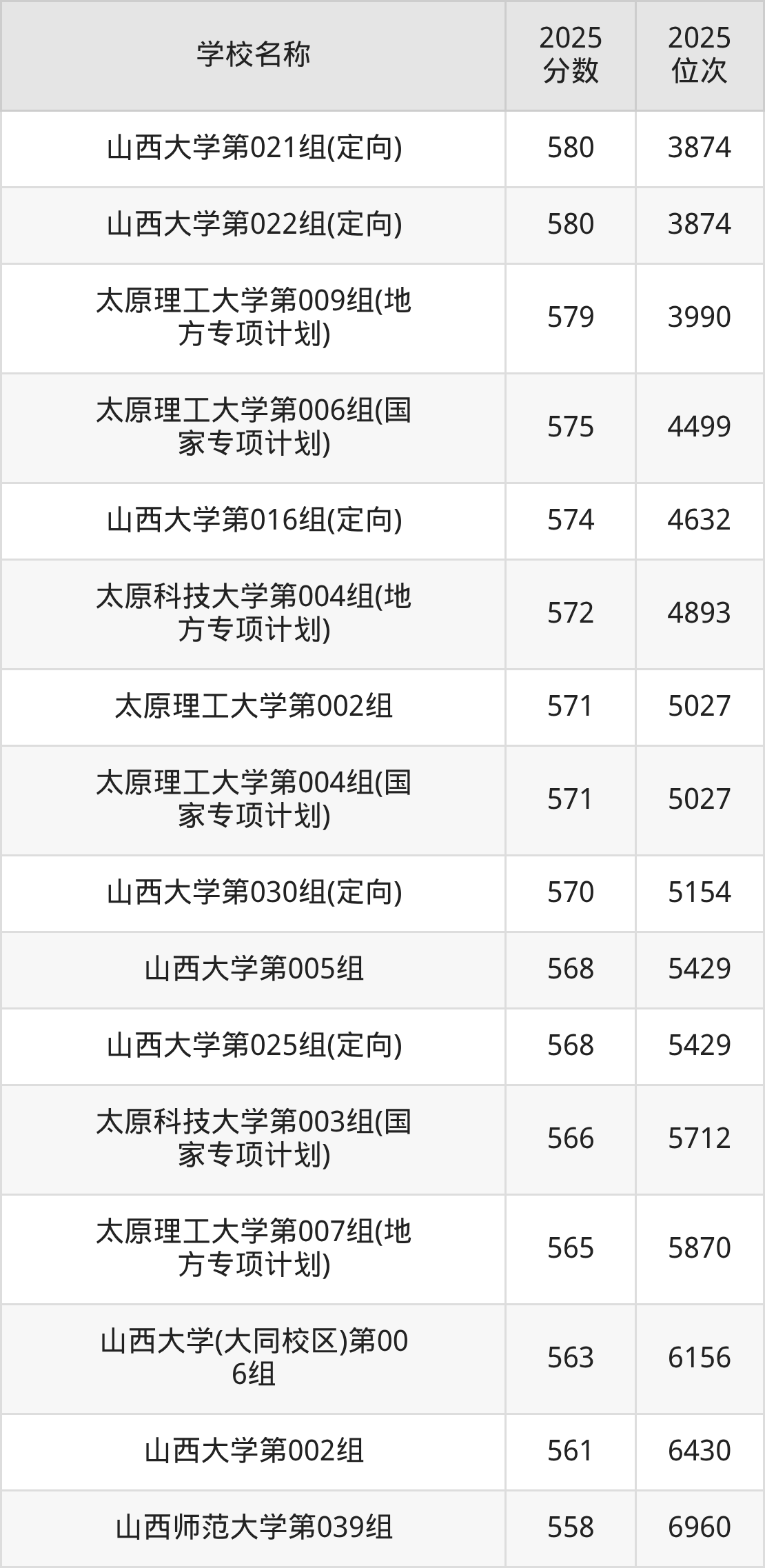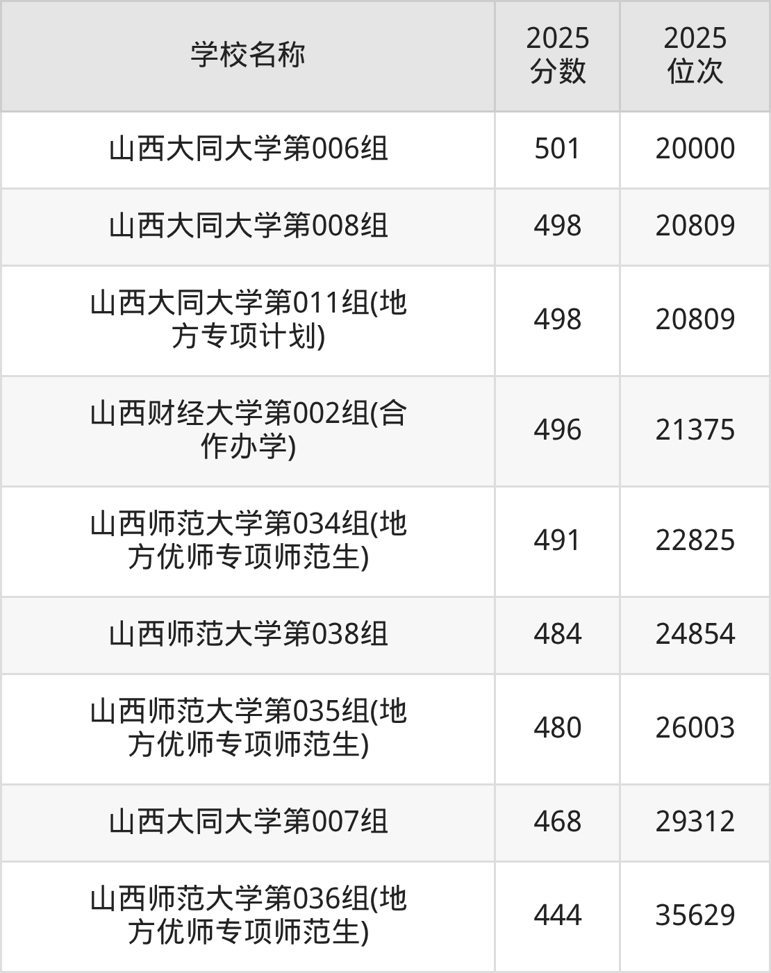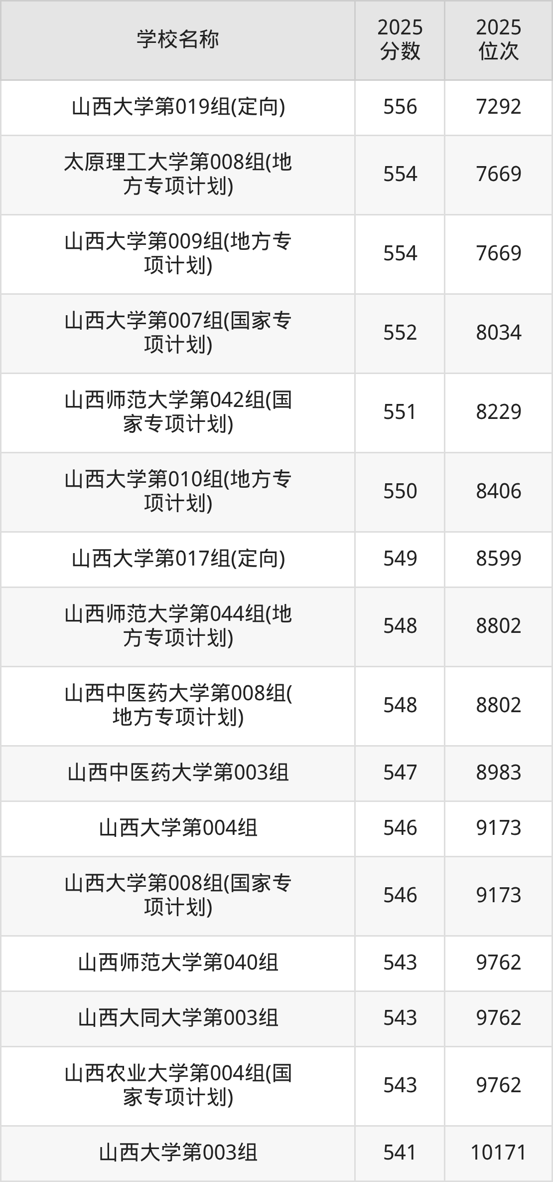 下文为2025年山西省一本大学在山西历史类录取分数线和位次排名表,供大家参考: