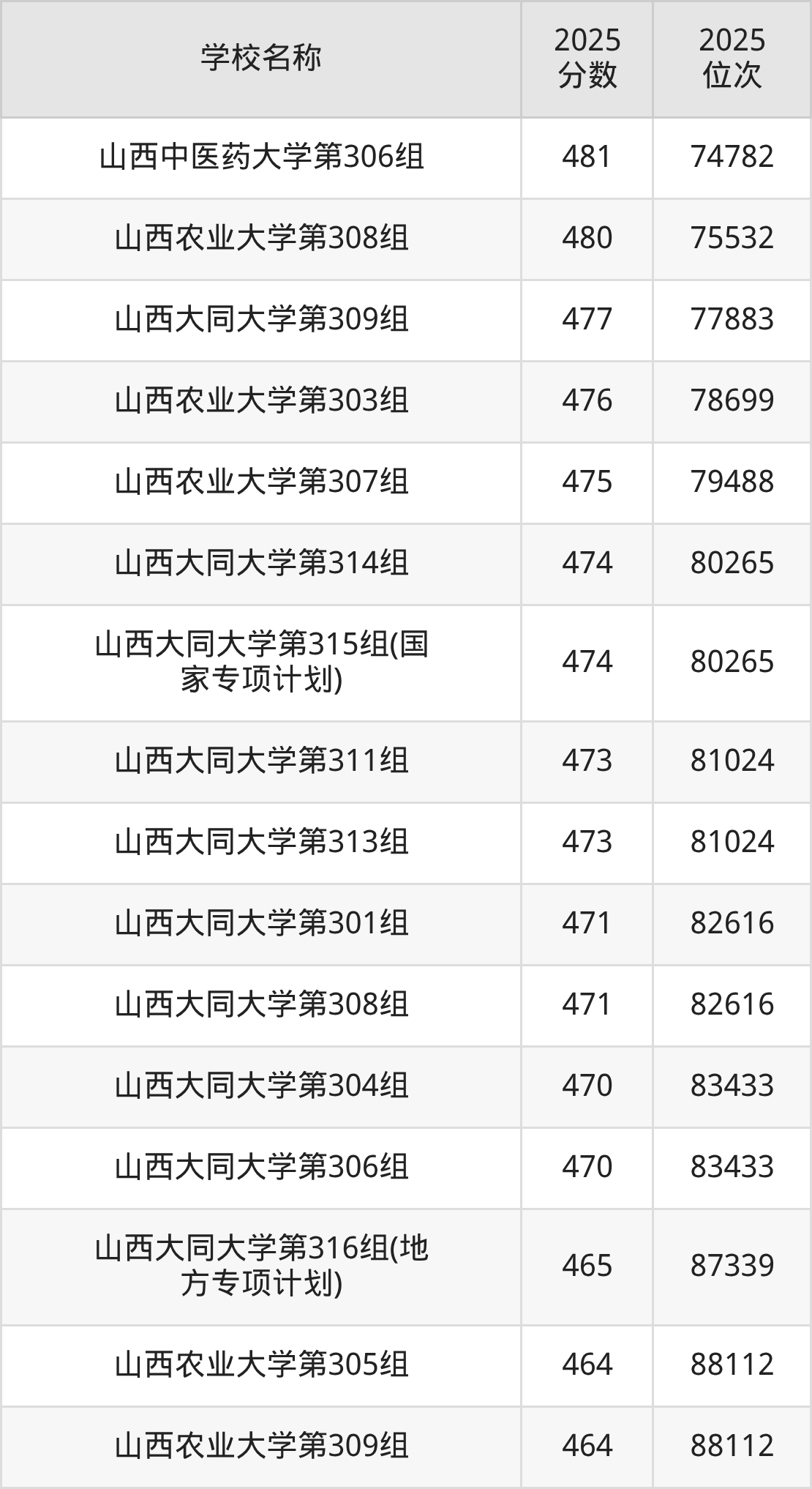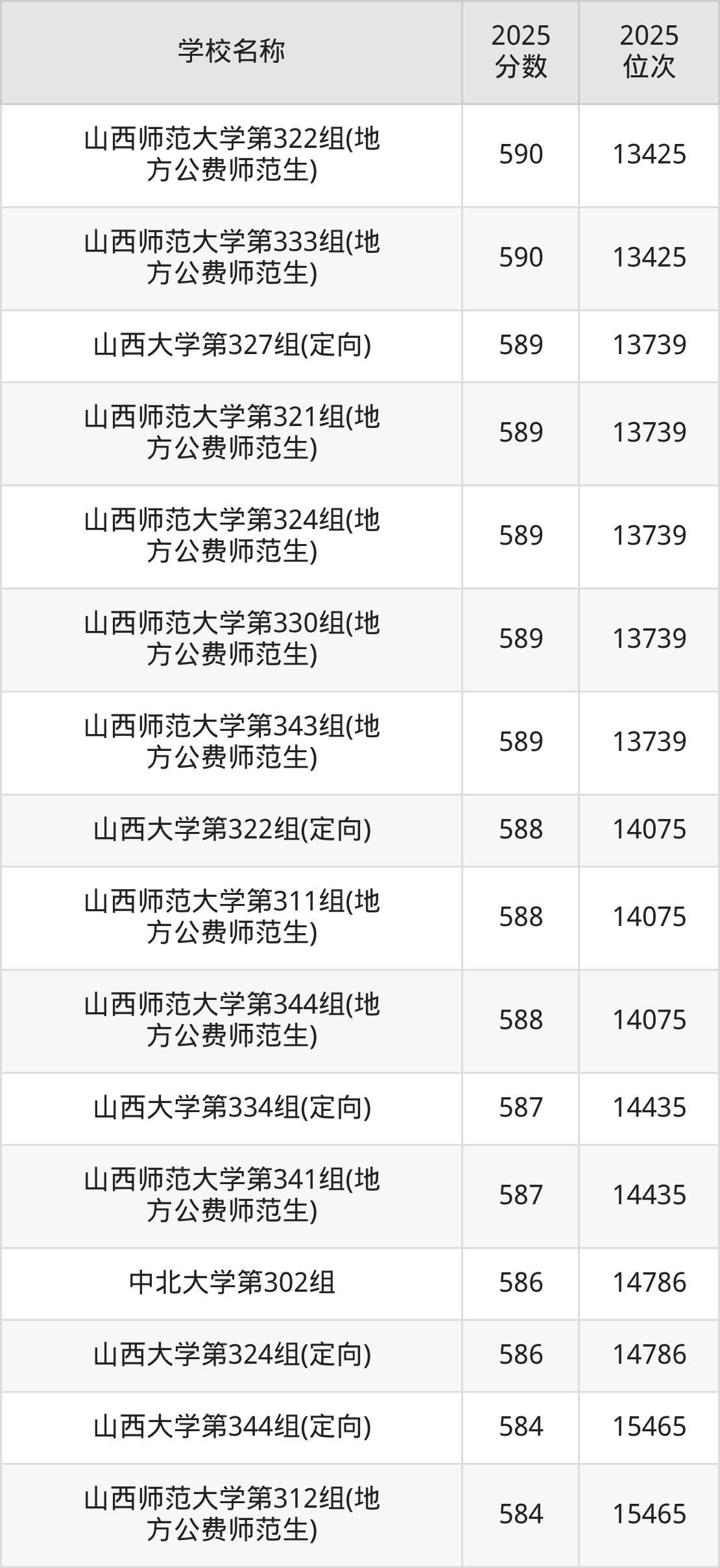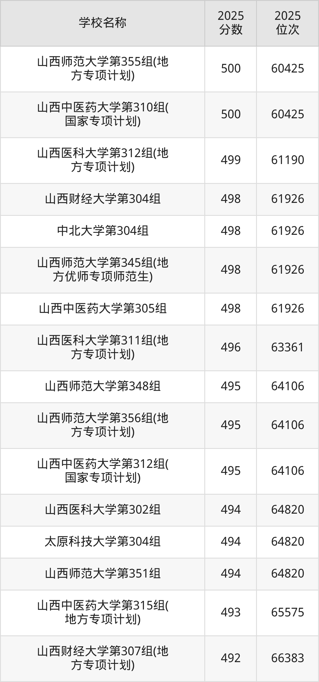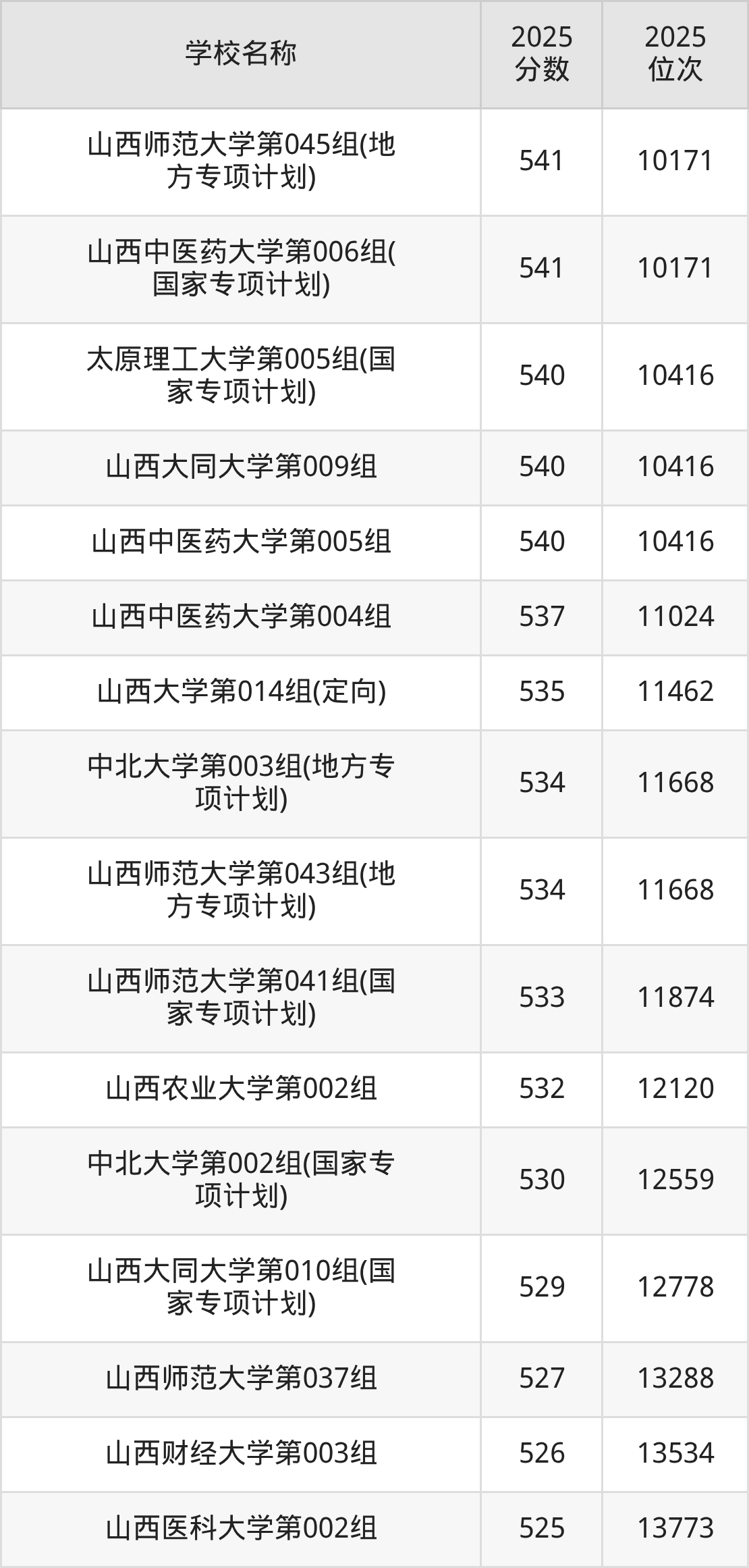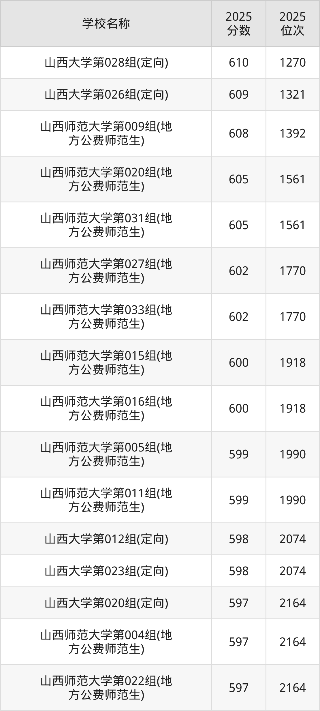 下文为2025年山西省一本大学在山西历史类录取分数线和位次排名表,供大家参考: