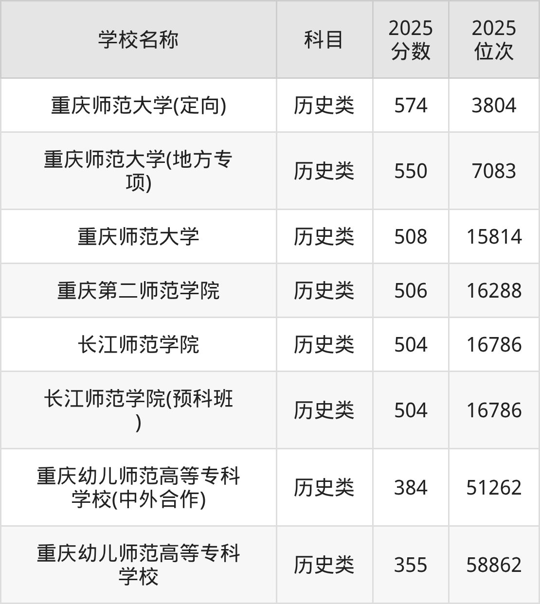 下文为2025年重庆市师范类大学在重庆历史类录取分数线和位次排名表,供大家参考: