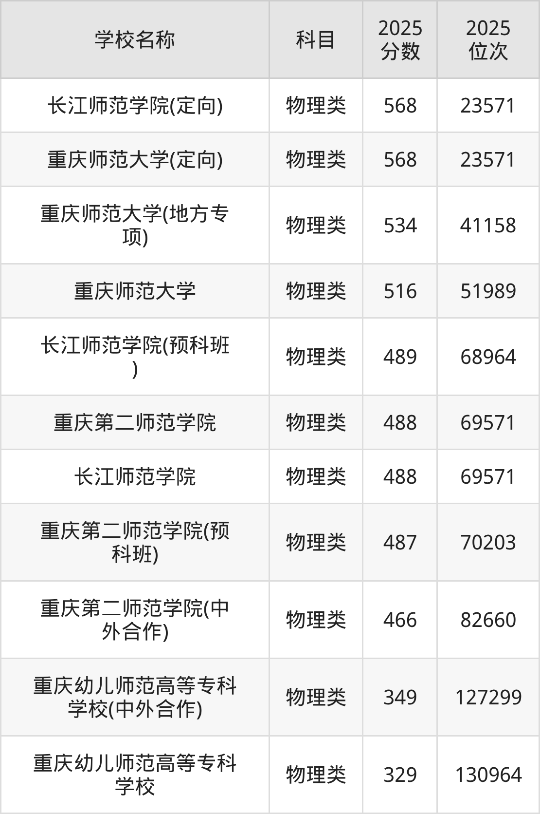 下文为2025年重庆市师范类大学在重庆物理类录取分数线和位次排名表,供大家参考: