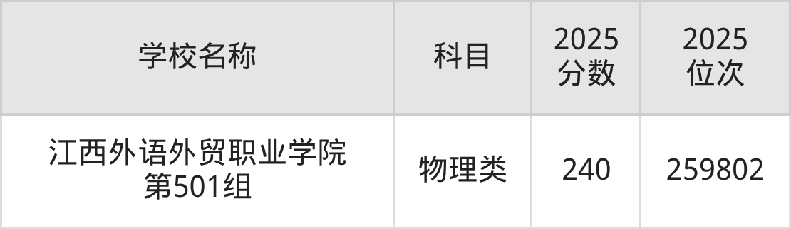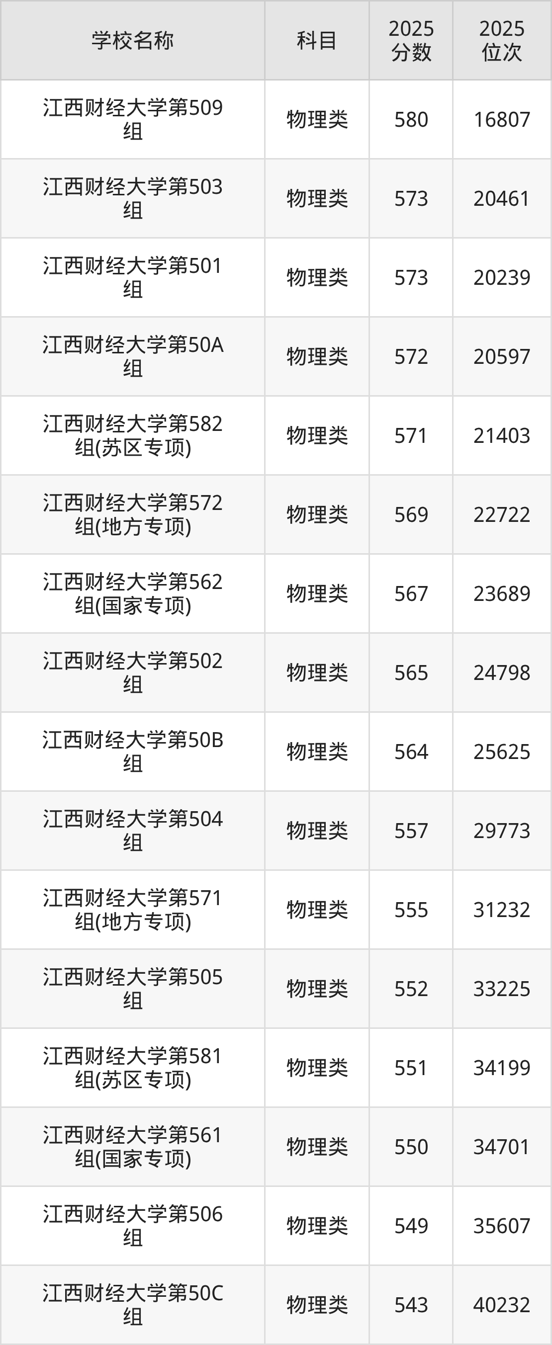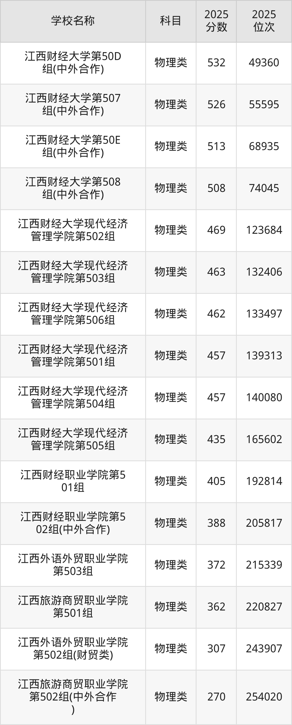下文为2025年江西省财经类大学在江西物理类录取分数线和位次排名表,供大家参考:
