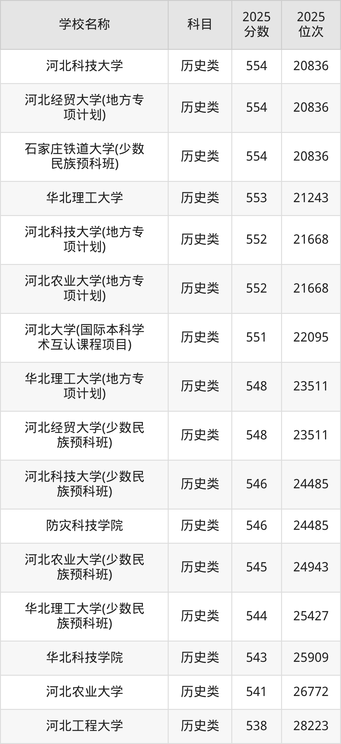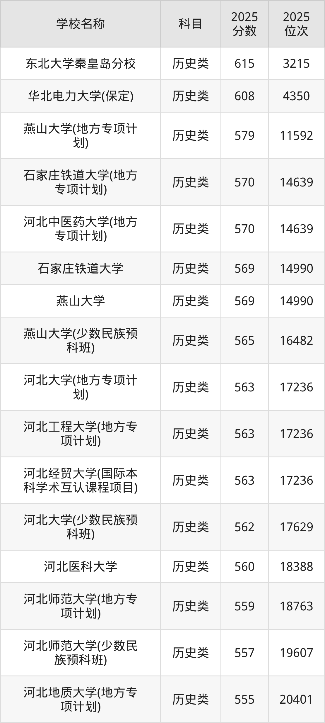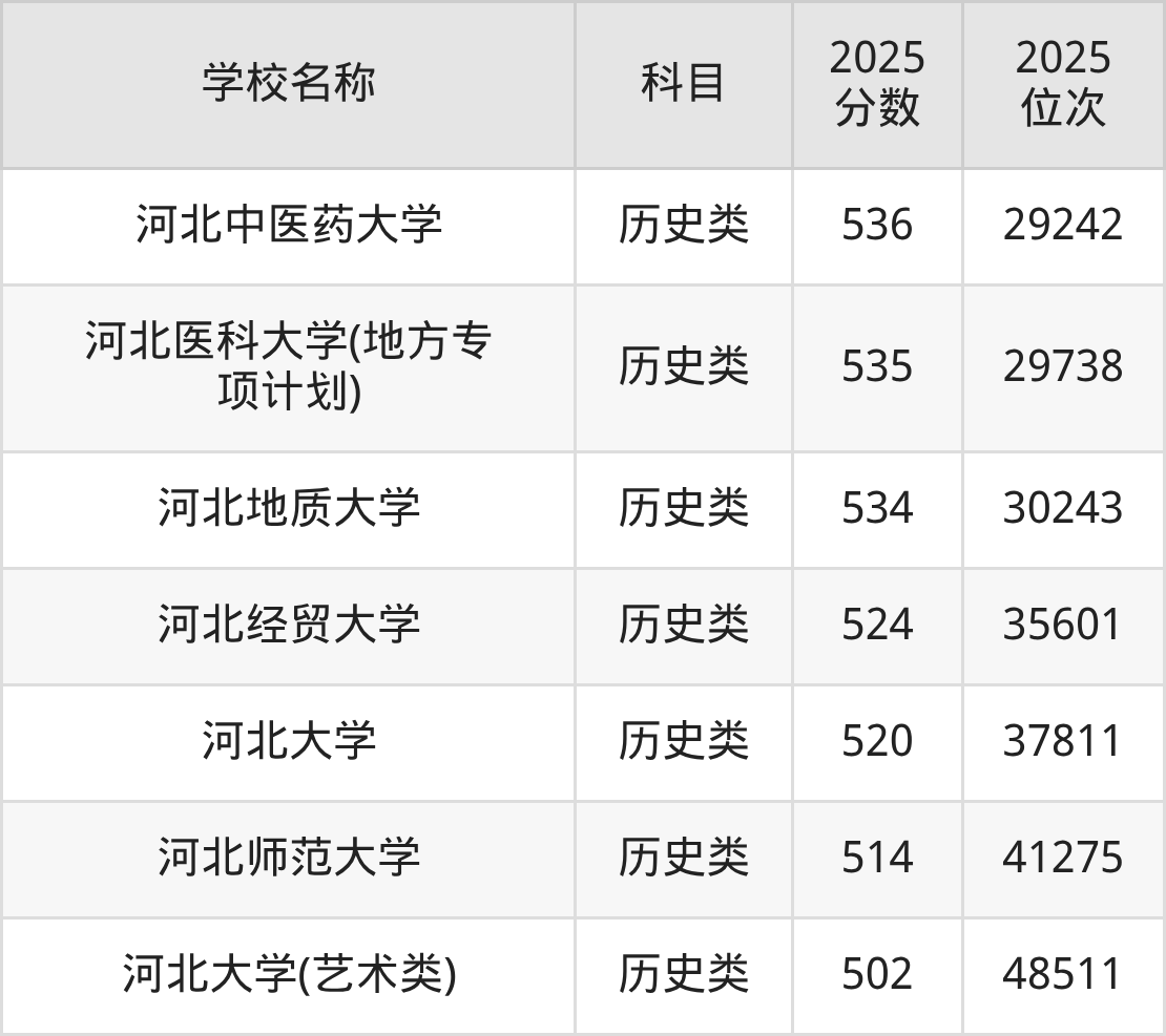 下文为2025年河北省一本大学在河北历史类录取分数线和位次排名表,供大家参考: