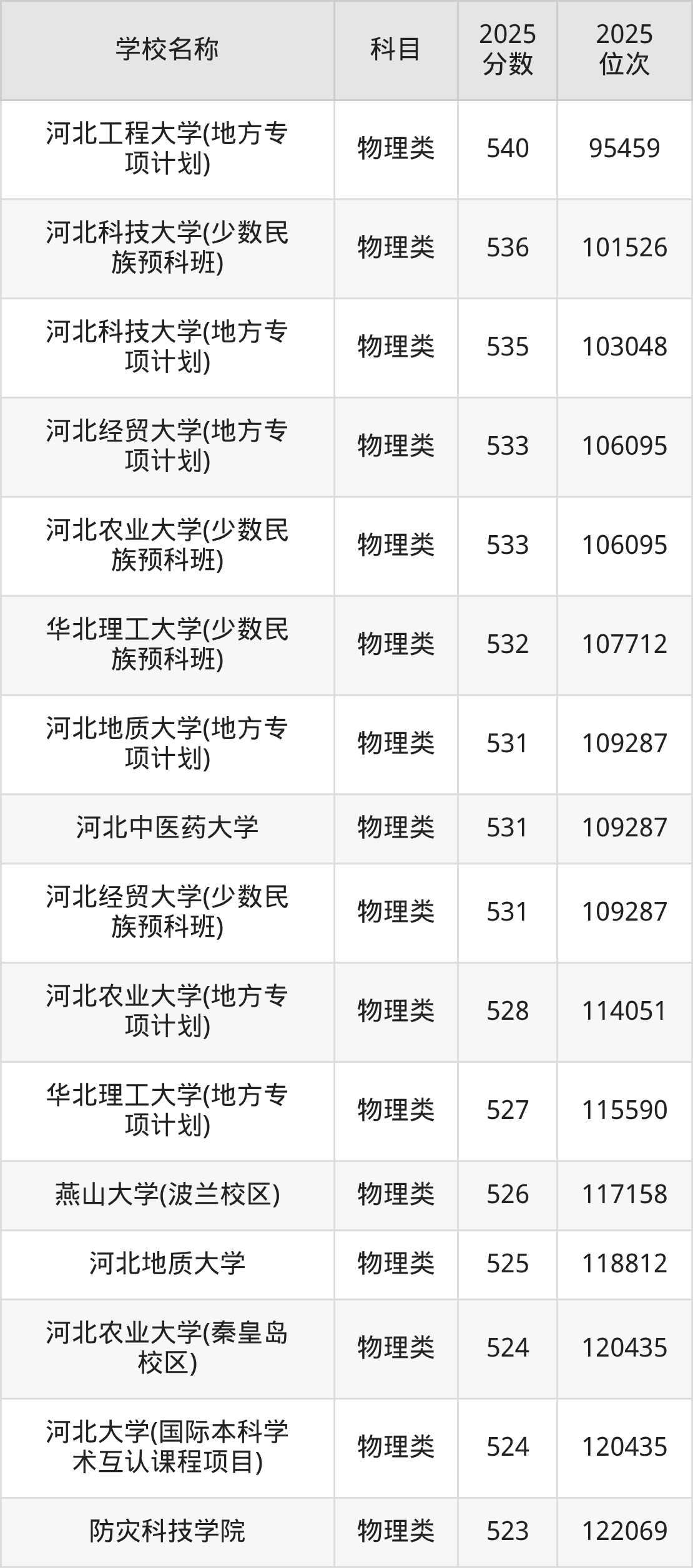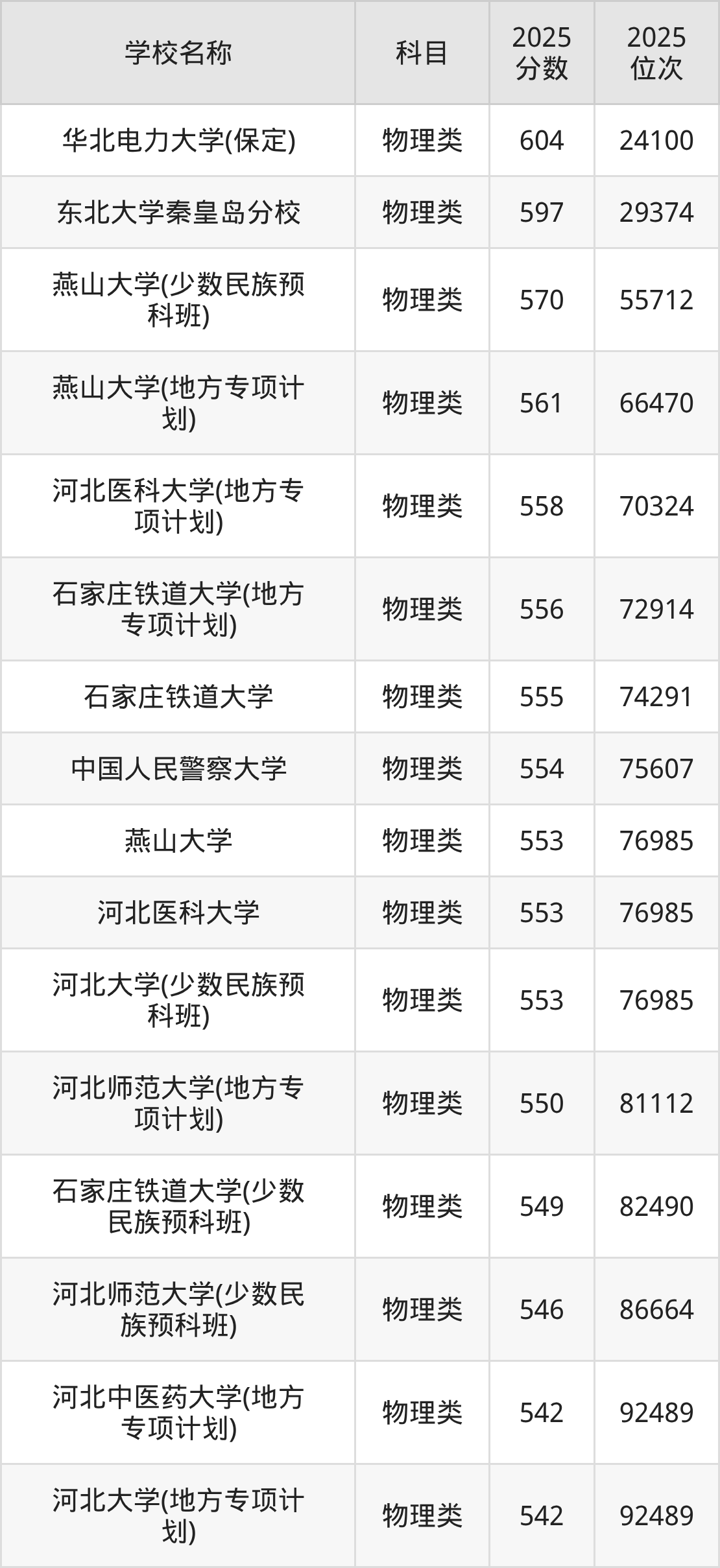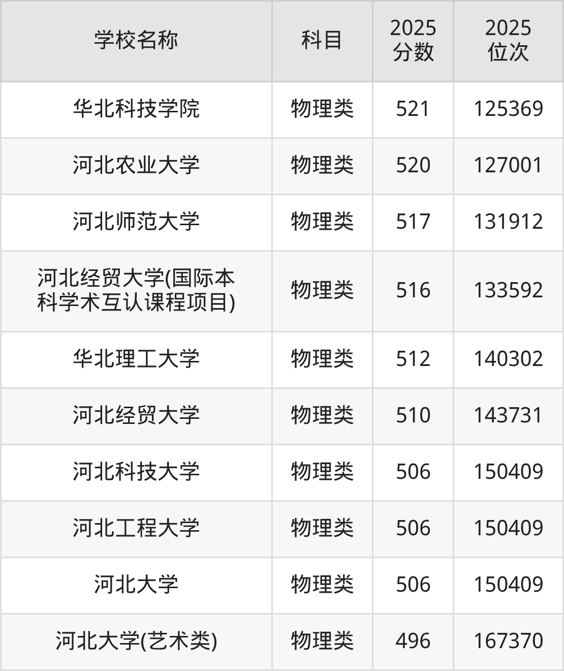 下文为2025年河北省一本大学在河北物理类录取分数线和位次排名表,供大家参考: