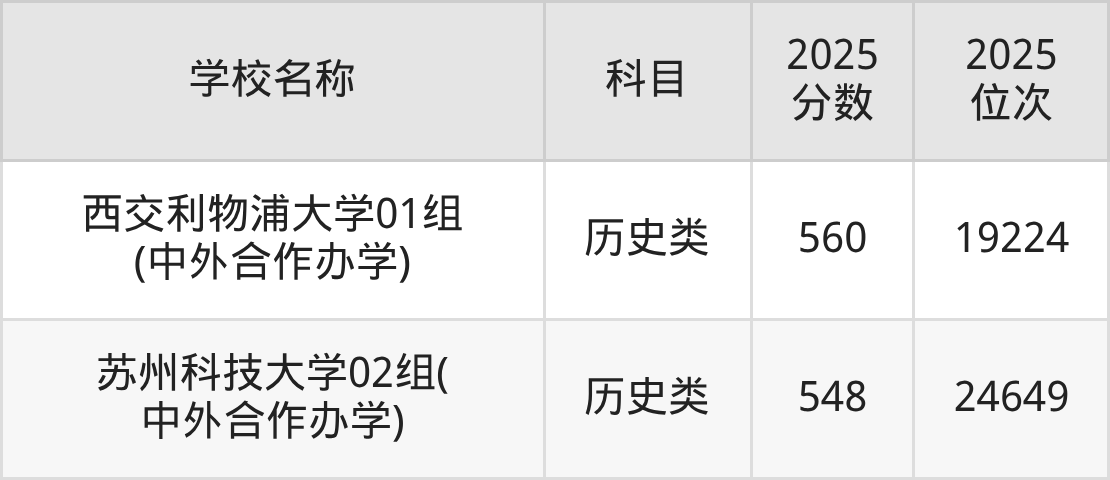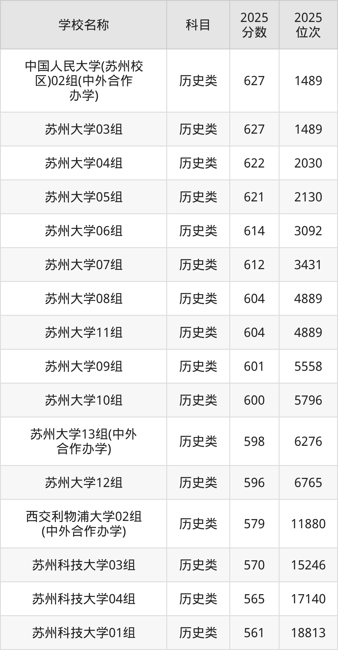 下文为2025年苏州市一本大学在江苏历史类录取分数线和位次排名表,供大家参考: