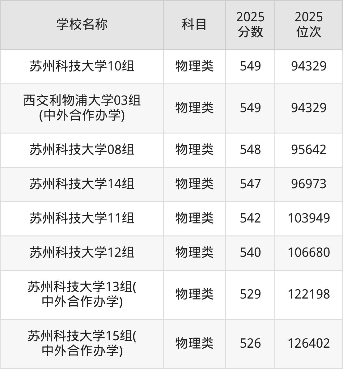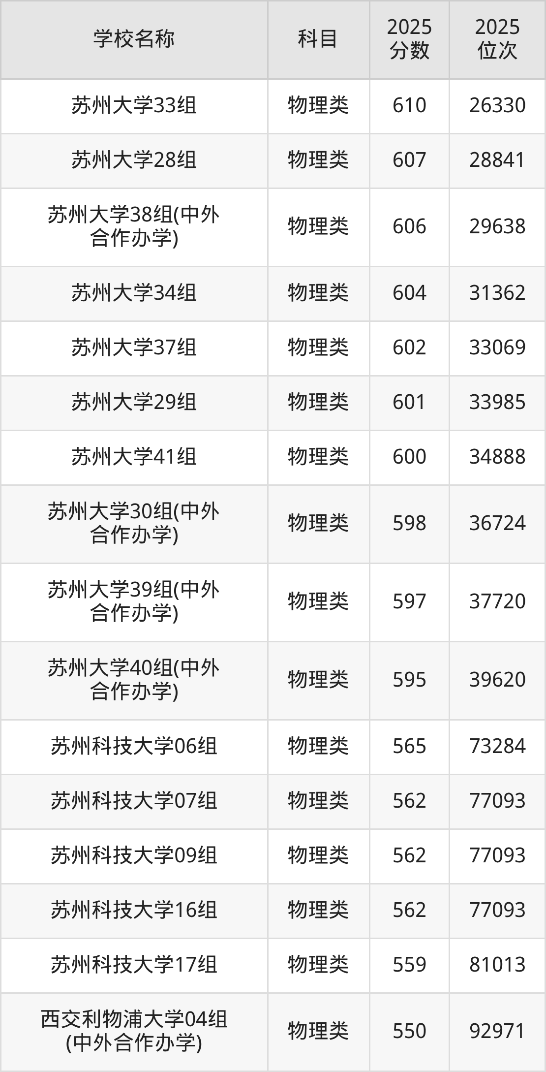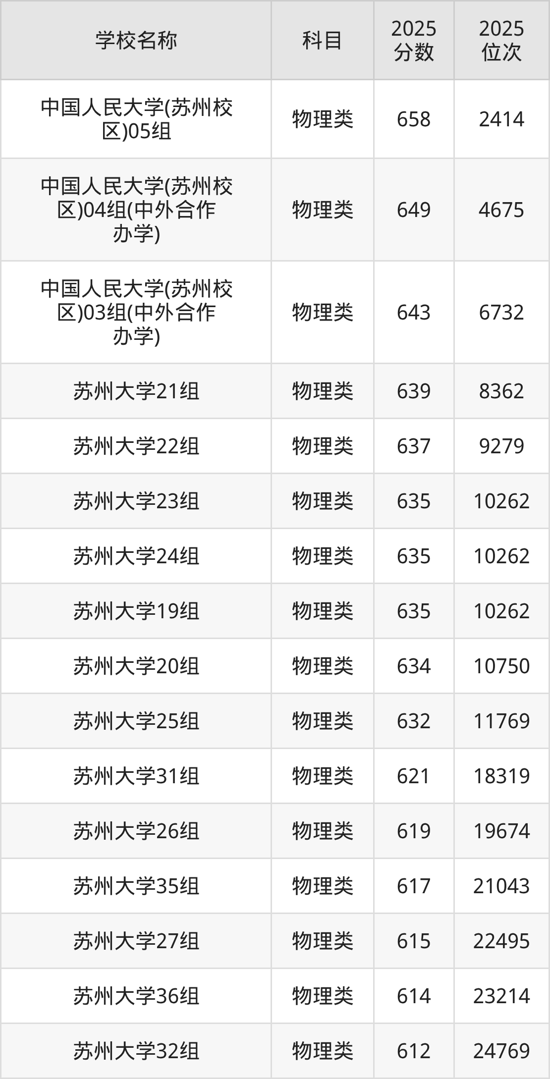 下文为2025年苏州市一本大学在江苏物理类录取分数线和位次排名表,供大家参考: