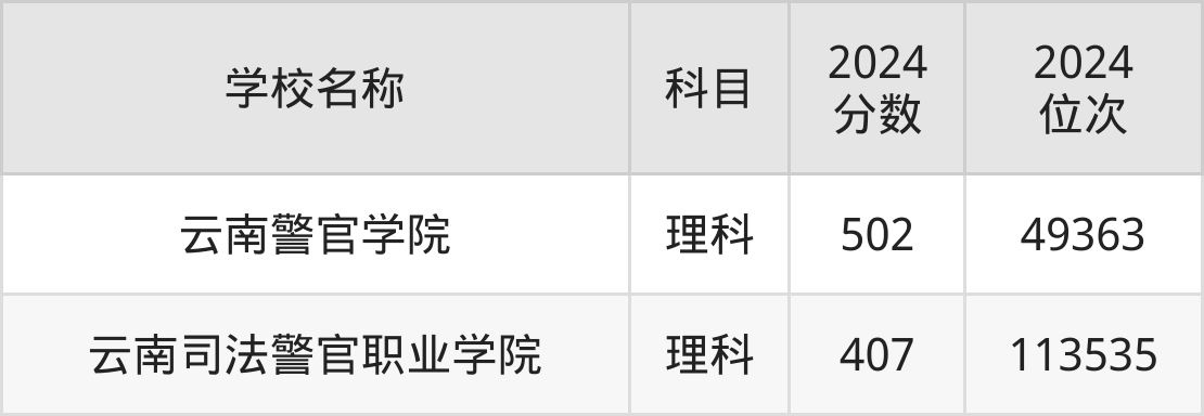 下文为2024年云南省公安警察大学在云南理科录取分数线和位次排名表,供大家参考: