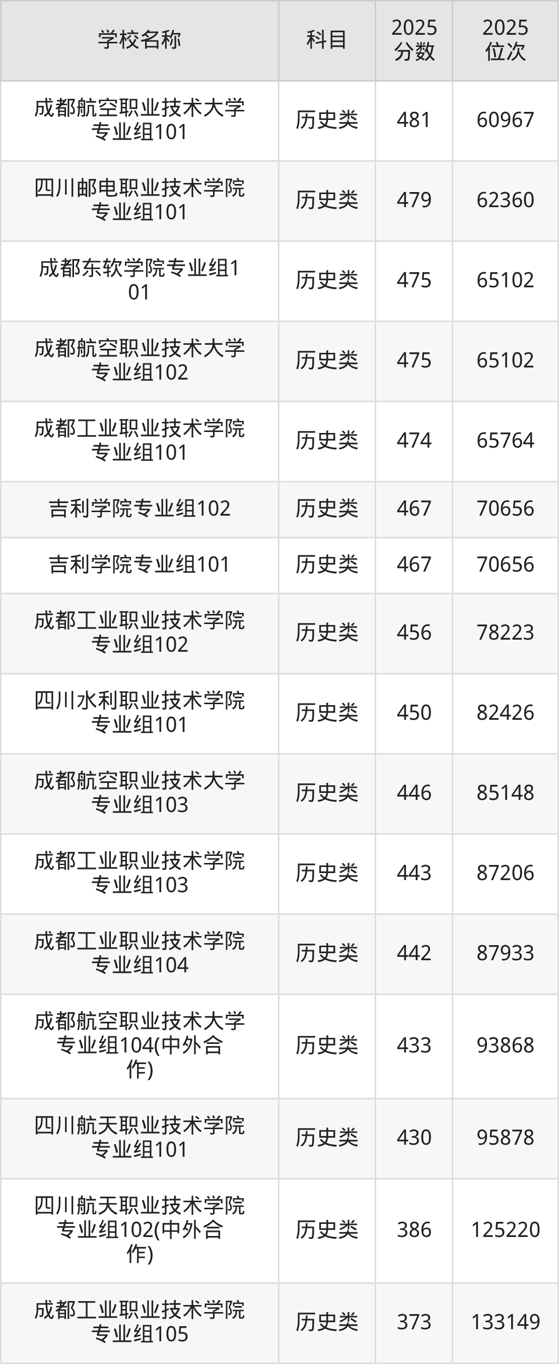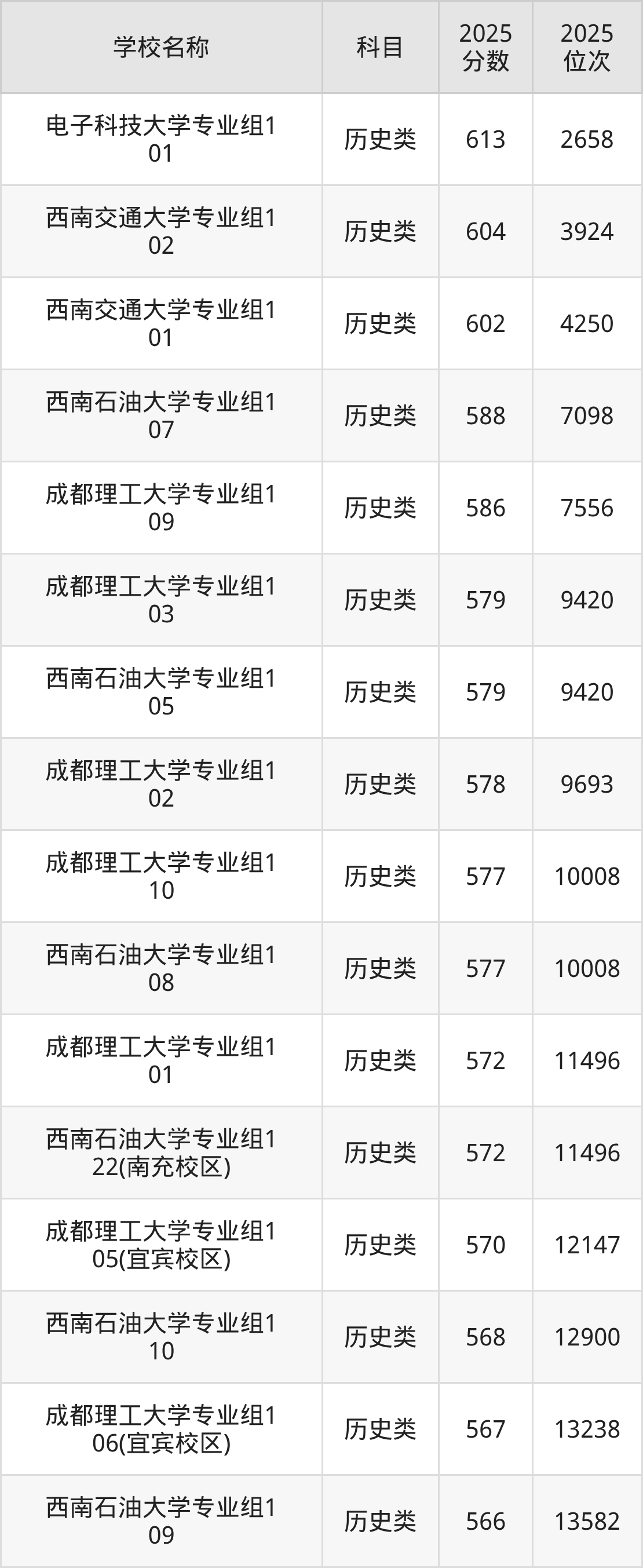 下文为2025年成都市理工类大学在四川历史类录取分数线和位次排名表,供大家参考: