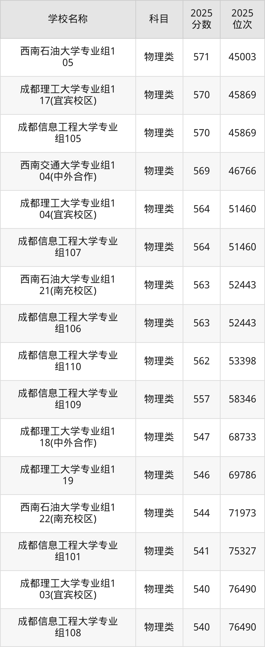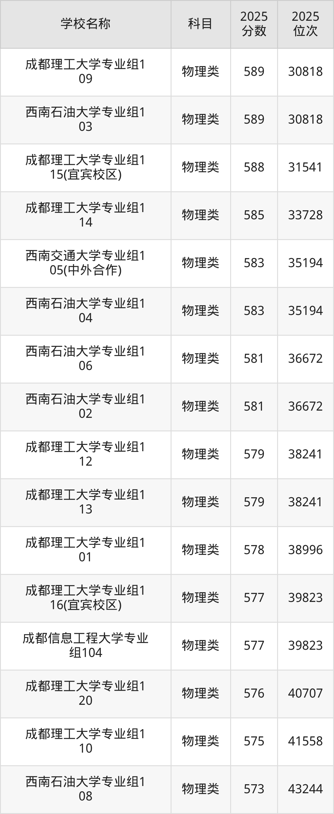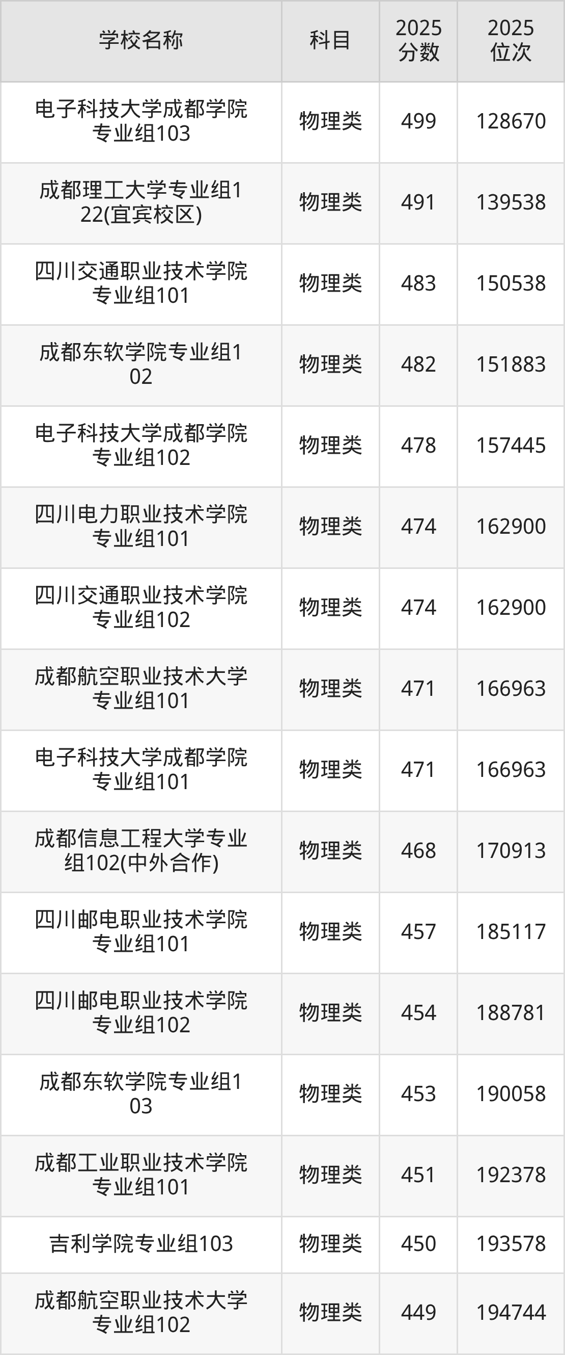 下文为2025年成都市理工类大学在四川物理类录取分数线和位次排名表,供大家参考: