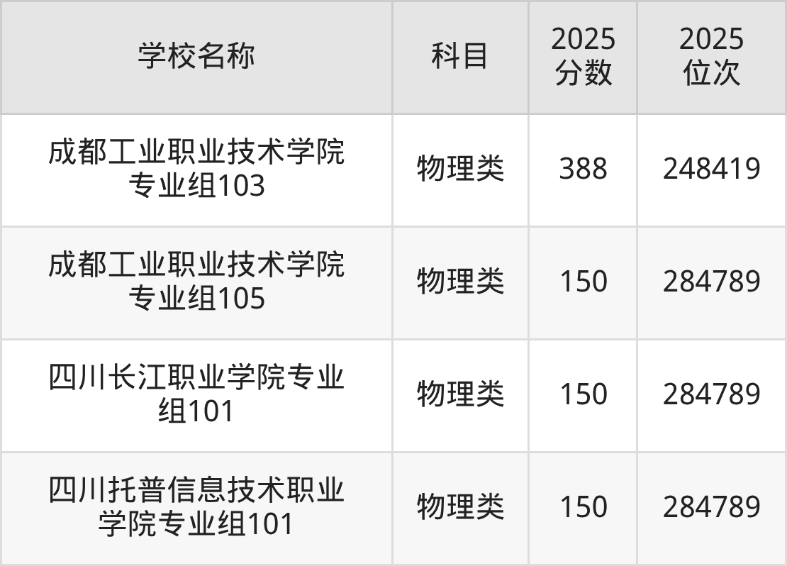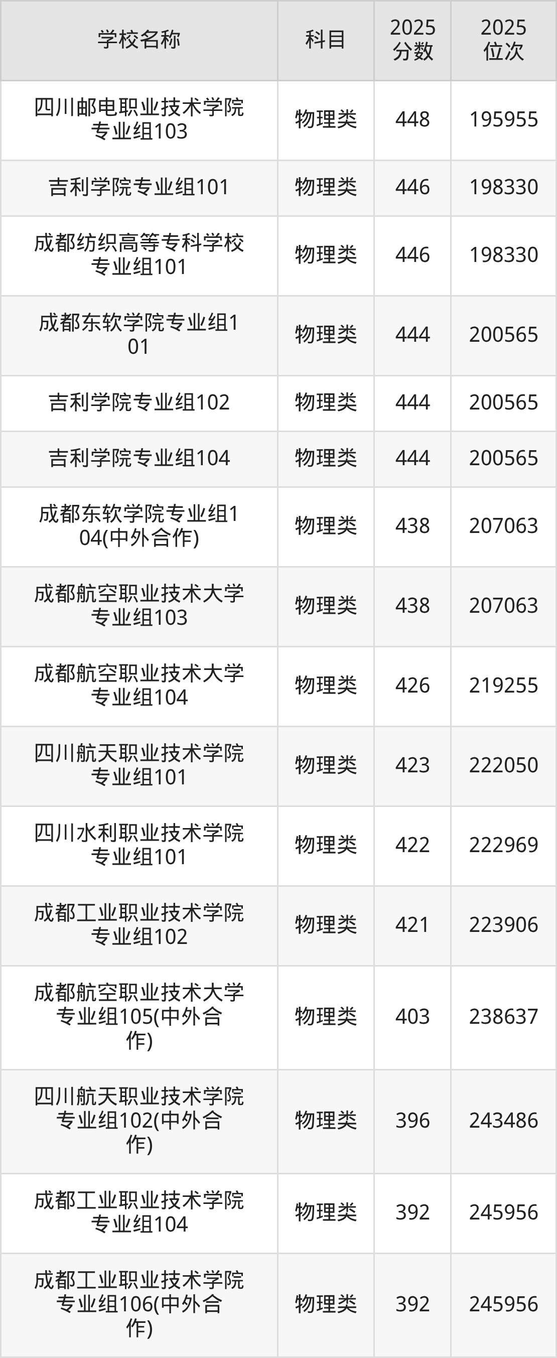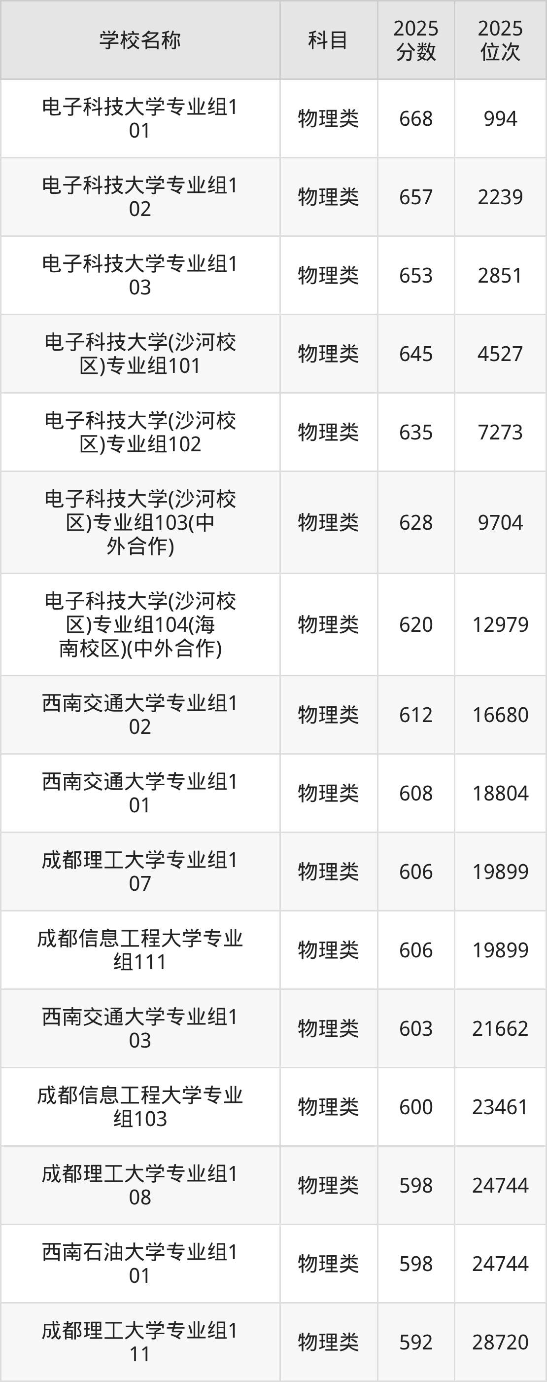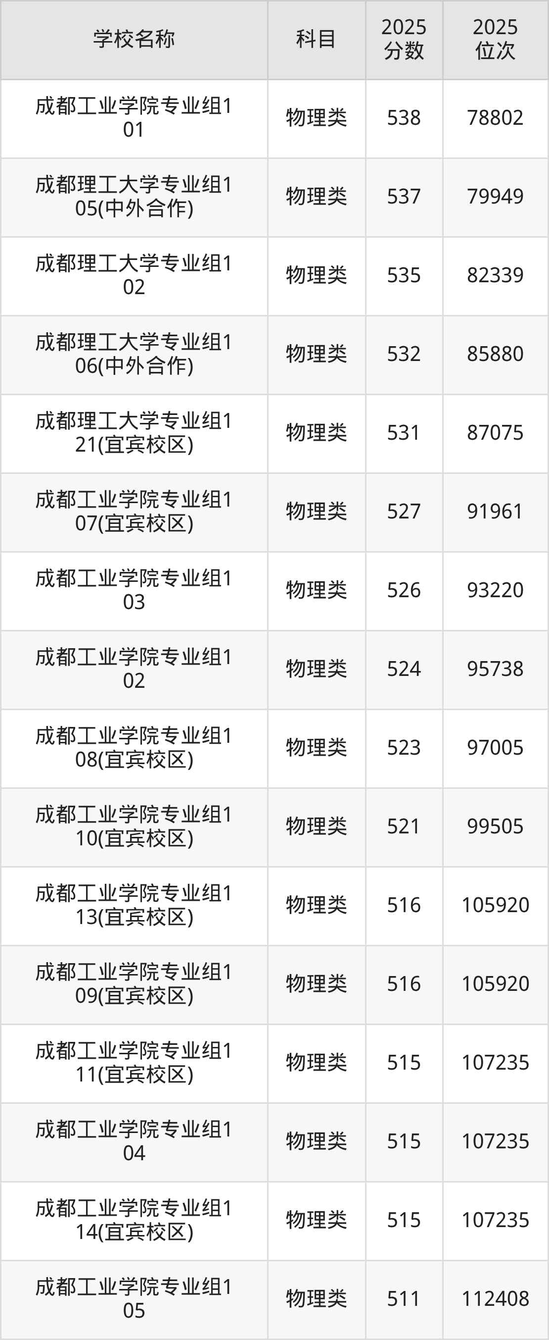 下文为2025年成都市理工类大学在四川物理类录取分数线和位次排名表,供大家参考: