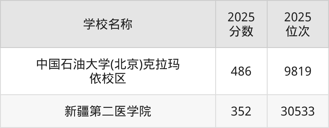 下文为2025年克拉玛依市本科大学在新疆理科录取分数线和位次排名表,供大家参考:
