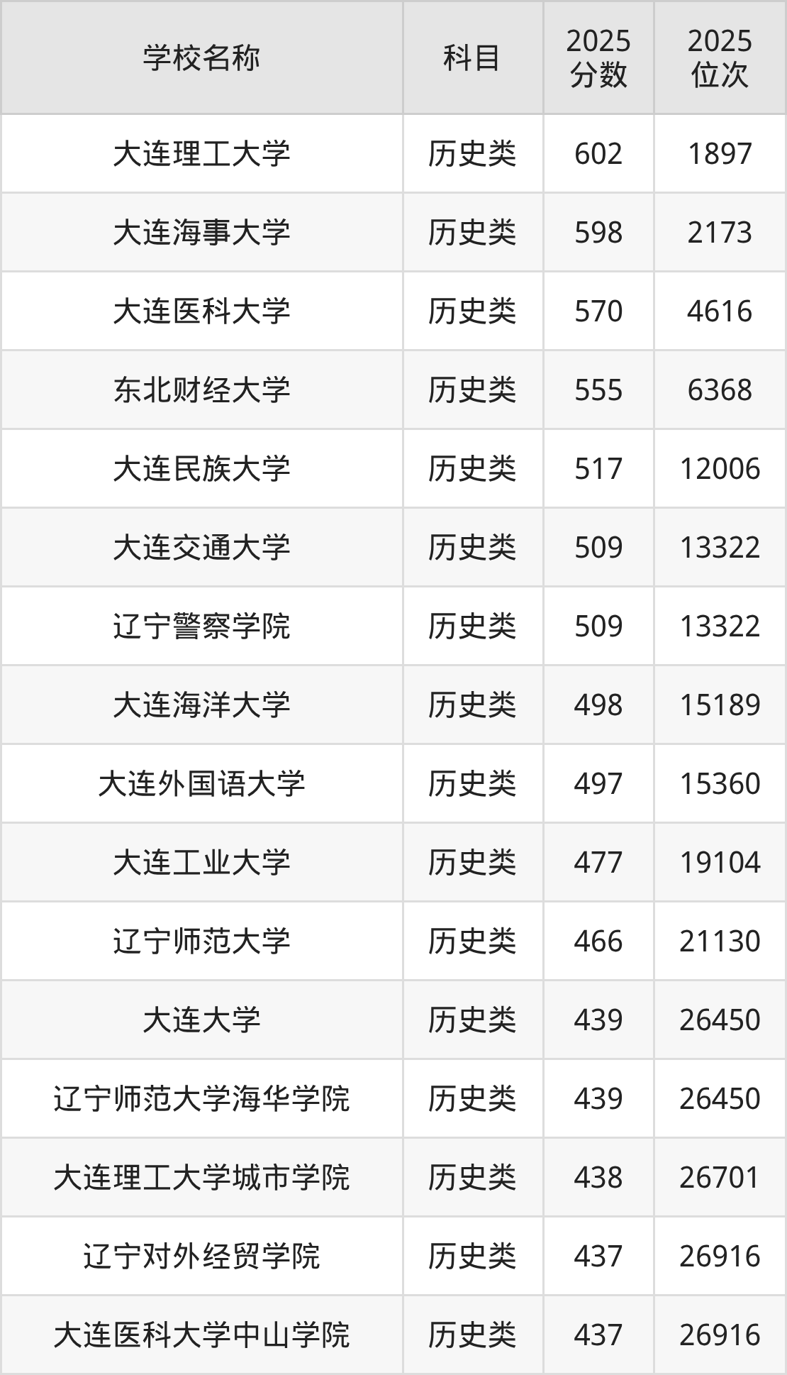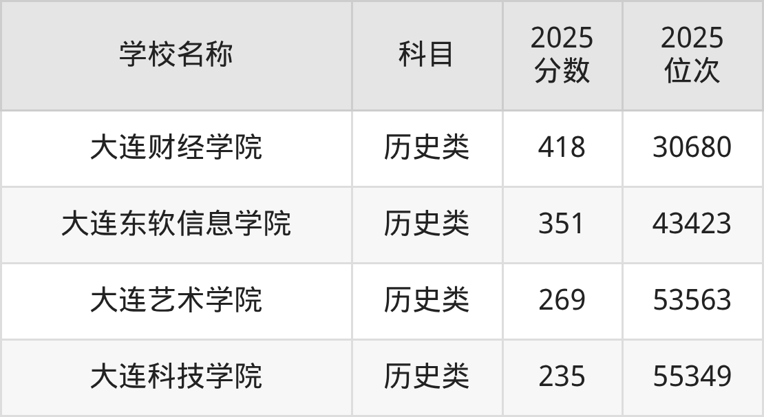 下文为2025年大连市本科大学在辽宁历史类录取分数线和位次排名表,供大家参考: