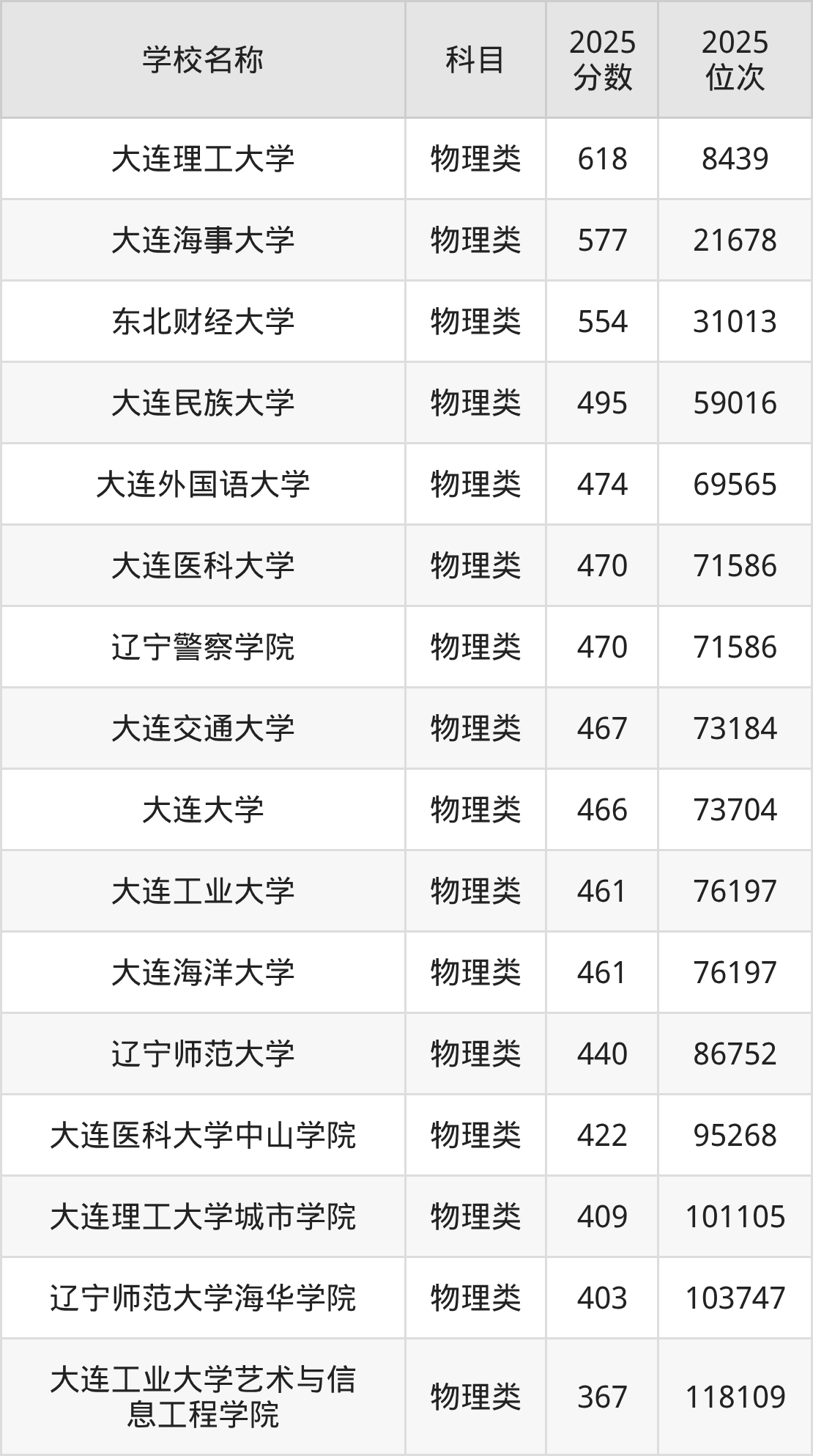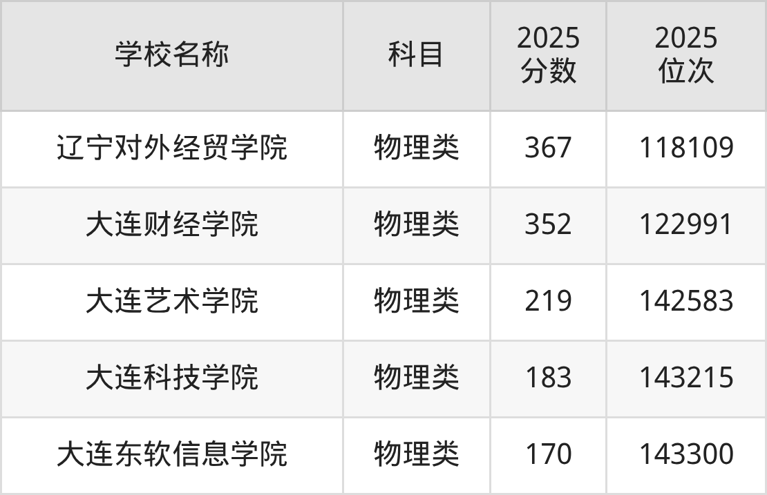 下文为2025年大连市本科大学在辽宁物理类录取分数线和位次排名表,供大家参考: