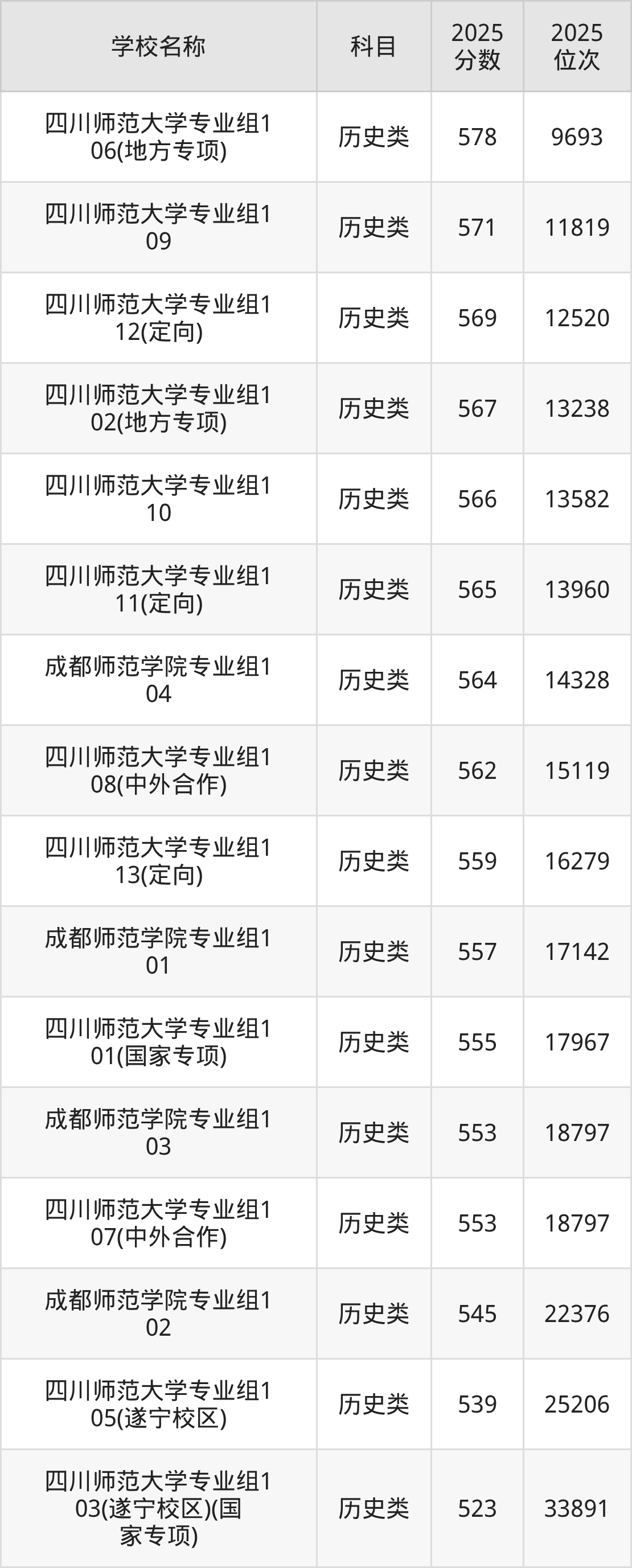 下文为2025年成都市师范类大学在四川历史类录取分数线和位次排名表,供大家参考: