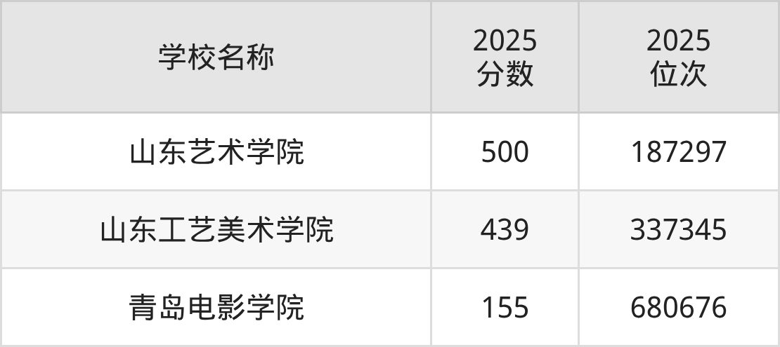 下文为2025年山东省二本艺术大学在山东录取分数线和位次排名表,供大家参考: